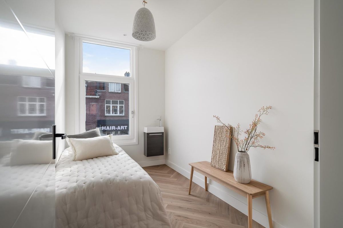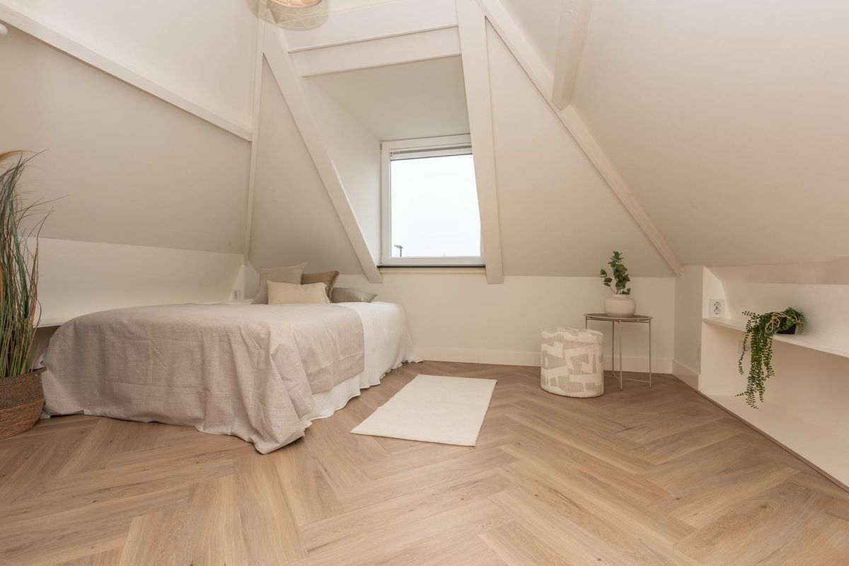 Op de bovengelegen etage bevinden zich twee ruime slaapkamers, beide met voldoende ruimte voor een tweepersoonsbed en garderobekasten. Daarnaast is er een extra kamer, thans in gebruik als keuken, die zich ook uitstekend leent als werkkamer, logeerkamer of speelkamer. Eveneens een moderne badkamer met inloopdouche en wastafelmeubel, een separaat toilet met fontein en een aparte ruimte voor de wasmachine en droger.