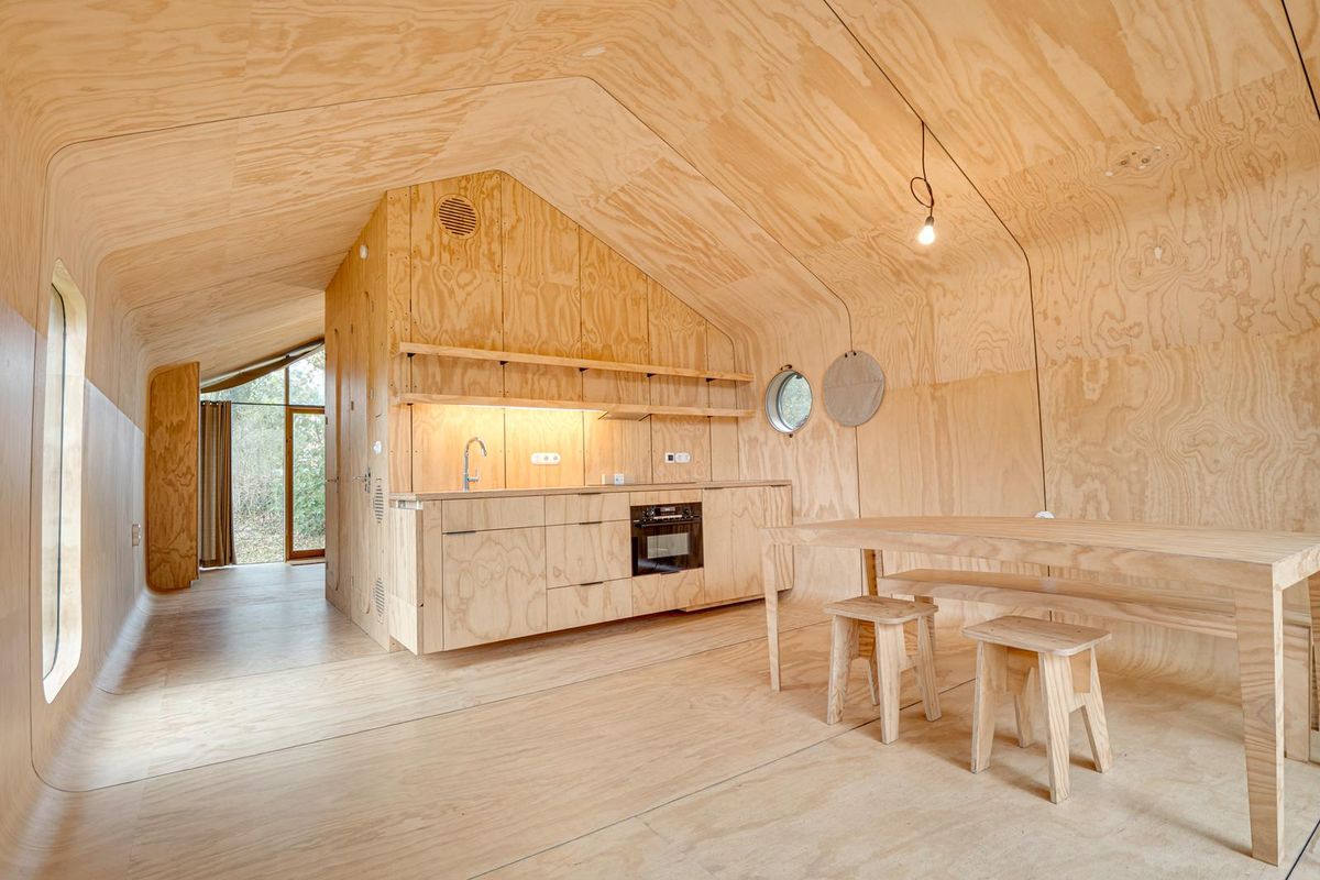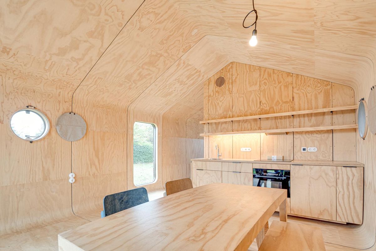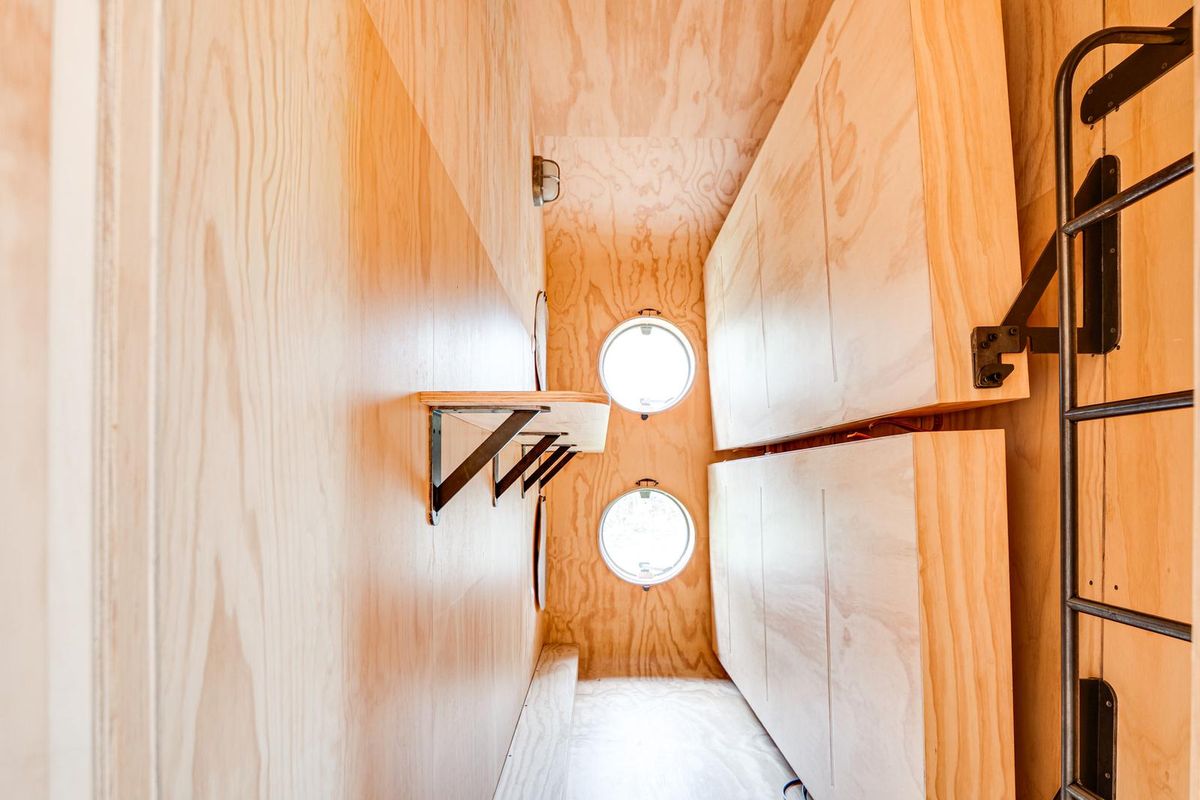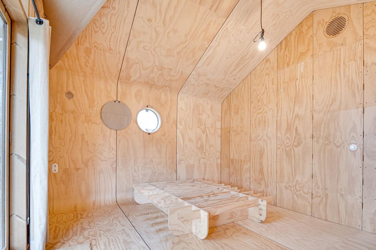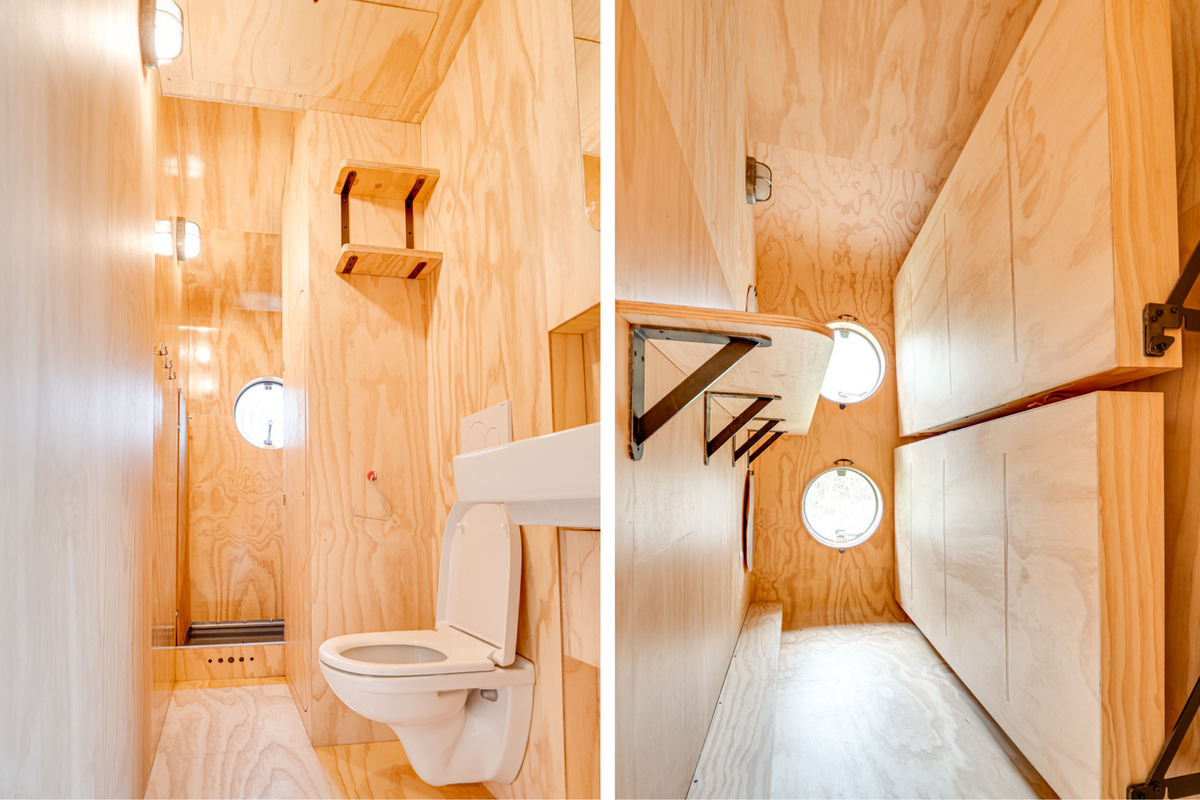 Door de openslaande deuren stap je de zithoek van de cabin binnen waar voldoende ruimte is voor een eethoek, gezellige zithoek en extra opbergruimte. De keuken is voorzien van een inductiekookplaat en koelkast en natuurlijk voldoende opbergruimte. In het halletje bevinden zich de compacte badkamer met unieke Wikkelhouse-kenmerken. Daarnaast bevindt zich een tweede slaapkamer waar ruimte is voor een stapelbed. Achterin vind je de ruime, lichte slaapkamer waar tevens kastruimte is ingebouwd. De cabin is volledig elektrisch.