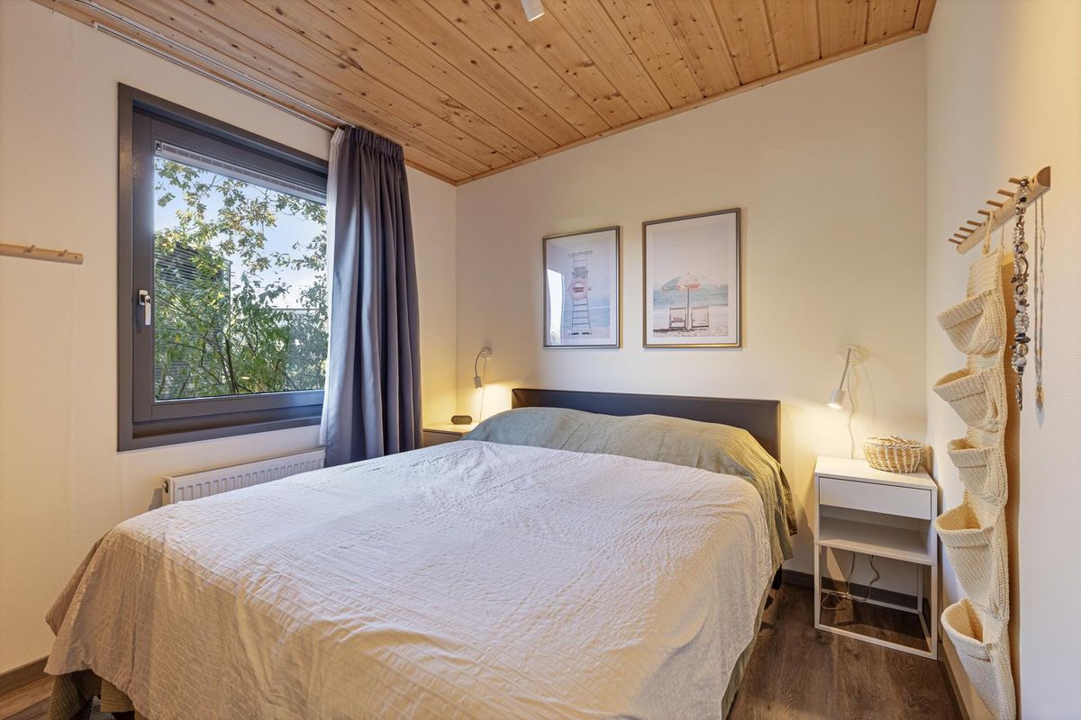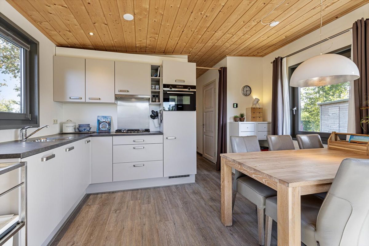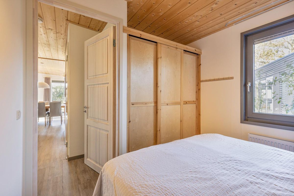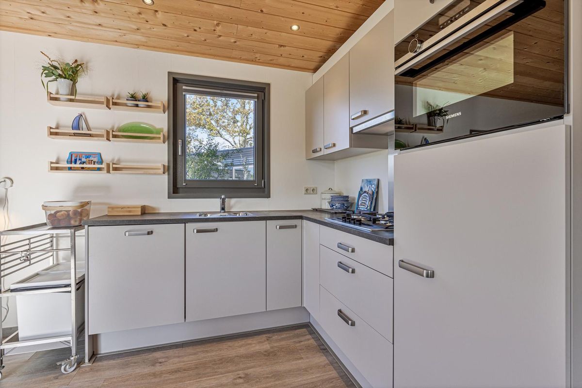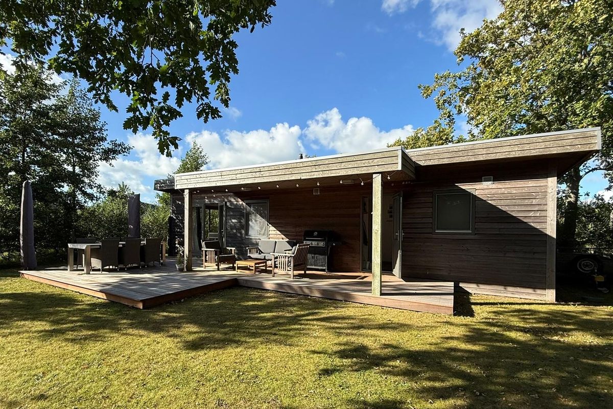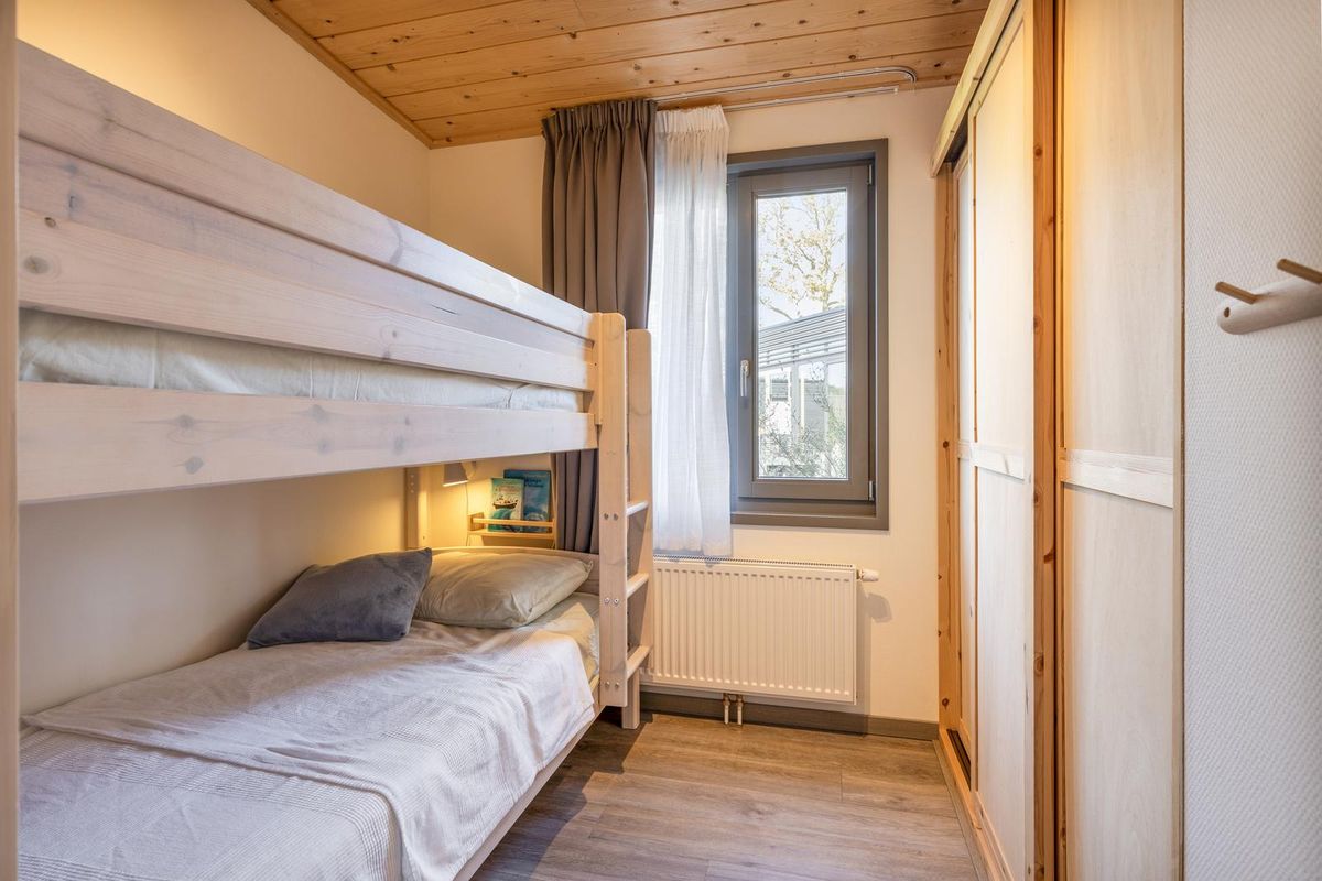 De vrijstaande cabin met groendak straalt eigentijdse charme uit dankzij de Siberisch lariks gevelbekleding, hardhouten kozijnen en dubbele beglazing. Binnen vindt u een sfeervolle woonkamer met open keuken, een moderne badkamer en twee ruime slaapkamers. Eén slaapkamer is uitgerust met een tweepersoonsbed, de andere met een groot stapelbed. Beide kamers beschikken over handige inbouwkasten met schuifdeuren. De badkamer is voorzien van een luxe inloopdouche en een stijlvol wastafelmeubel; in de hal bevindt zich een separaat toilet.