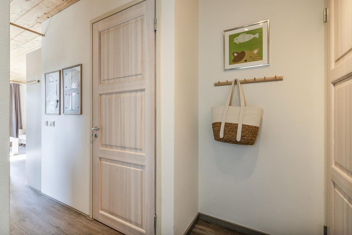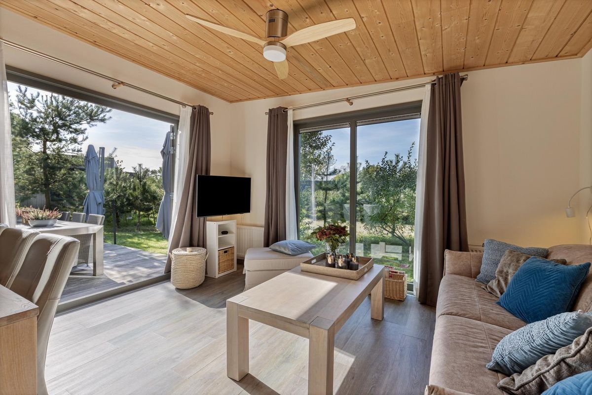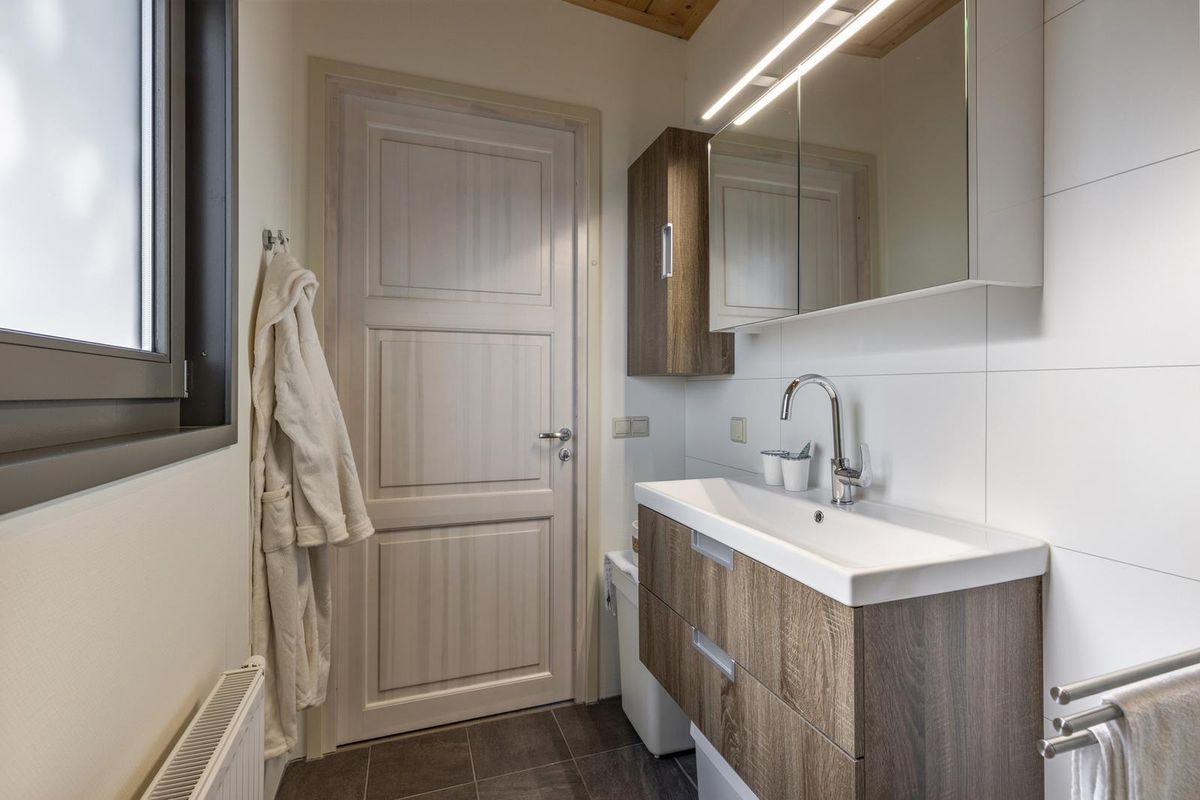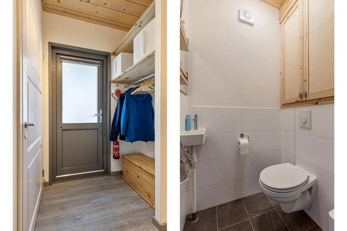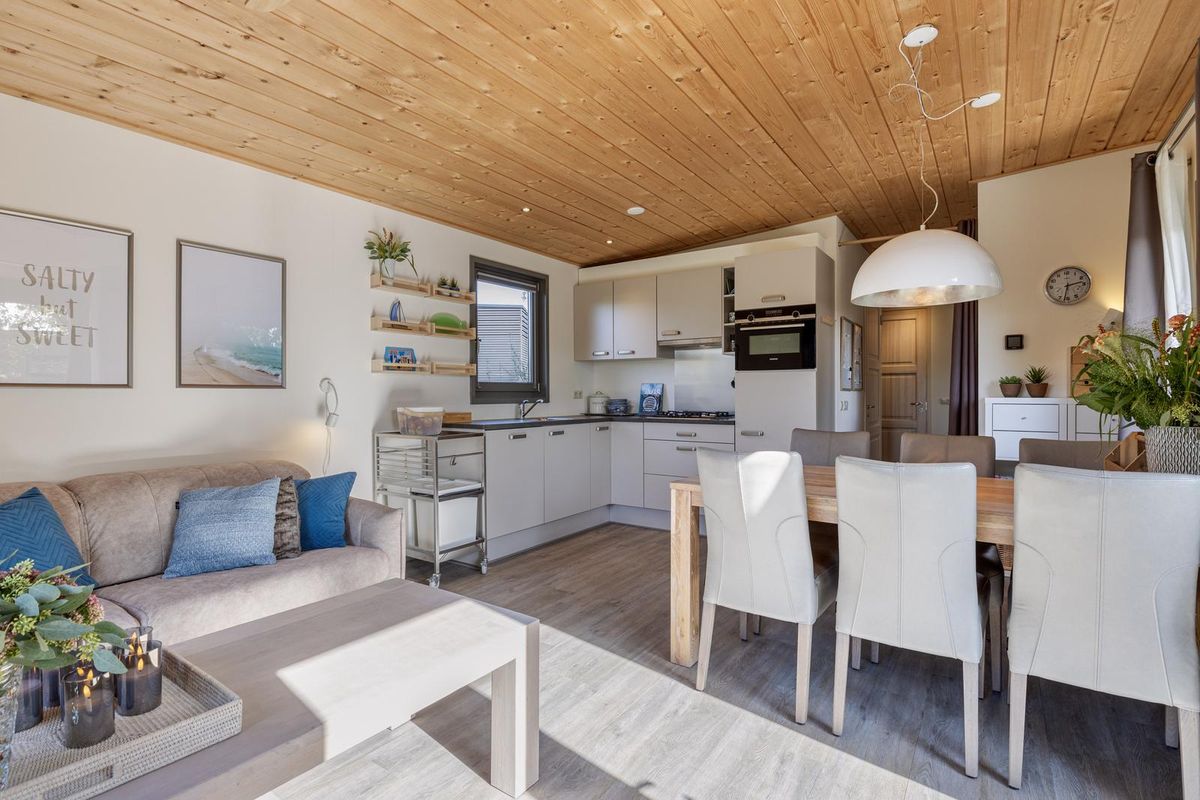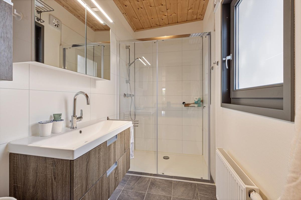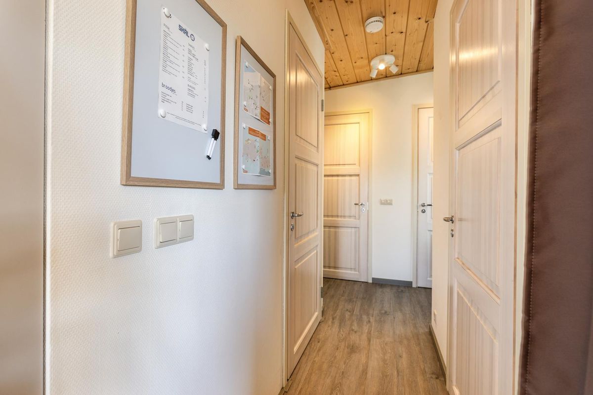 De vrijstaande cabin met groendak straalt eigentijdse charme uit dankzij de Siberisch lariks gevelbekleding, hardhouten kozijnen en dubbele beglazing. Binnen vindt u een sfeervolle woonkamer met open keuken, een moderne badkamer en twee ruime slaapkamers. Eén slaapkamer is uitgerust met een tweepersoonsbed, de andere met een groot stapelbed. Beide kamers beschikken over handige inbouwkasten met schuifdeuren. De badkamer is voorzien van een luxe inloopdouche en een stijlvol wastafelmeubel; in de hal bevindt zich een separaat toilet.