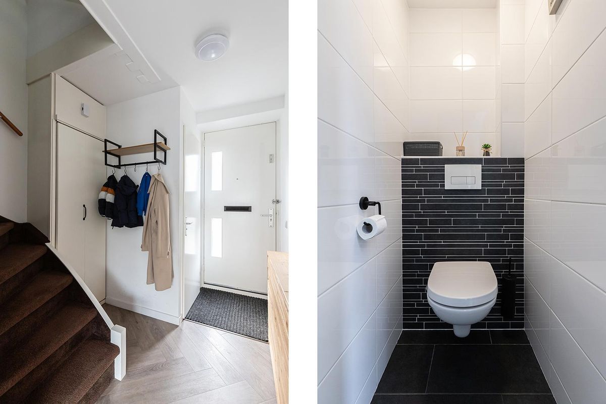 Bij binnenkomst valt meteen de warme uitstraling op. De hal biedt toegang tot het vernieuwde toilet, de woonkamer en de trap naar boven. De lichte, tuingerichte woonkamer voelt ruim aan en is afgewerkt met een stijlvolle pvc-vloer in visgraatmotief.