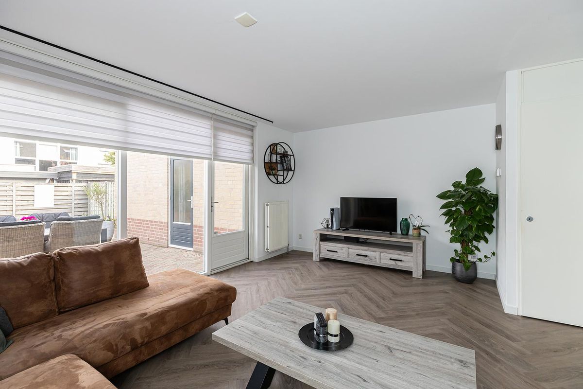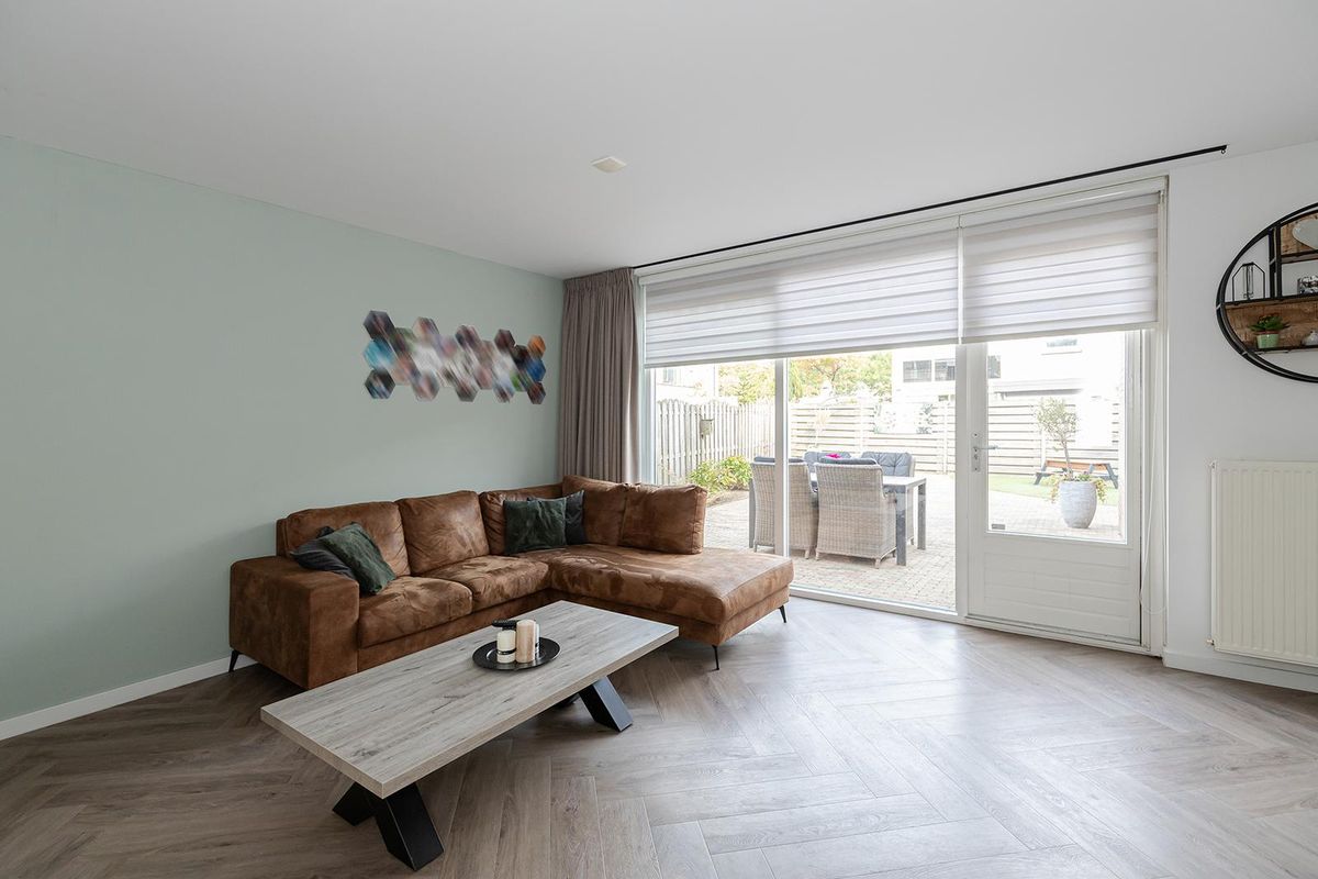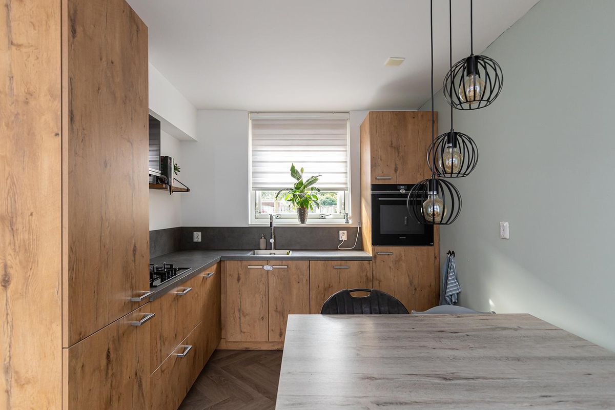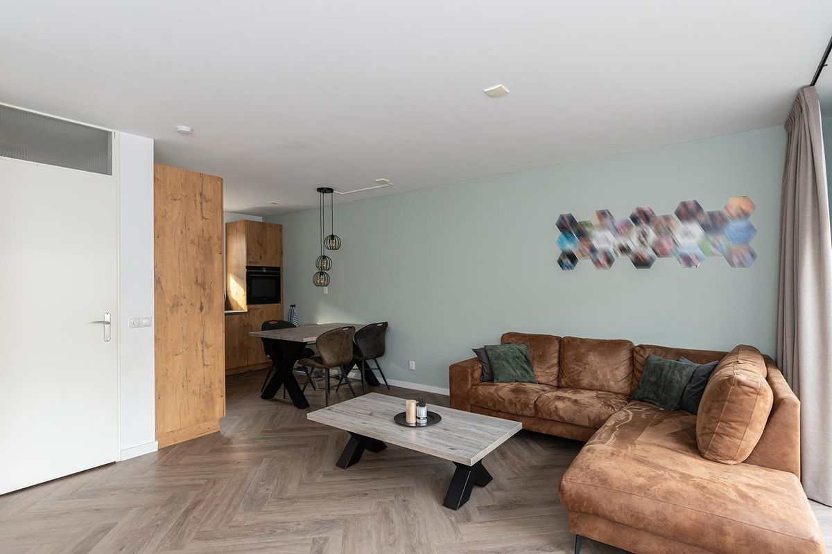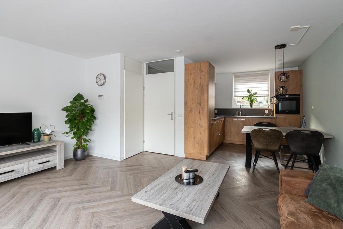 Dankzij de grote raampartijen en de openslaande deur naar de tuin stroomt het daglicht rijkelijk naar binnen. De open verbinding met de moderne keuken zorgt voor een gezellige leefruimte waarin koken en samenzijn moeiteloos samengaan. De keuken is voorzien van alle gewenste inbouwapparatuur en heeft een eigentijdse uitstraling met hout- en betonlook accenten.