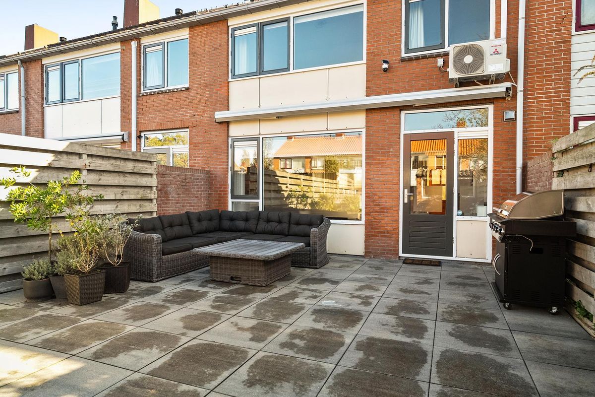 Via de keuken toegang tot de heerlijke tuin. Deze is volledig bestraat, gelegen op het zonnige zuiden, een mooie grote stenen schuur en achterom.