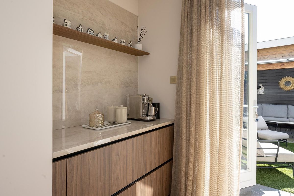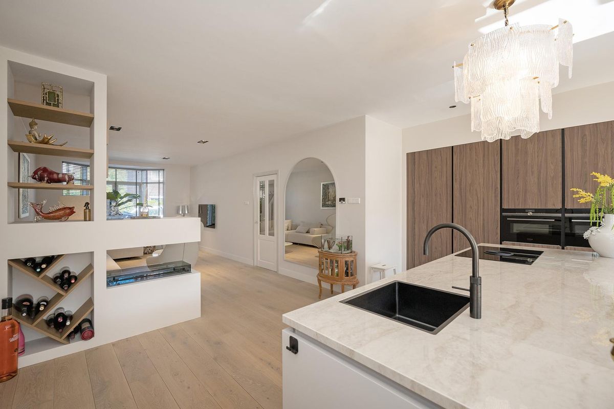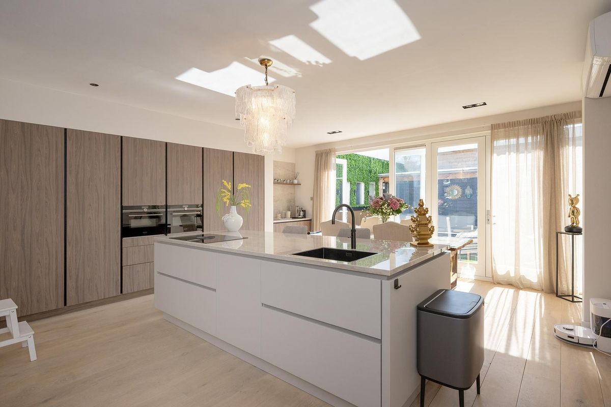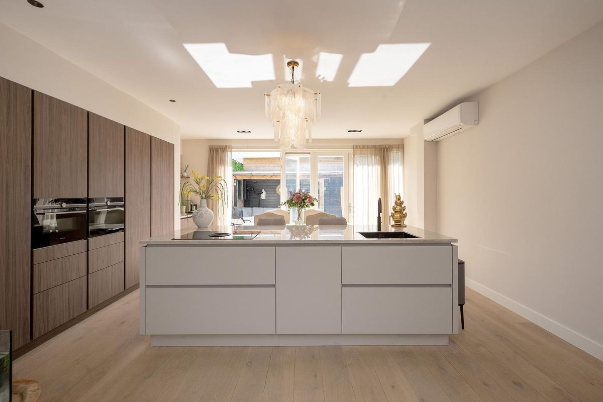 De eyecatcher in deze ruimte is de nieuwe keuken met een indrukwekkend kook-/spoeleiland die uitnodigt om plaats te nemen, terwijl in de coffee corner je cappuccino wordt voorbereid. De keuken heeft Siemens inbouwapparatuur zoals een inductie kookplaat met ingebouwde afzuiginstallatie, Quooker, vaatwasser, twee ovens en de koelkast.