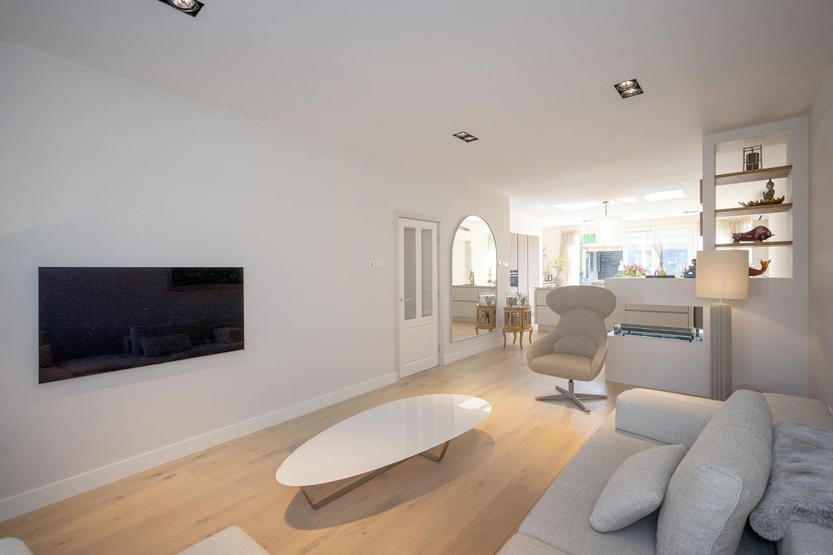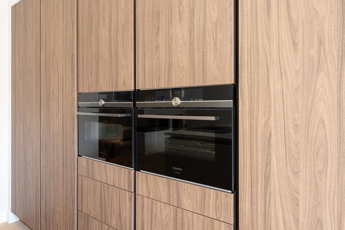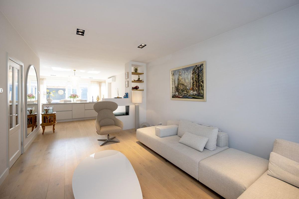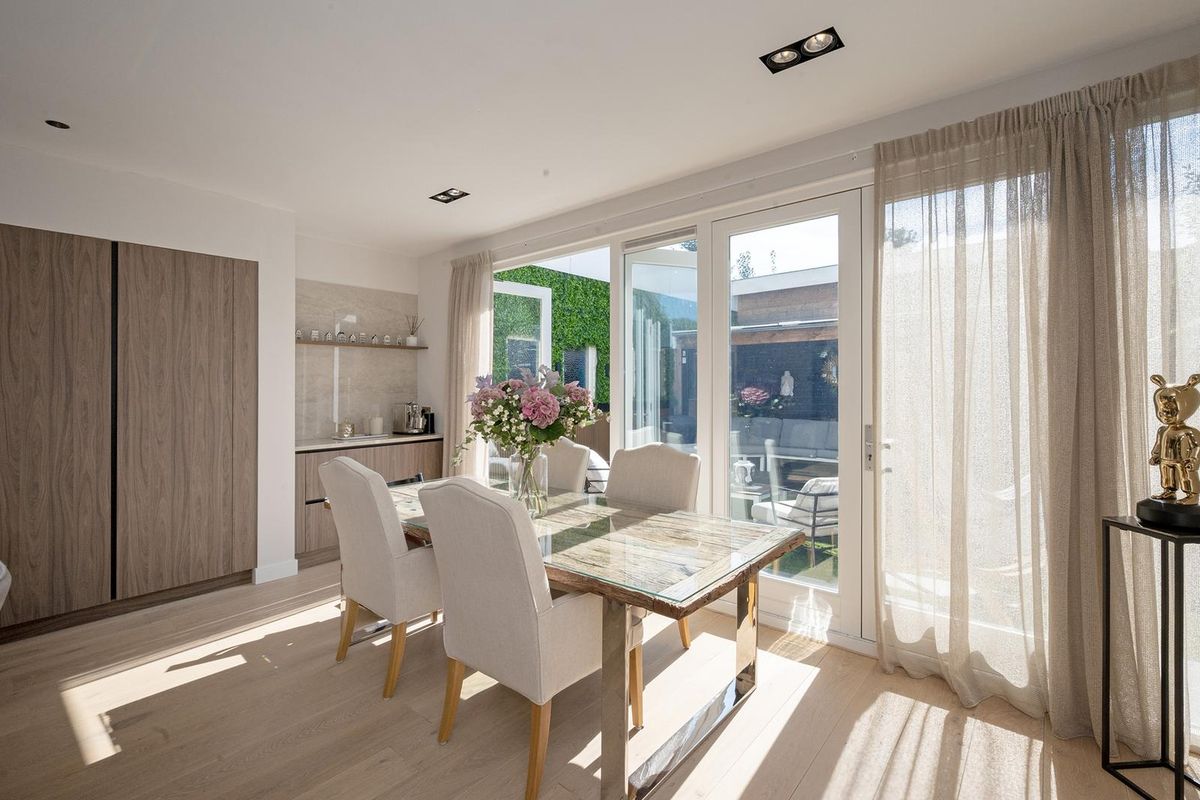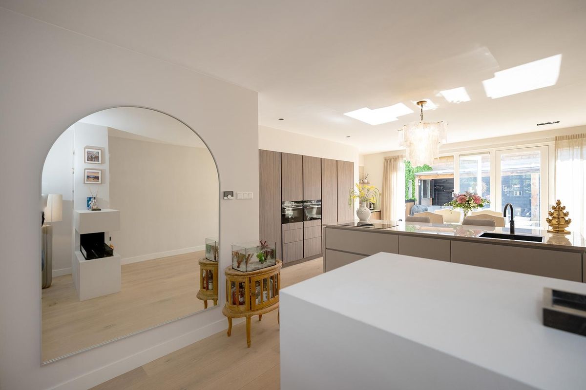 De eyecatcher in deze ruimte is de nieuwe keuken met een indrukwekkend kook-/spoeleiland die uitnodigt om plaats te nemen, terwijl in de coffee corner je cappuccino wordt voorbereid. De keuken heeft Siemens inbouwapparatuur zoals een inductie kookplaat met ingebouwde afzuiginstallatie, Quooker, vaatwasser, twee ovens en de koelkast.
