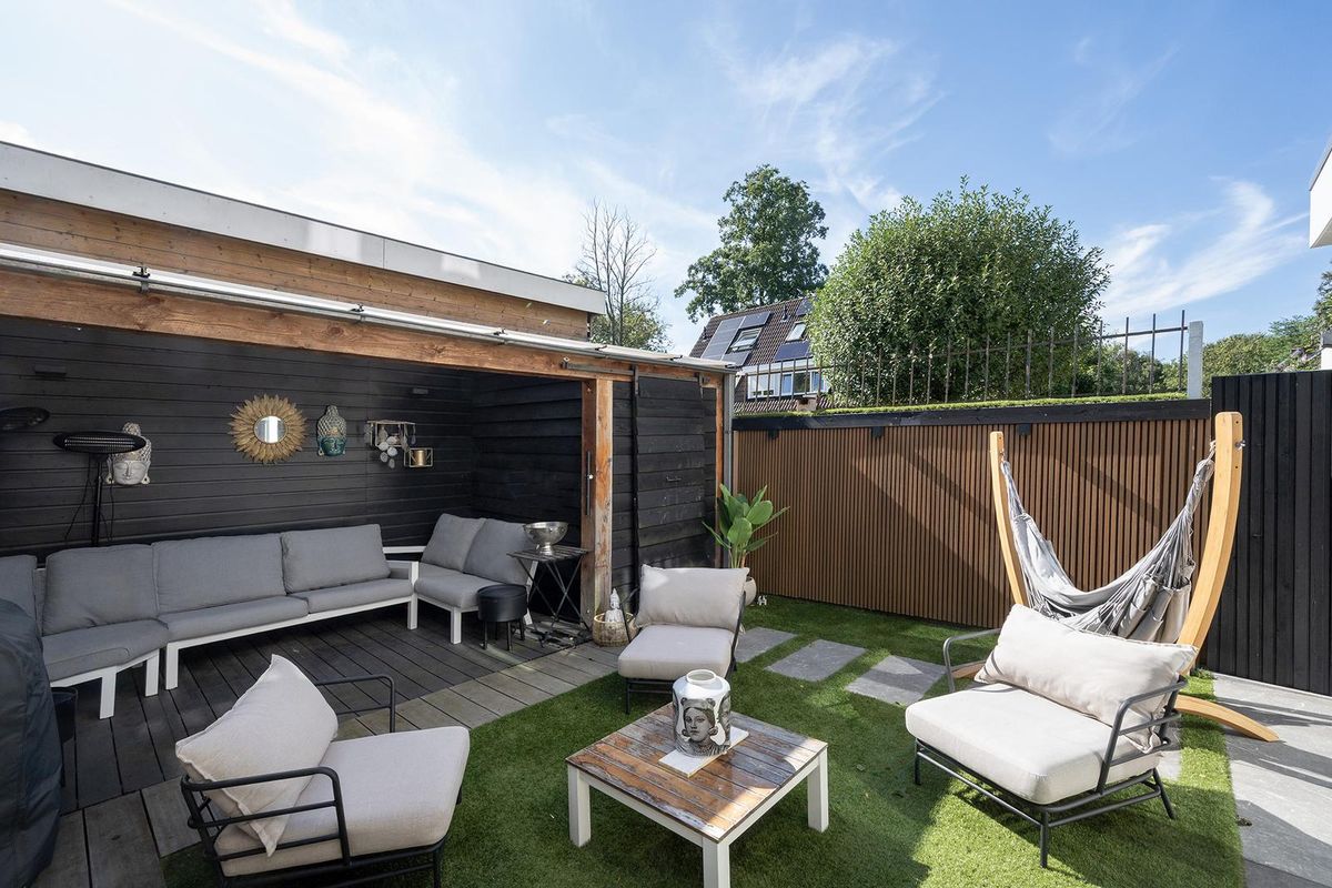 Vanuit de keuken is via 2x2 openslaande deuren de rustige achtertuin cq. binnenplaats te bereiken. De zonnige achtertuin is gelegen op het zuiden en biedt voldoende privacy, de tuin is namelijk geheel afgesloten. De tuin is sfeervol aangelegd met een overkapping en een handige berging. De tuin is bereikbaar via de achterom.