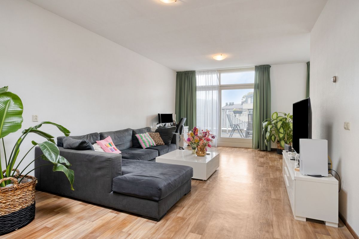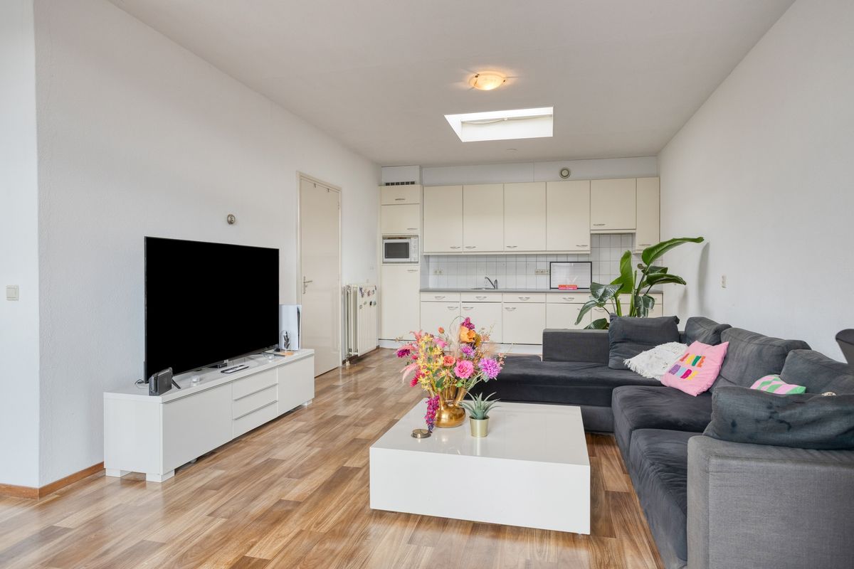 • L-vormige woonkamer met open keuken: de woonkamer heeft een lichtkoepel ter hoogte van de keukenopstelling en een schuifpui bij het balkon en een extra toegangsdeur naar het balkon (was voorheen de deur van de slaap-/ werkkamer). De woonkamer is zeer ruim van opzet. Een recht keukenblok aan de achterzijde bij de woonkamer met de volgende apparatuur: gaskookplaat, afzuigkap, koelkast en losse magnetron.
