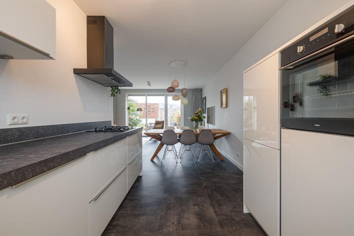 De praktisch en modern ingerichte halfopen keuken van ca. 10m2 is uitgerust met diverse inbouwapparatuur, waaronder een gaskookplaat, koelkast, spoelbak, vaatwasser (2024) en afzuigkap. Dankzij de grote raampartij aan de voorzijde oogt de keuken licht en ruim, wat bijdraagt aan een open en luchtige sfeer over de gehele begane grond.