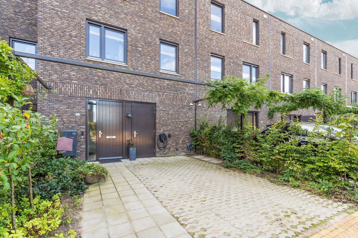 De voortuin beschikt over een eigen oprit met een laadpaal (ter overname), waardoor parkeren en elektrisch laden eenvoudig is. De tuin is een fraaie combinatie van bestrating en groen.