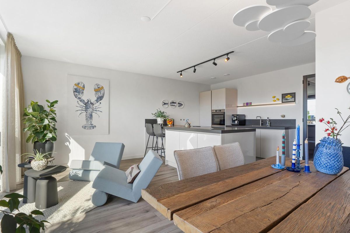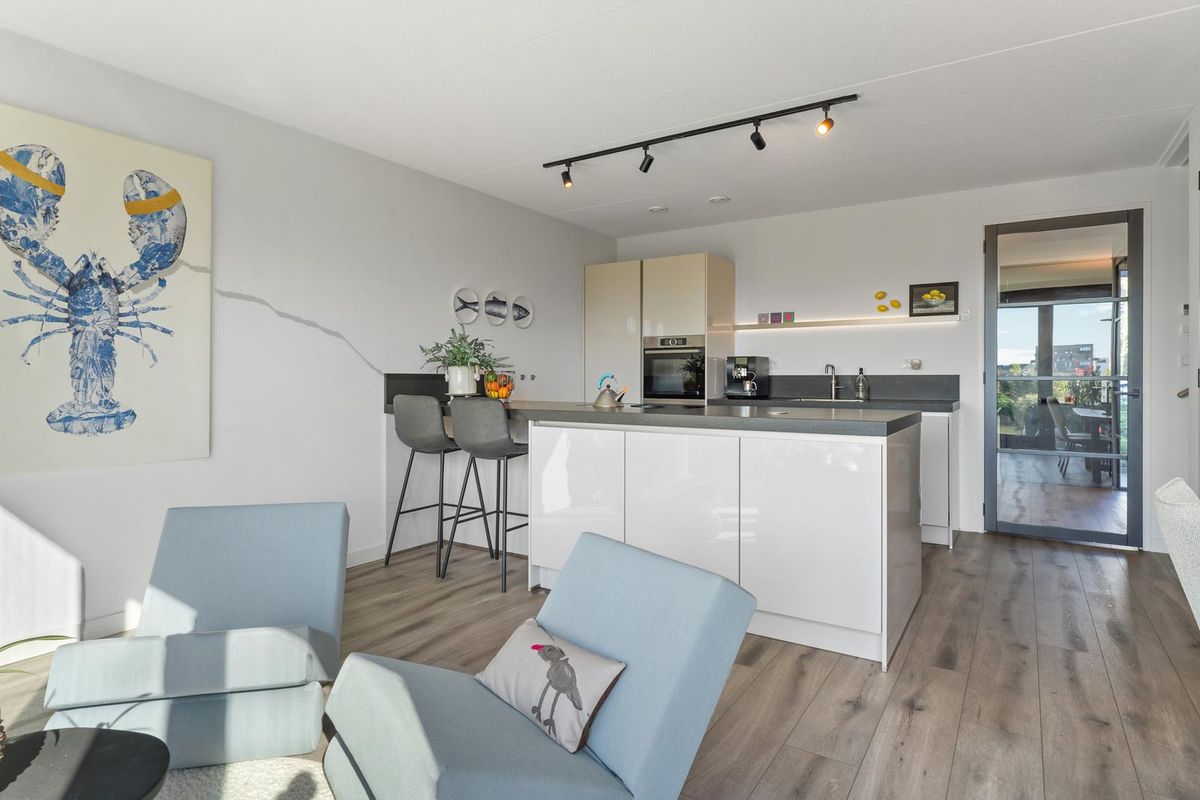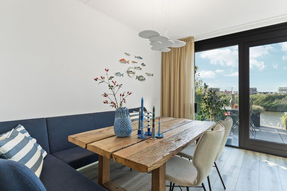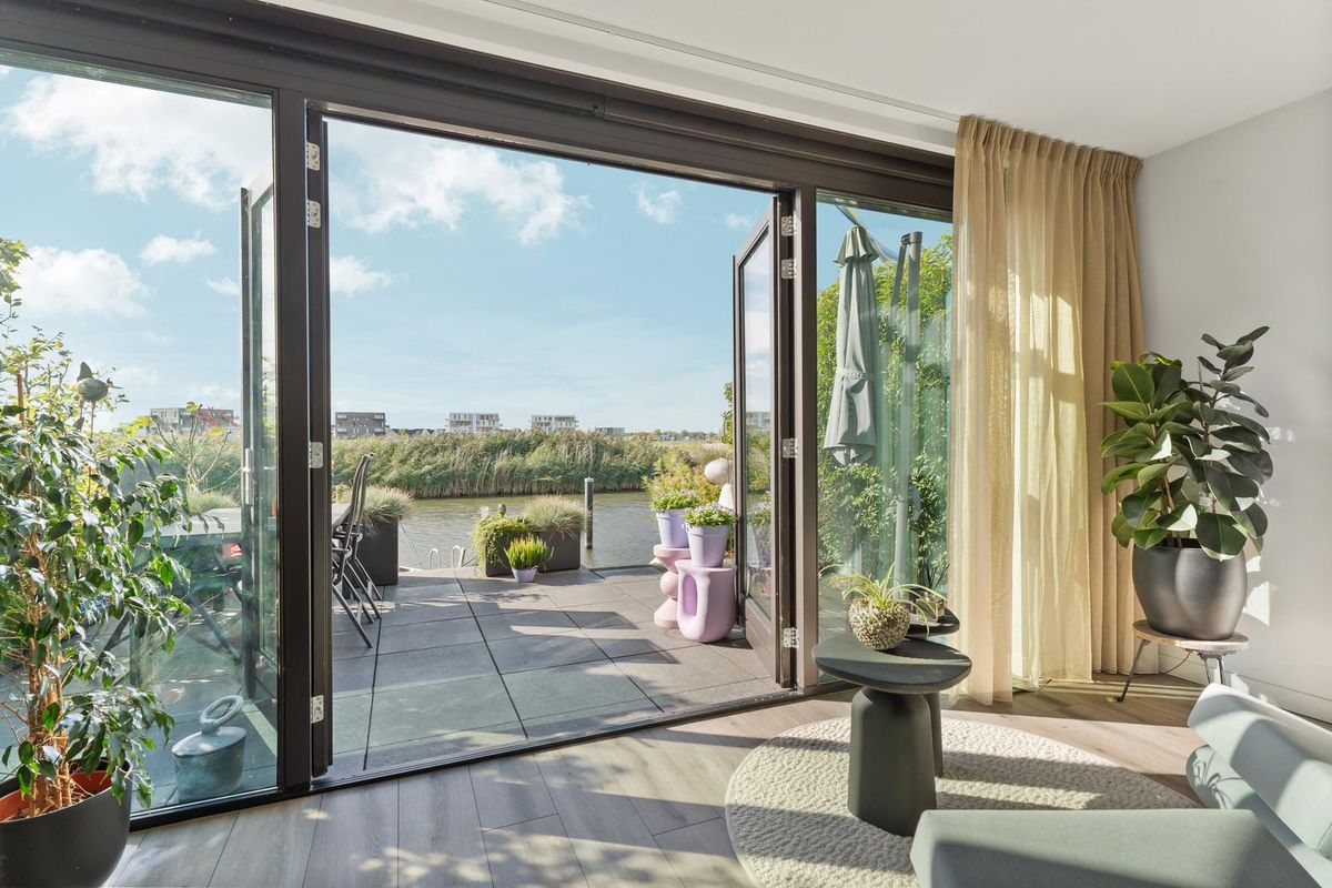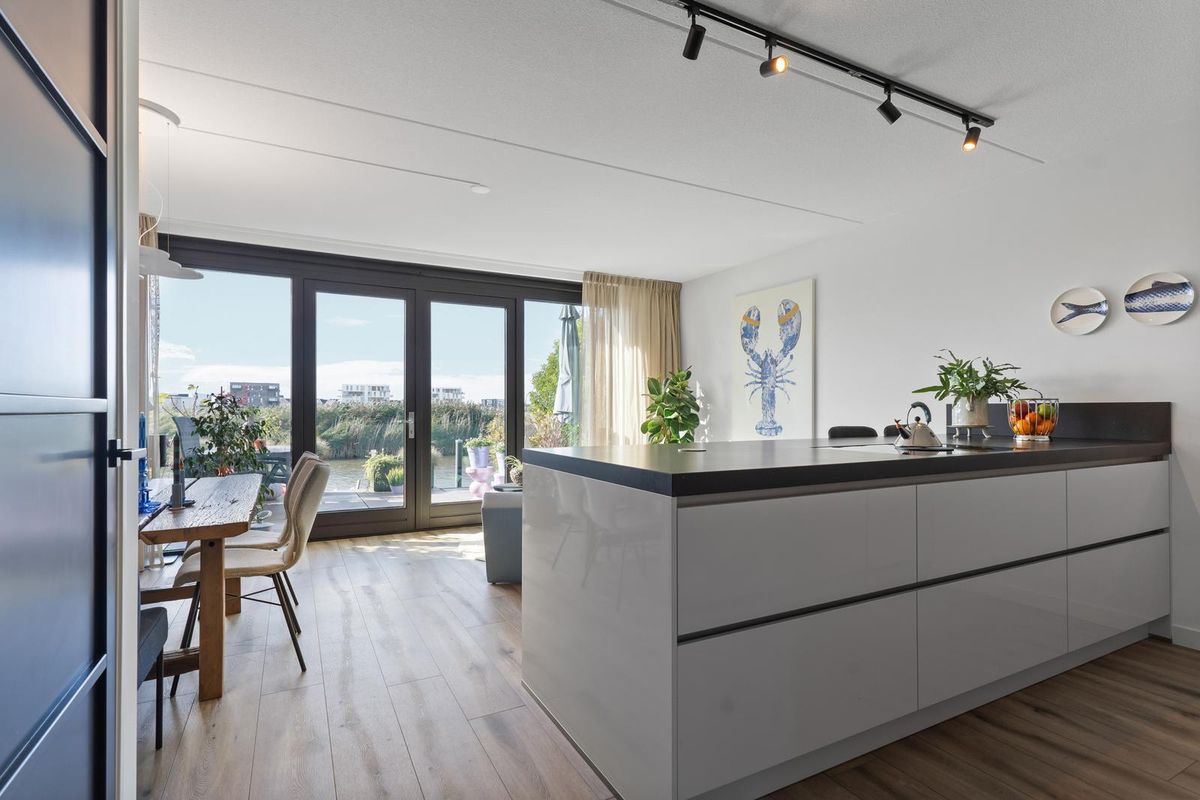 Wanneer je via de vaste trap op de eerste verdieping komt, bereik je de ruime en lichte woonkamer. Hier is gedacht aan zowel sfeer als functionaliteit. Er is meer dan voldoende plaats voor een grote zithoek met bank en fauteuils, daarnaast vind je hier zelfs een praktische tweede keukenopstelling, welke voorzien is van opbergruimte, een spoelbak en een klimaatkast. Dankzij de grote raampartijen met harmonicadeuren aan de achterzijde van de woning, geniet de woonkamer van veel natuurlijk licht en schitterend uitzicht over het water. De harmonica pui kan tevens in zijn geheel open.