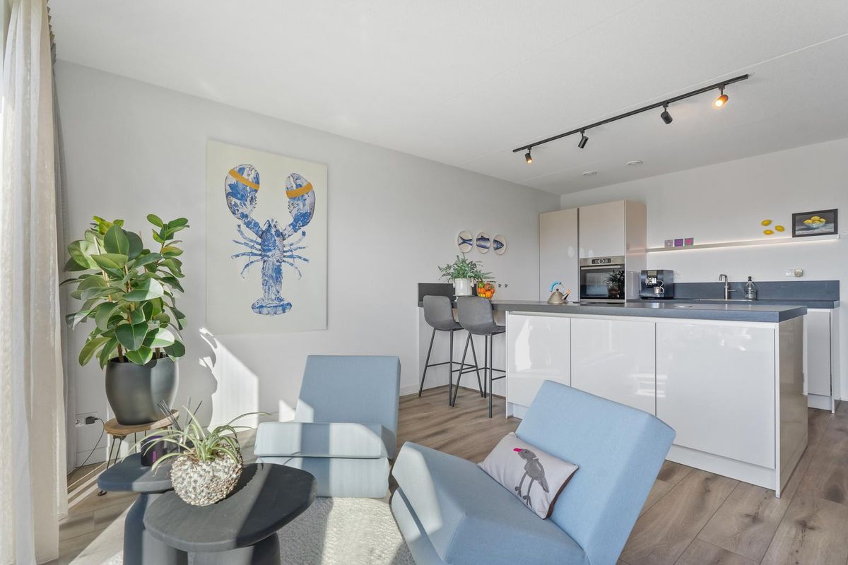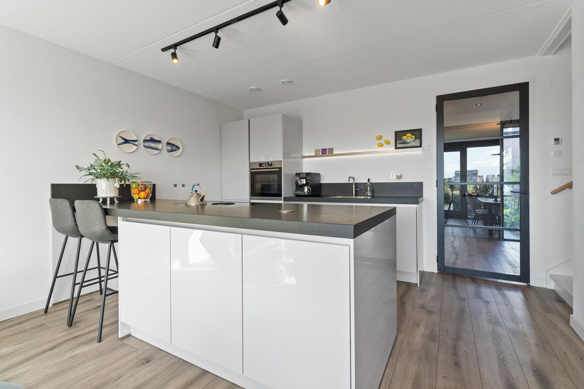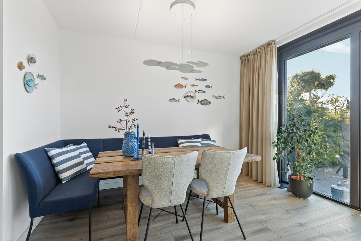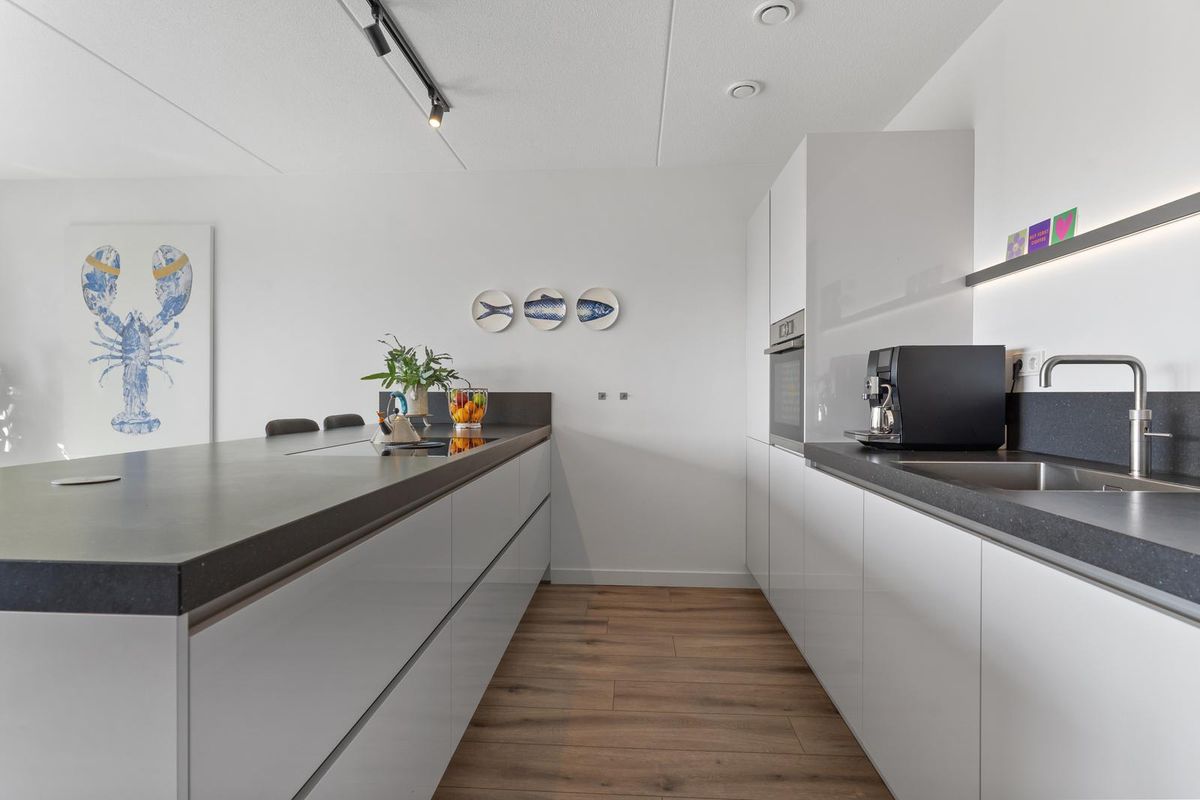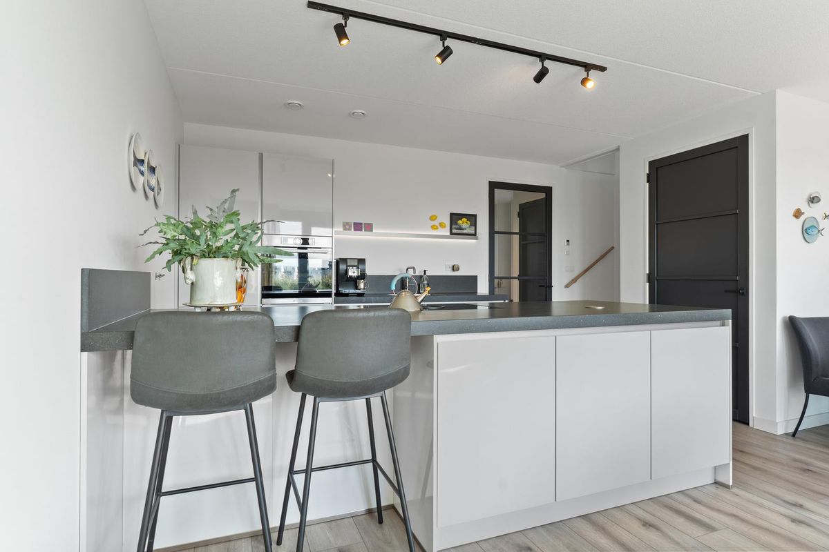 Wanneer je via de vaste trap op de eerste verdieping komt, bereik je de ruime en lichte woonkamer. Hier is gedacht aan zowel sfeer als functionaliteit. Er is meer dan voldoende plaats voor een grote zithoek met bank en fauteuils, daarnaast vind je hier zelfs een praktische tweede keukenopstelling, welke voorzien is van opbergruimte, een spoelbak en een klimaatkast. Dankzij de grote raampartijen met harmonicadeuren aan de achterzijde van de woning, geniet de woonkamer van veel natuurlijk licht en schitterend uitzicht over het water. De harmonica pui kan tevens in zijn geheel open.