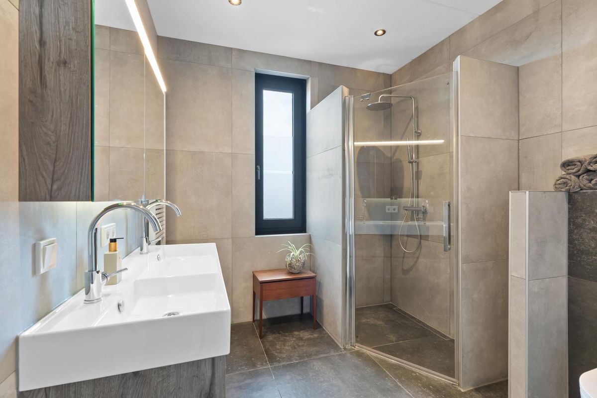 Via de vaste trap bereik je de overloop van de tweede verdieping. Vanaf deze overloop heb je toegang tot drie ruime slaapkamers van verschillende afmetingen, elk met volop daglicht. Deze verdieping is voorzien van vloerbedekking, waardoor de kamers een warme uitstraling hebben. De badkamer is uitgerust met een dubbele wastafel met meubel en verlichte spiegelkast, douche, hangend toilet, designradiator, inbouwspots en comfortabele vloerverwarming.