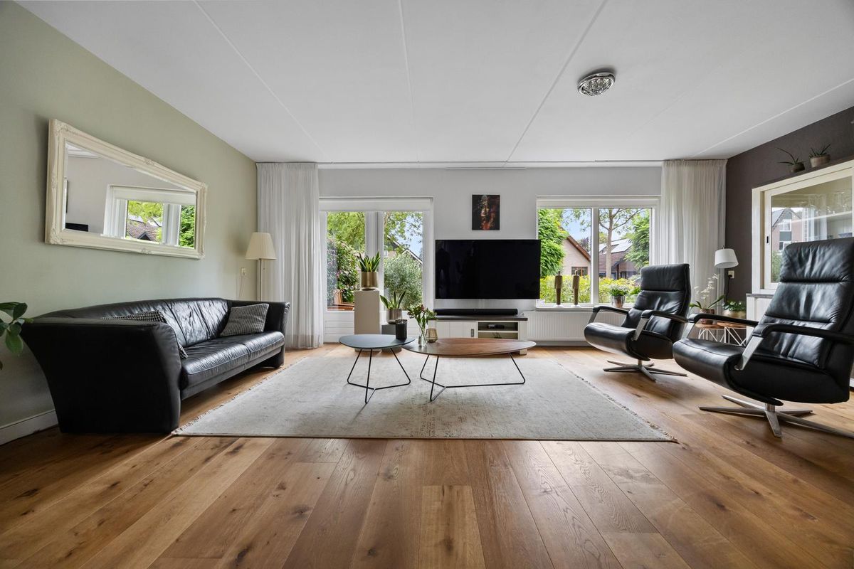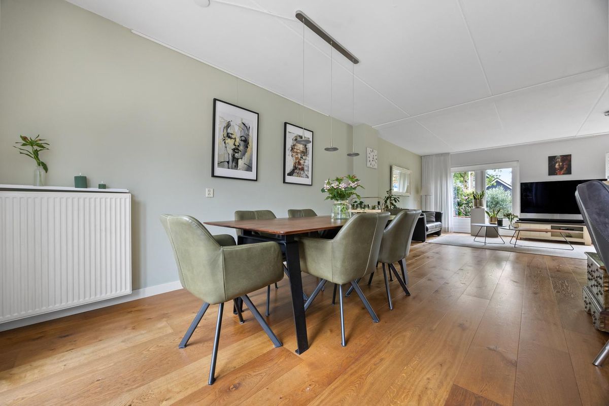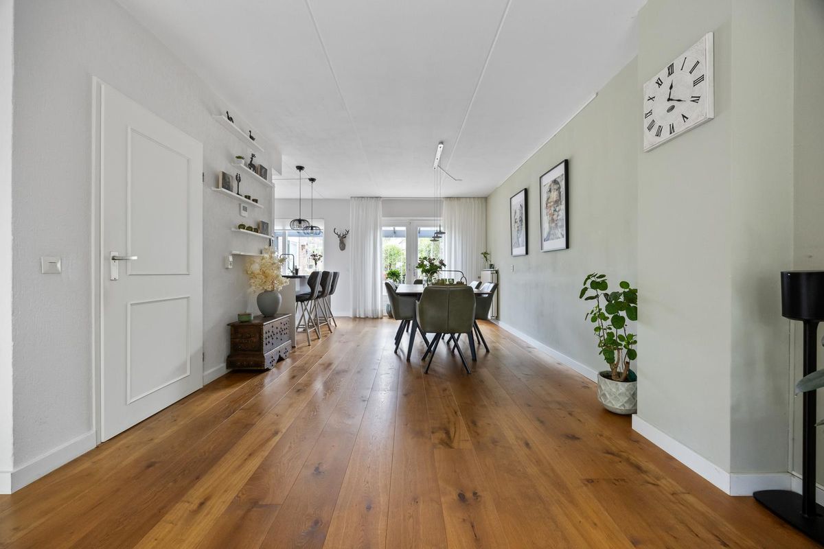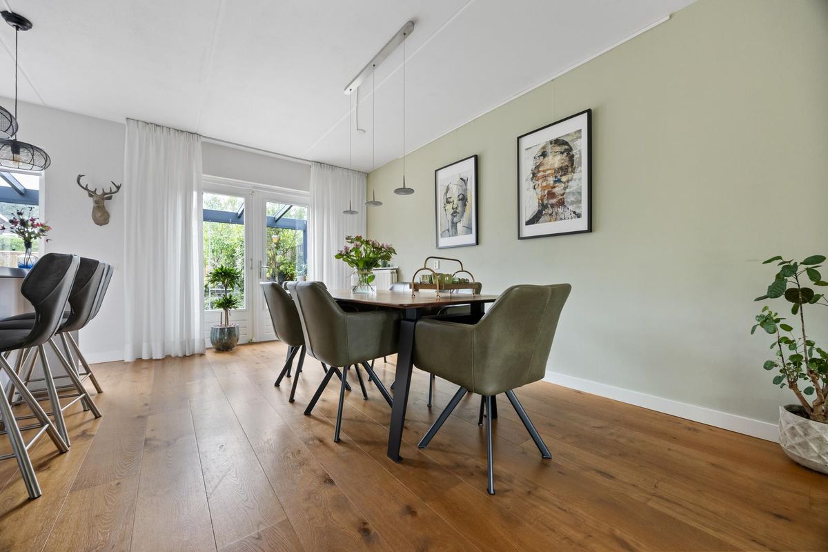Bij binnenkomst valt direct de ruime hal op, waar zich ook het moderne toilet met fontein bevindt. Vanuit hier leidt de doorgang naar de royale woonkamer, waar het eet- en woongedeelte zich harmonieus aaneensluiten. Openslaande deuren aan zowel de voor- als achterzijde zorgen voor een fijne verbinding met de tuin. De tuinkamer – uitgevoerd als een glazen serre – biedt het hele jaar door een comfortabele plek om te ontspannen, omgeven door groen.