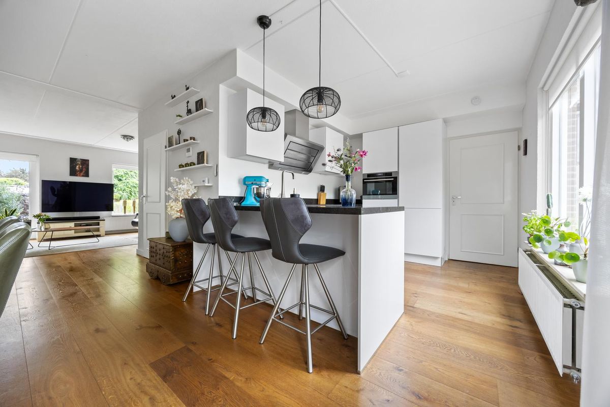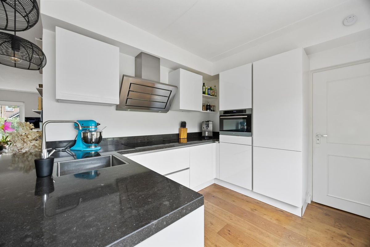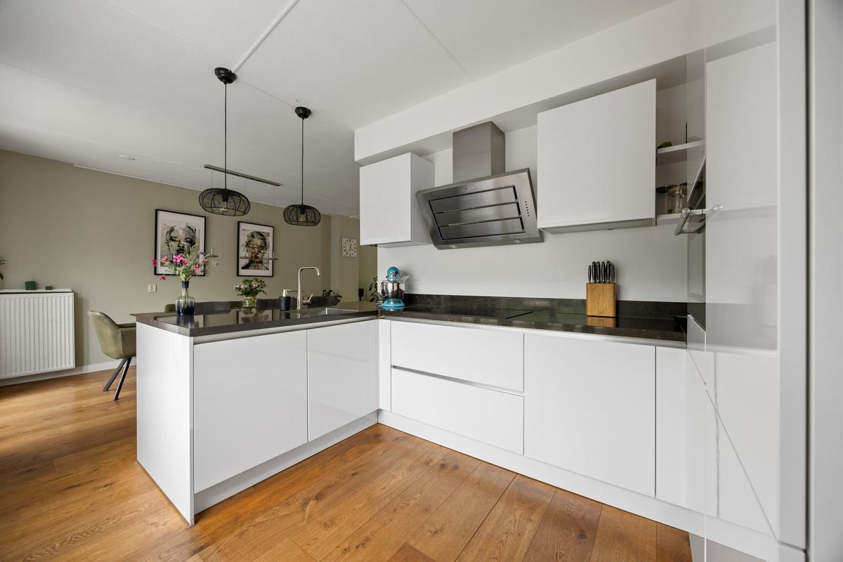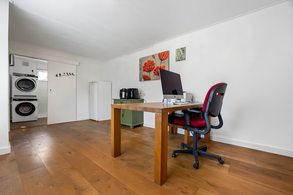 De moderne keuken is uitgevoerd in een luxe opstelling met een natuurstenen werkblad, spoel-/schiereiland en ontbijtbar met ruimte voor drie krukken. De keuken is voorzien van een warmwaterboiler (10l), vaatwasser, inductiekookplaat met design afzuigkap, combi-oven, grote koelkast en veel opbergruimte in witte greeploze kasten. Vanuit de keuken is toegang tot een multifunctionele kamer, momenteel ingericht als kantoorruimte, met aangrenzend een badkamer met toilet, douche en aansluitingen voor wasmachine en droger. Deze opzet maakt een combinatie van wonen en werken of wonen op de begane grond moeiteloos mogelijk.