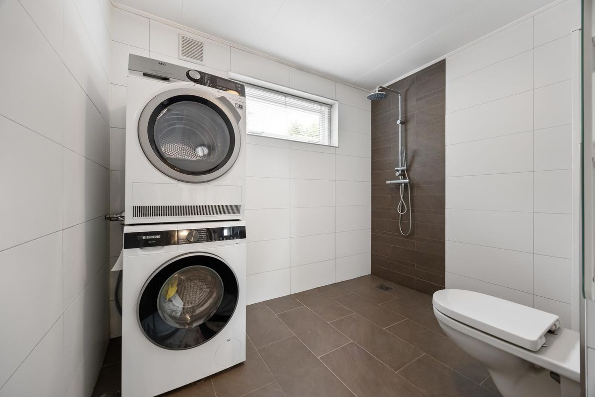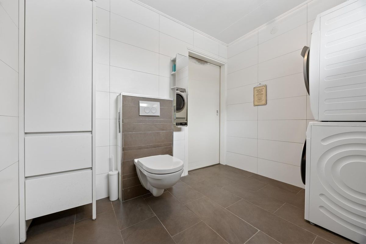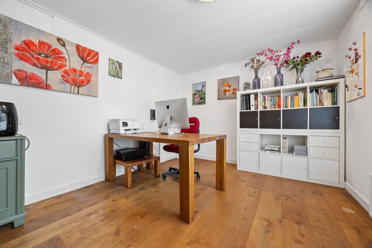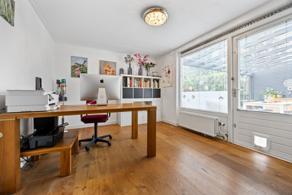 De moderne keuken is uitgevoerd in een luxe opstelling met een natuurstenen werkblad, spoel-/schiereiland en ontbijtbar met ruimte voor drie krukken. De keuken is voorzien van een warmwaterboiler (10l), vaatwasser, inductiekookplaat met design afzuigkap, combi-oven, grote koelkast en veel opbergruimte in witte greeploze kasten. Vanuit de keuken is toegang tot een multifunctionele kamer, momenteel ingericht als kantoorruimte, met aangrenzend een badkamer met toilet, douche en aansluitingen voor wasmachine en droger. Deze opzet maakt een combinatie van wonen en werken of wonen op de begane grond moeiteloos mogelijk.