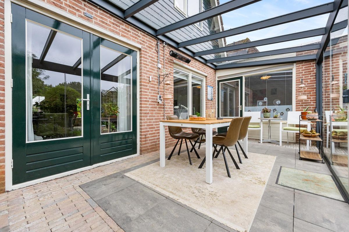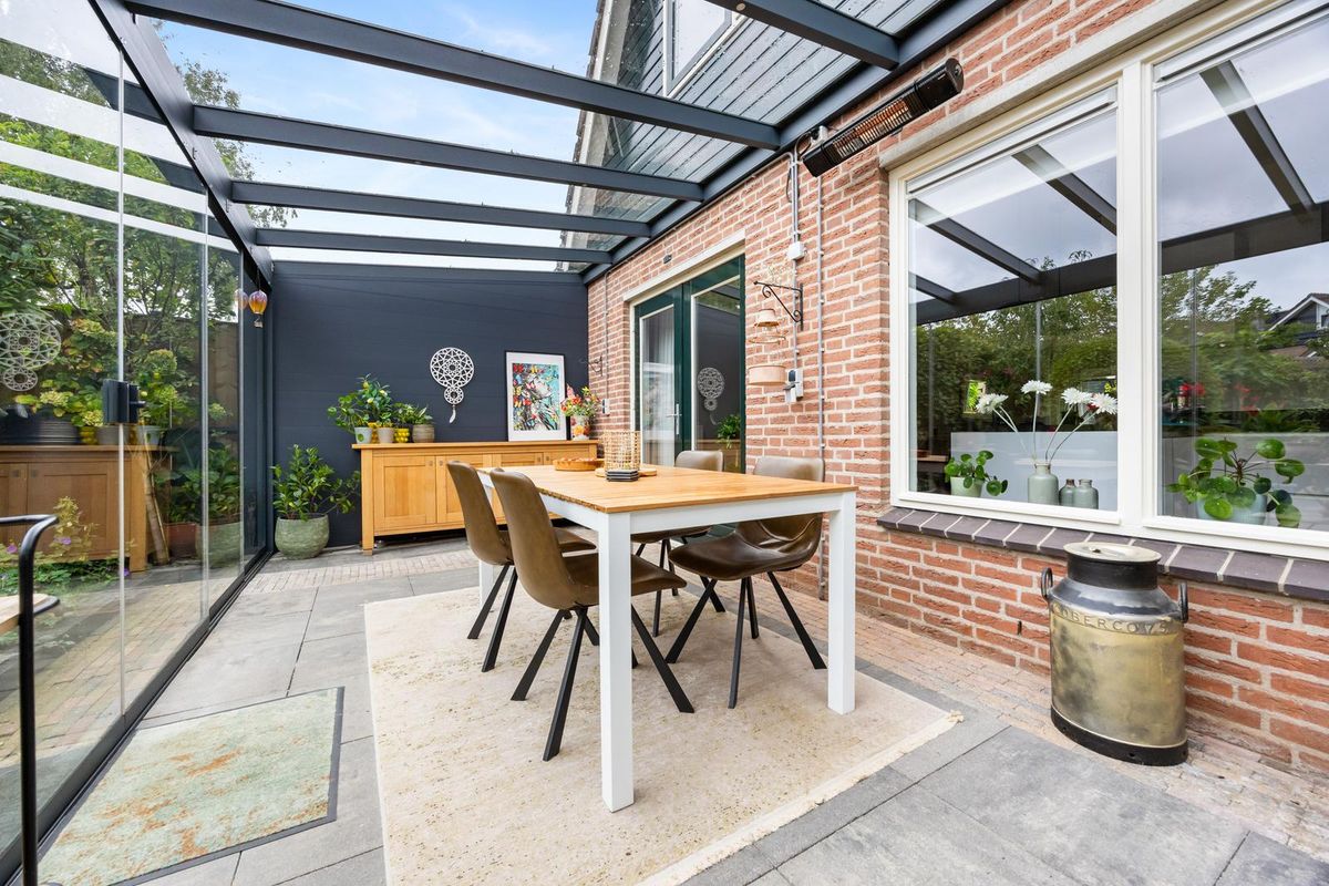 De fraai aangelegde tuin rondom de woning biedt volop privacy en zonlicht. De achtertuin is ingericht met diverse beplanting zoals peer- en vijgenbomen, sierstruiken, sfeerverlichting, een houten erfafscheiding en een buitenkraan. De glazen serre aan de achtergevel is uitgevoerd met aluminium palazzo-profielen, geïntegreerde verlichting en een terrasverwarmer. Via een houten poort aan de zijkant is er een overdekt pad naar de voortuin. Aan de voorzijde zorgen elektrische screens voor comfort en verkoeling. De oprit biedt ruimte voor zeker twee auto’s.