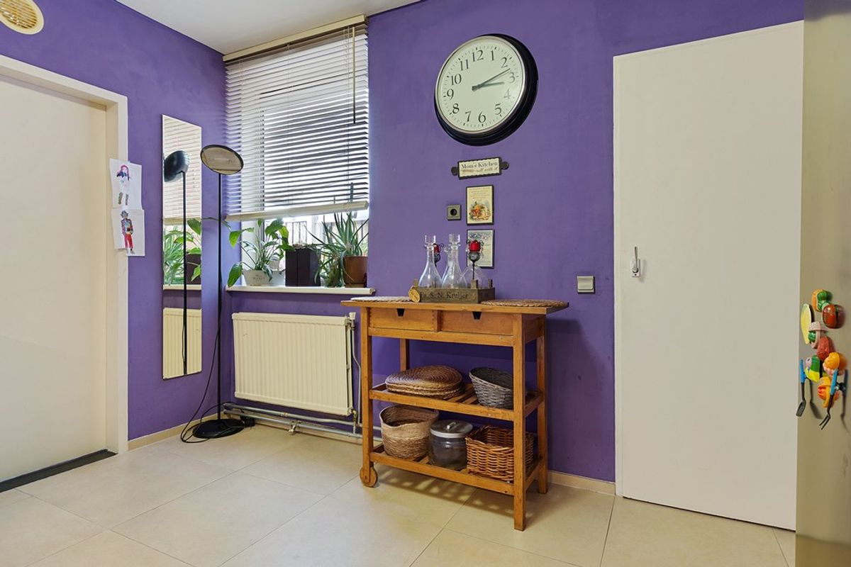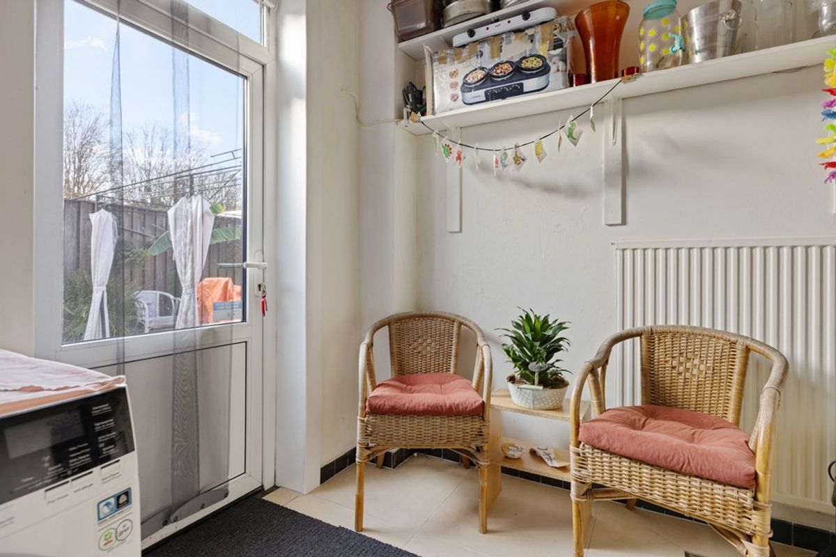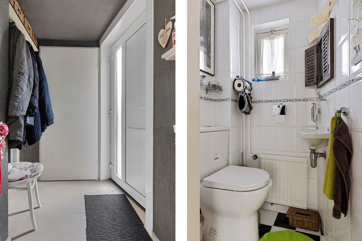 Achter de keuken bevindt zich de praktische bijkeuken, ideaal voor extra opbergruimte of apparatuur. Vanuit de bijkeuken én via de schuifpui in de woonkamer loop je zo de achtertuin in.