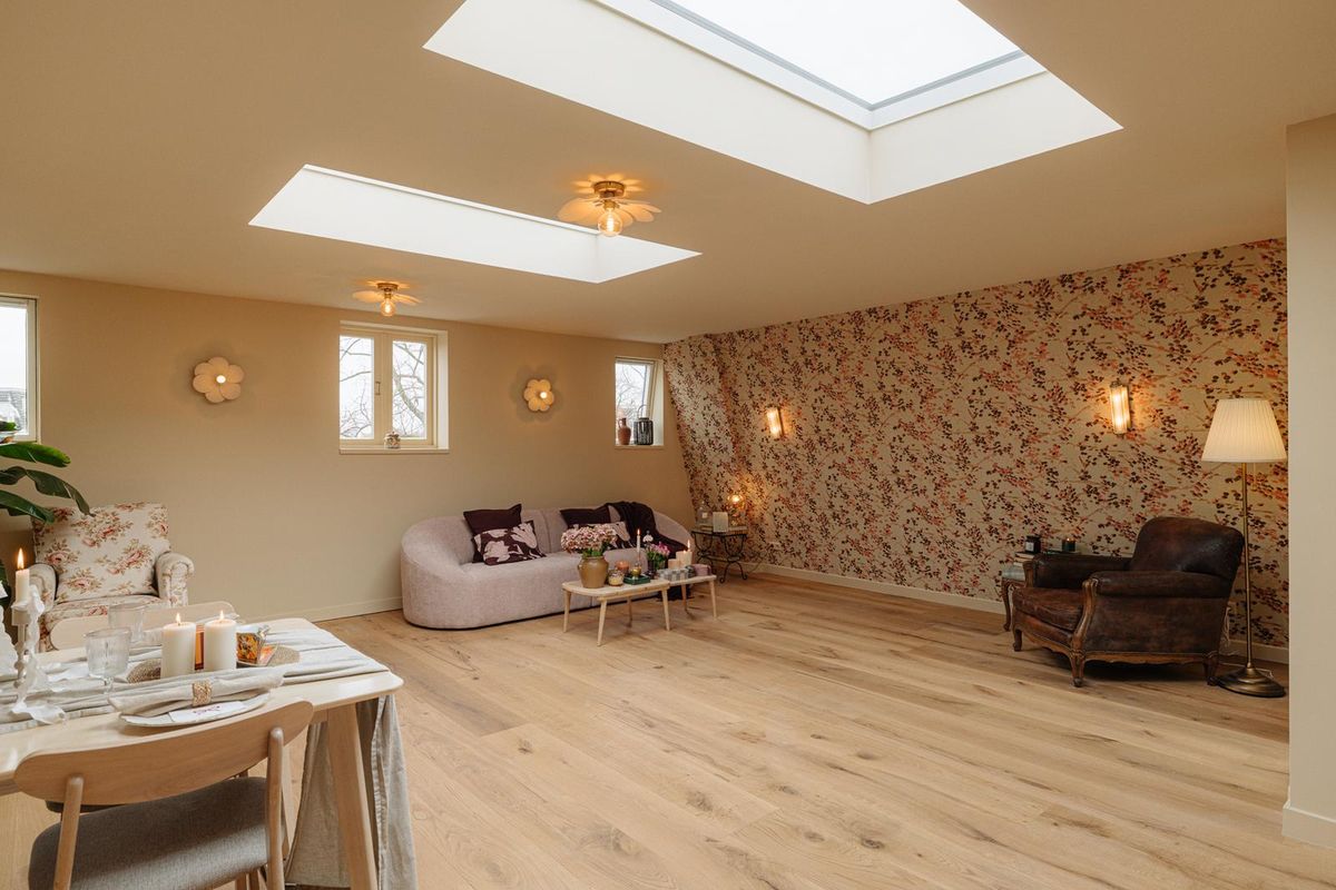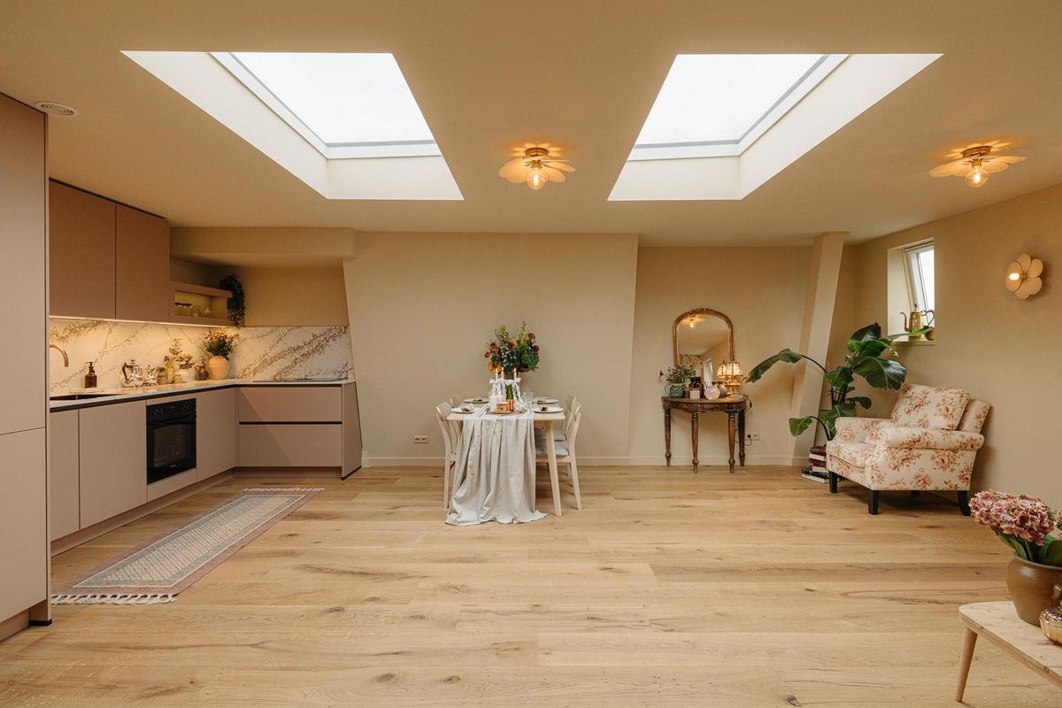 Een topverdieping in een historisch pand, waar het zonlicht door drie royale lichtstraten valt en iedere hoek zacht verlicht.