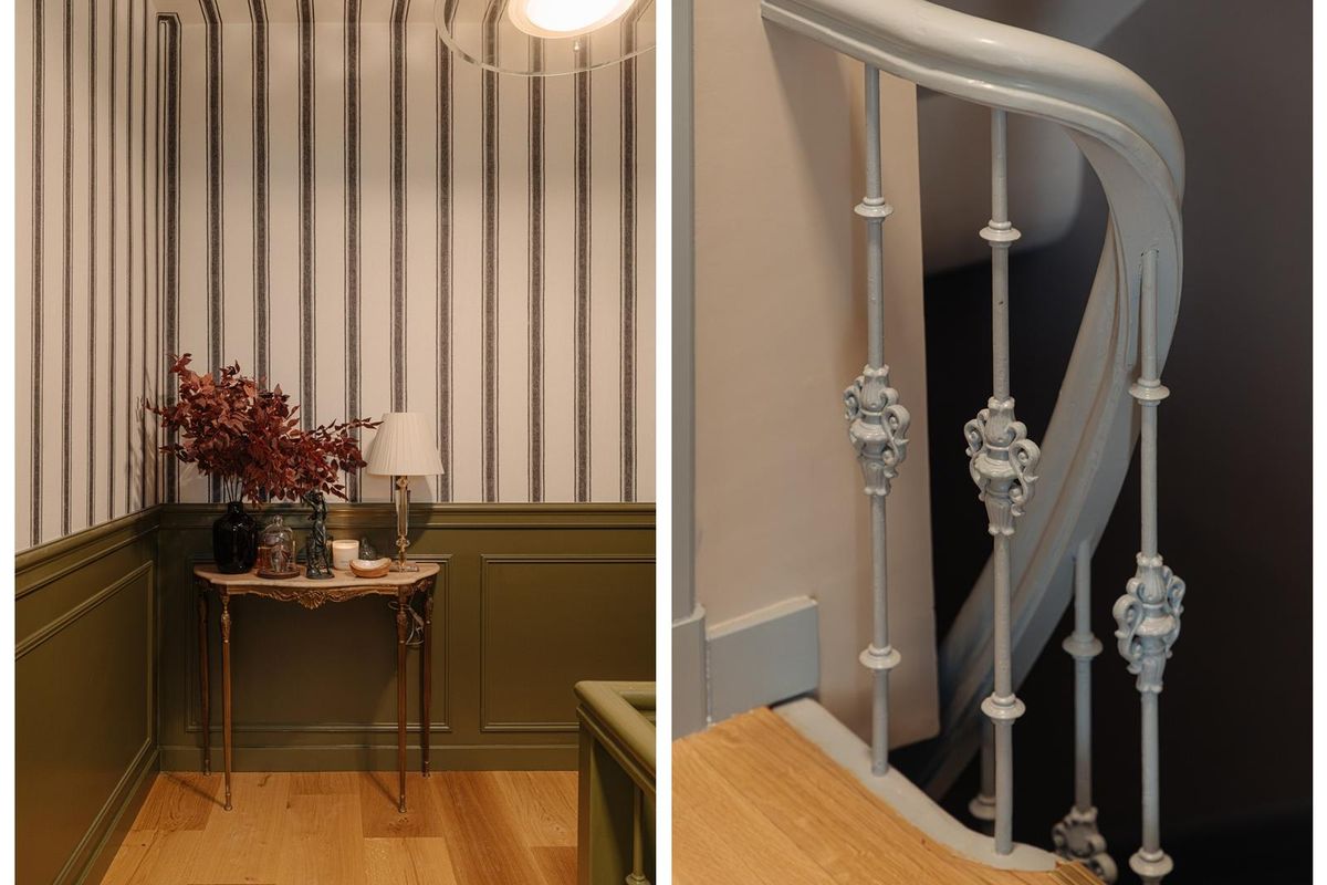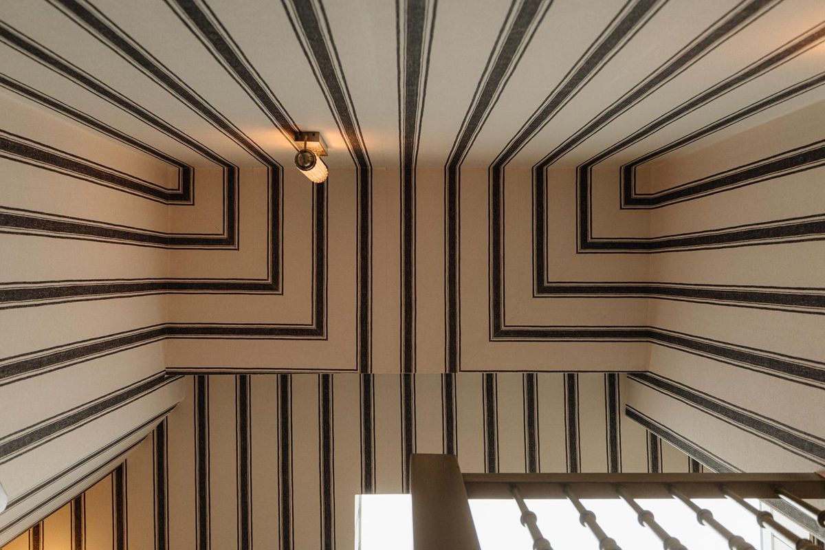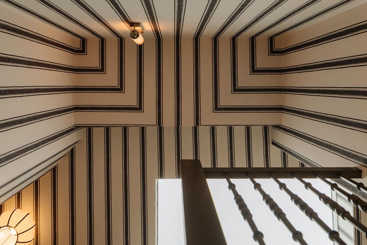 The journey begins in the hallway and ascends along the staircase, where striped wallpaper plays with perspective, an optical illusion that shifts with each glance, an Escher-like path that embraces and challenges the mind.