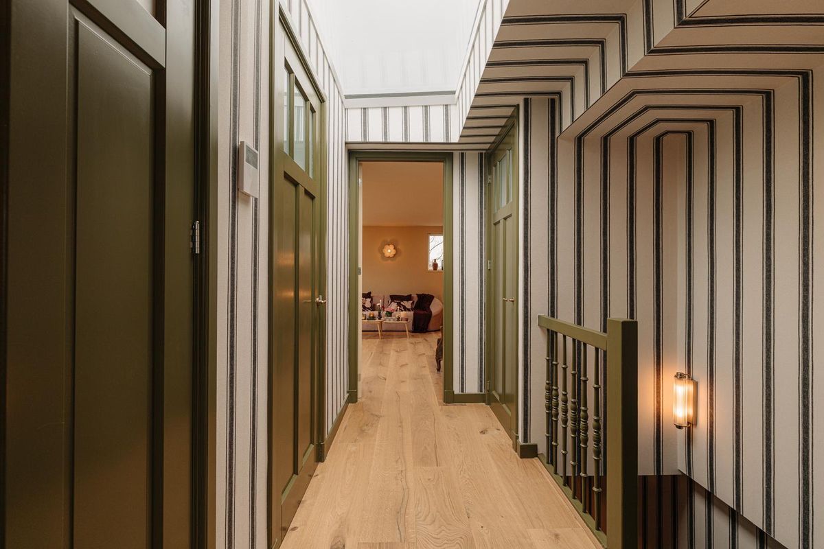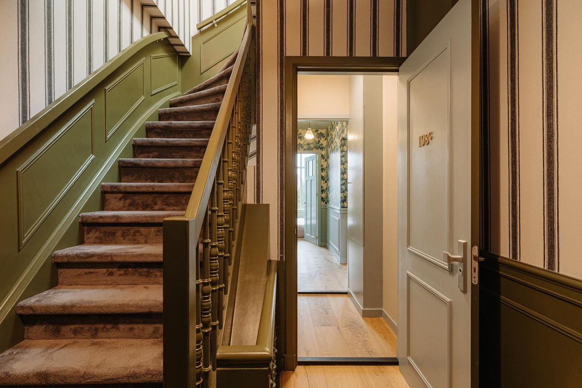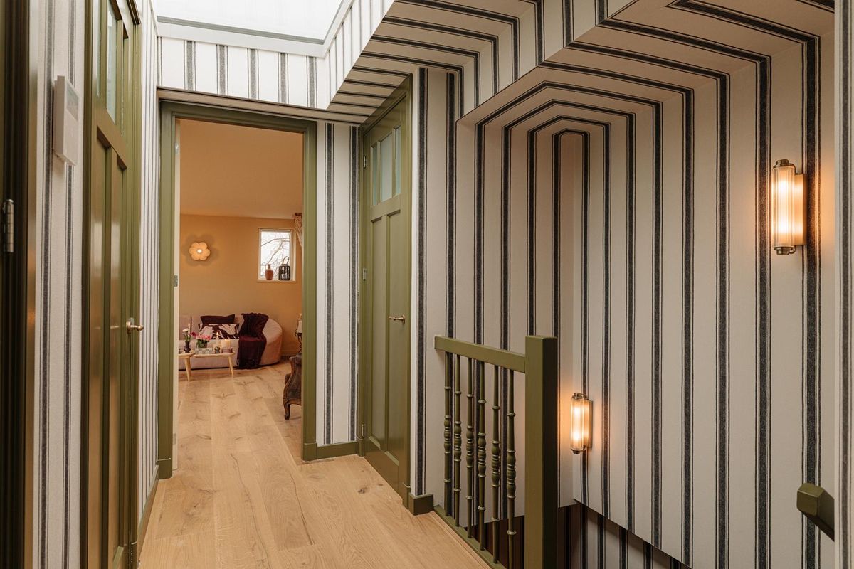 De reis begint in de hal en voert omhoog langs de trap, waar gestreept behang met perspectief speelt, een optische illusie die bij elke blik verandert, een Escher-achtig pad dat je gedachten omarmt en uitdaagt.