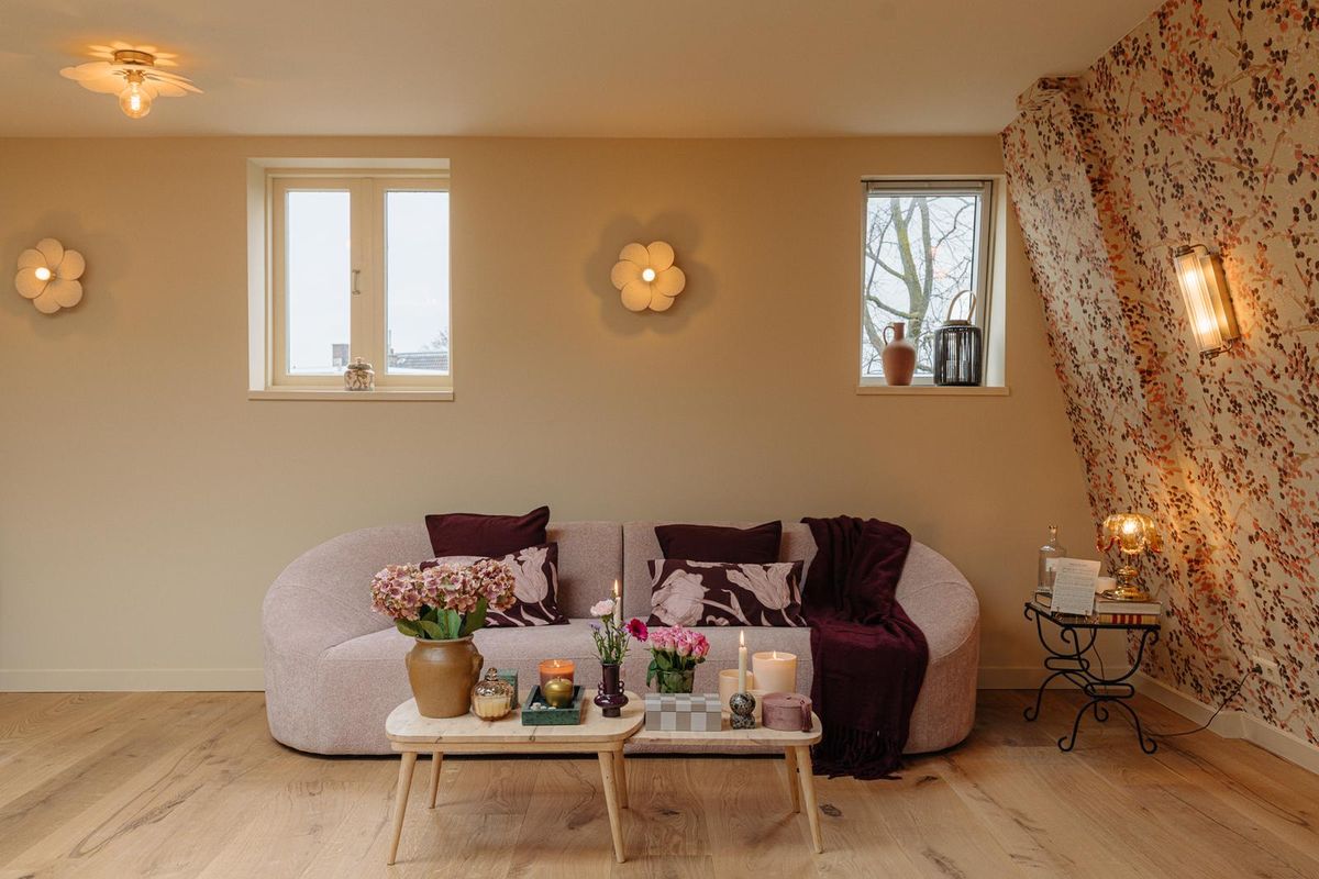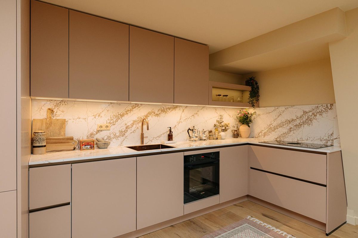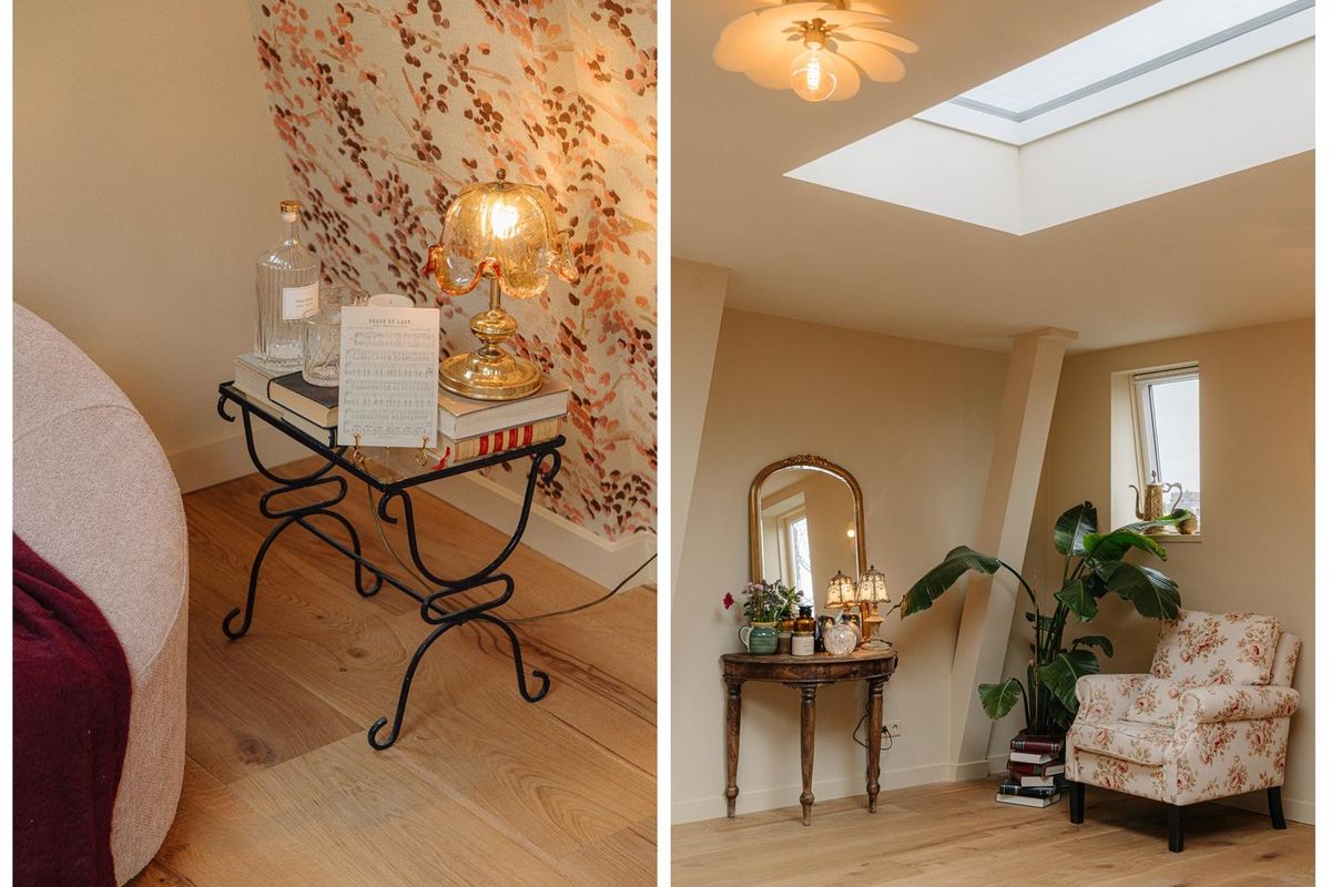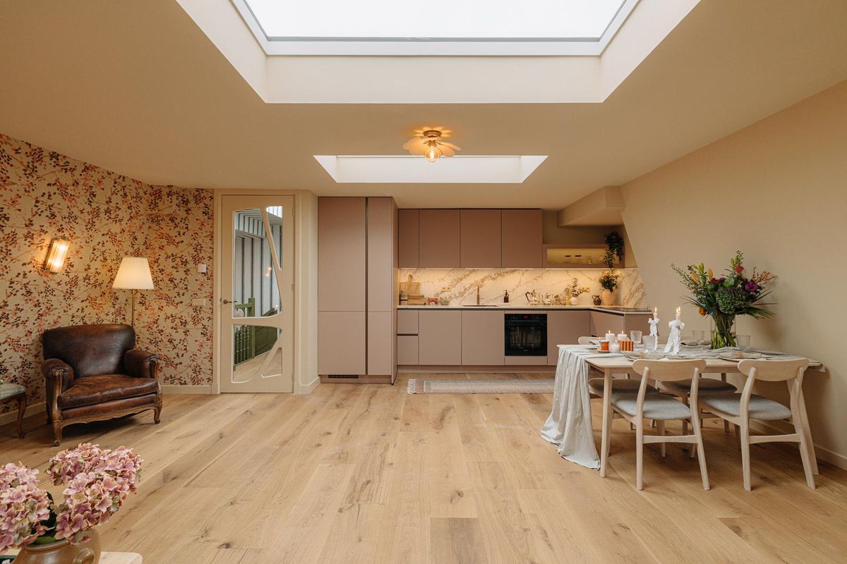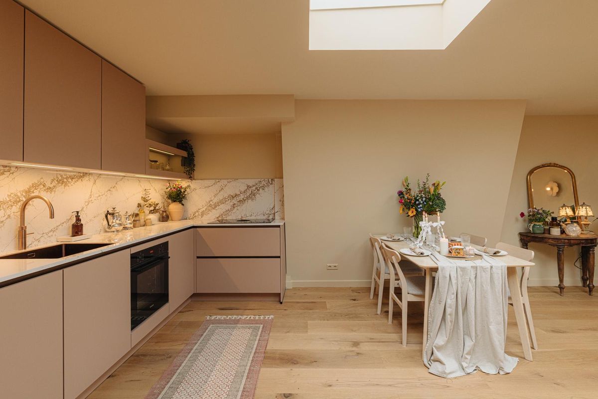 Zachte katoenkleuren vormen het palet van deze verdieping, waar Art Nouveau subtiel tot leven komt in de bloemvormige lampen, de op maat gemaakte deur en het hoogwaardig Elitis bloesembehang. De ruime living nodigt uit tot samenzijn; een eettafel bij de keuken, een comfortabele zithoek en een knusse leeshoek. De keuken rust op een prachtige Terra-kleurige basis, bekroond met een composieten natuurstenen aanrechtblad met bronzen aders dat elegant doorloopt op de achterwand. Een vitrinekast, speels uitgevoerd met rookglas en zacht geïntegreerde verlichting, etaleert uw mooiste servies als een stille hommage aan vakmanschap.