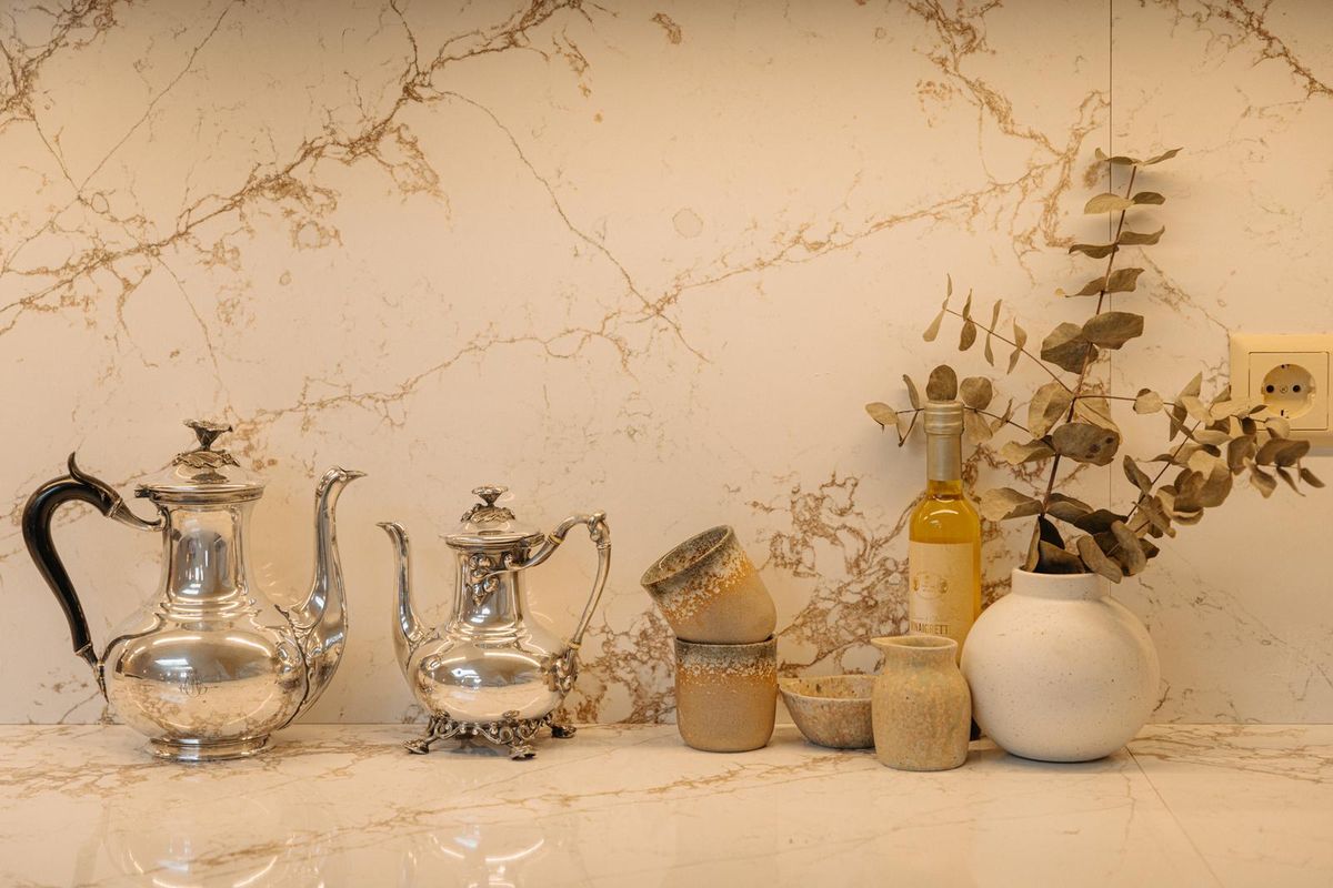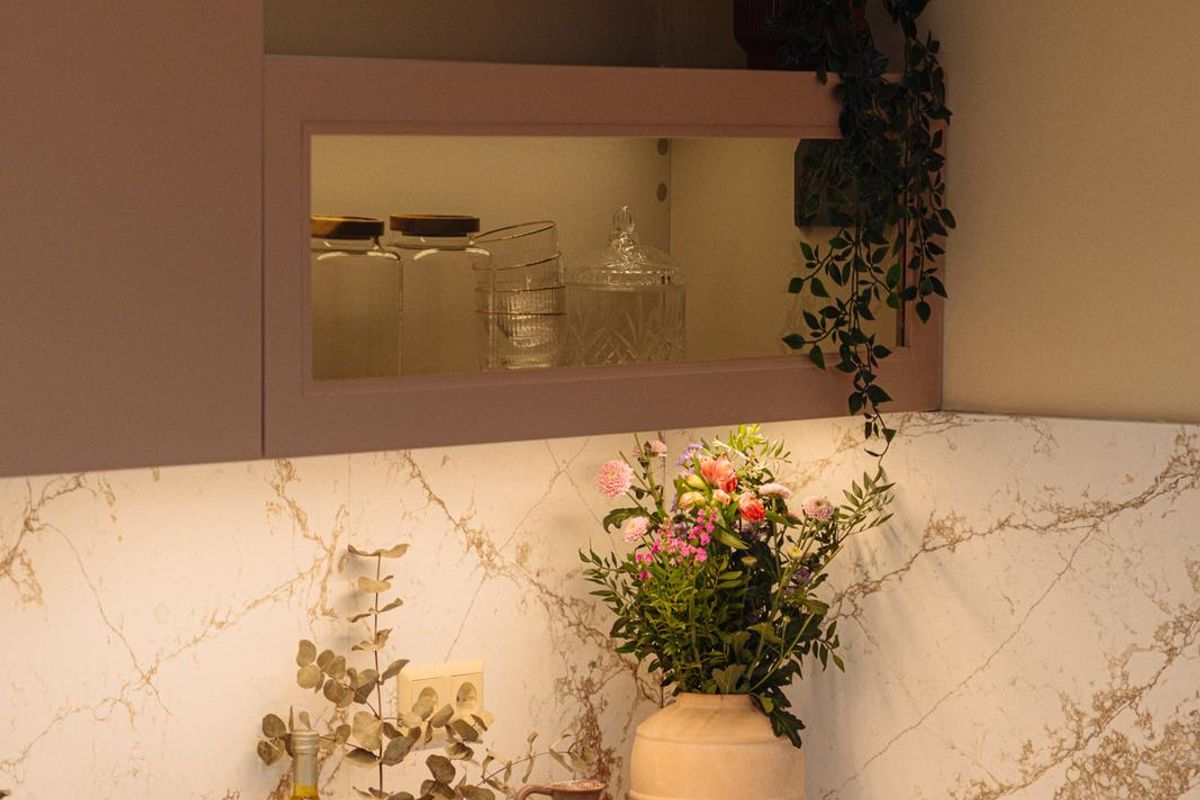 The kitchen rests upon a beautiful Terra-coloured base, crowned with a composite natural stone countertop veined in bronze, its elegance continuing seamlessly up the back wall. A display cabinet, playfully crafted from smoked glass and softly illuminated from within, showcases your finest tableware, a quiet homage to craftsmanship. Equipped with Siemens appliances, the kitchen features a cooktop with integrated Bora extraction and a Quooker Patina boiling-water tap, where innovation meets refinement.