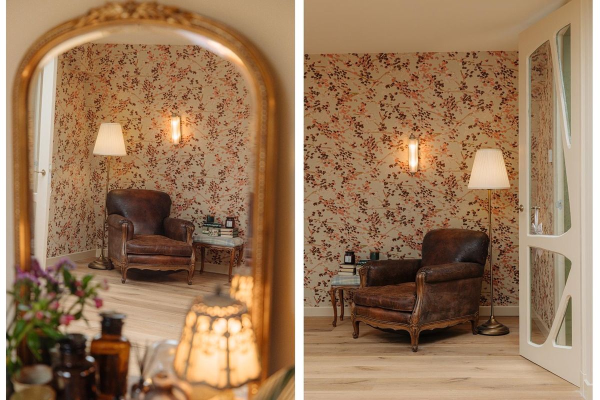Vanuit de gang toegang tot de badkamer, welke een oase van rust is, voorzien van vloerverwarming, een gietijzeren bad op pootjes, inloopdouche, dubbel wastafelmeubel met marmeren blad, stijlvolle verlichting én een unieke handgemaakte ‘Art Nouveau’ tegel uit Jeruzalem. Ook is er een separaat toilet met lambrisering in een diepe mosgroene tint. Het speelse behang, versierd met takken, bladeren en fruit, doet zijn naam eer aan ‘’Tree of Life’’. Het behang loopt over de muren en het plafond en creëert een warme, geborgen sfeer.