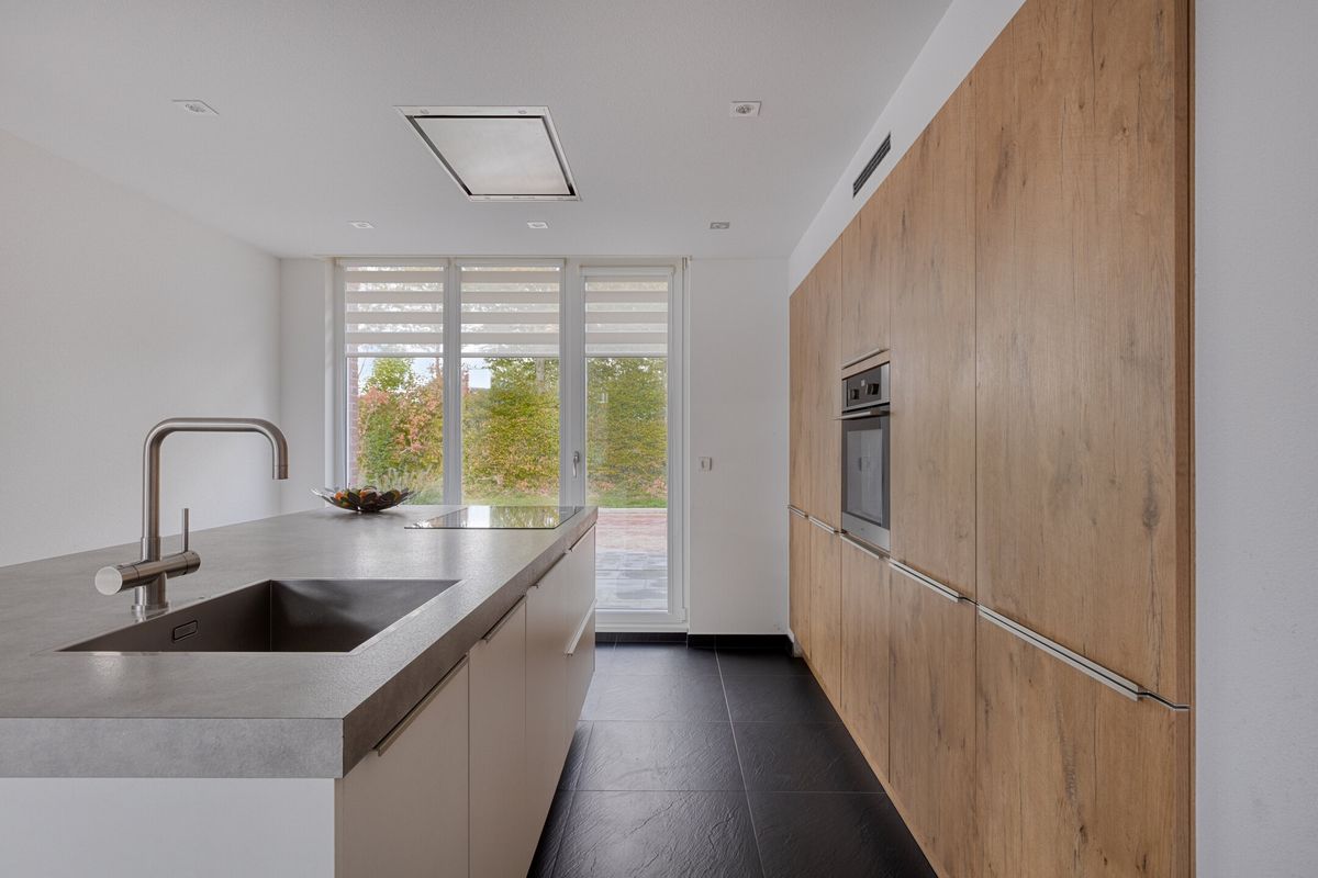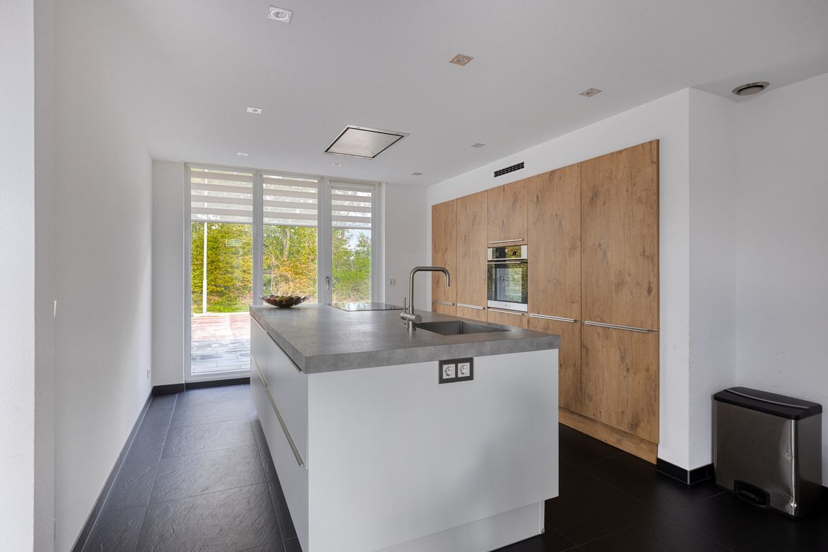 De moderne woonkeuken is met ca. 24 m2 een echte eyecatcher en vormt het hart van het huis. Uitgerust met een kook-spoeleiland en een kastenwand met inbouwapparatuur is dit een heerlijke plek om te koken en gezellig na te tafelen. In de keukenruimte bevindt zich tevens de ruime eethoek. De ruimtes hebben een fraaie vloer- en wandafwerking en dankzij de grote raampartijen geniet je hier de hele dag van natuurlijk licht.
