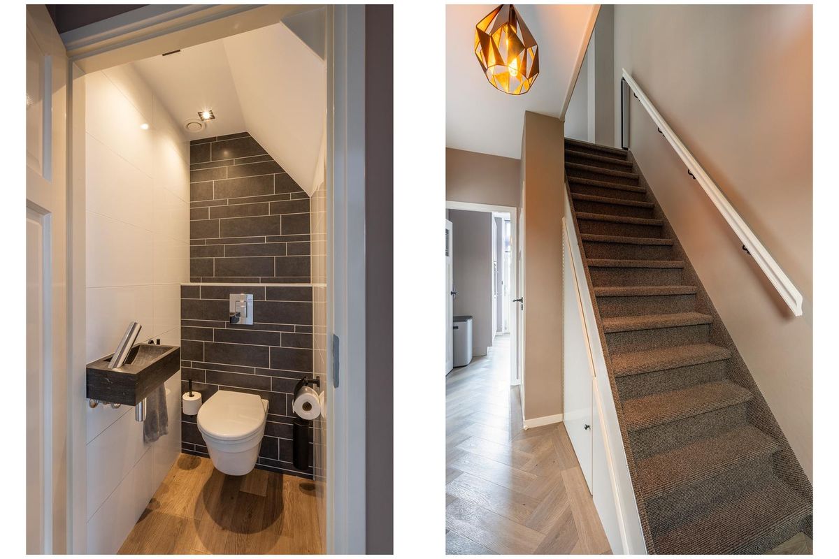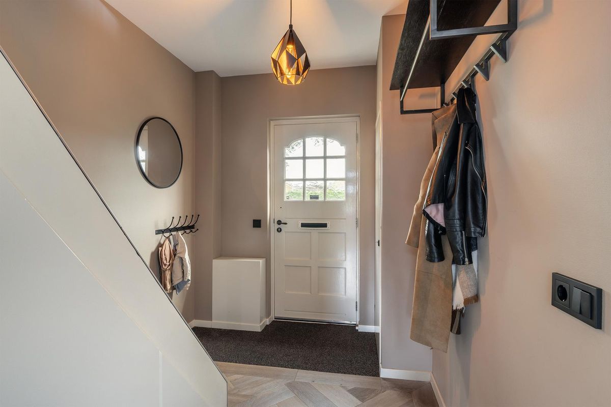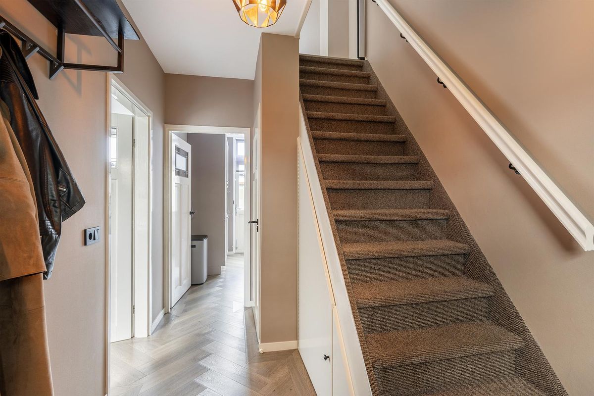 Hal/entree met de meterkast (8 groepen, fornuisgroep, krachtstroomgroep, slimme meters en glasvezelaansluiting), geheel betegeld hangtoilet met fontein en ventilator, trapopgang, trapkast en toegang tot de woonkamer en keuken. De pvc-vloer is doorgelegd over de gehele begane grond en voorzien van vloerverwarming.