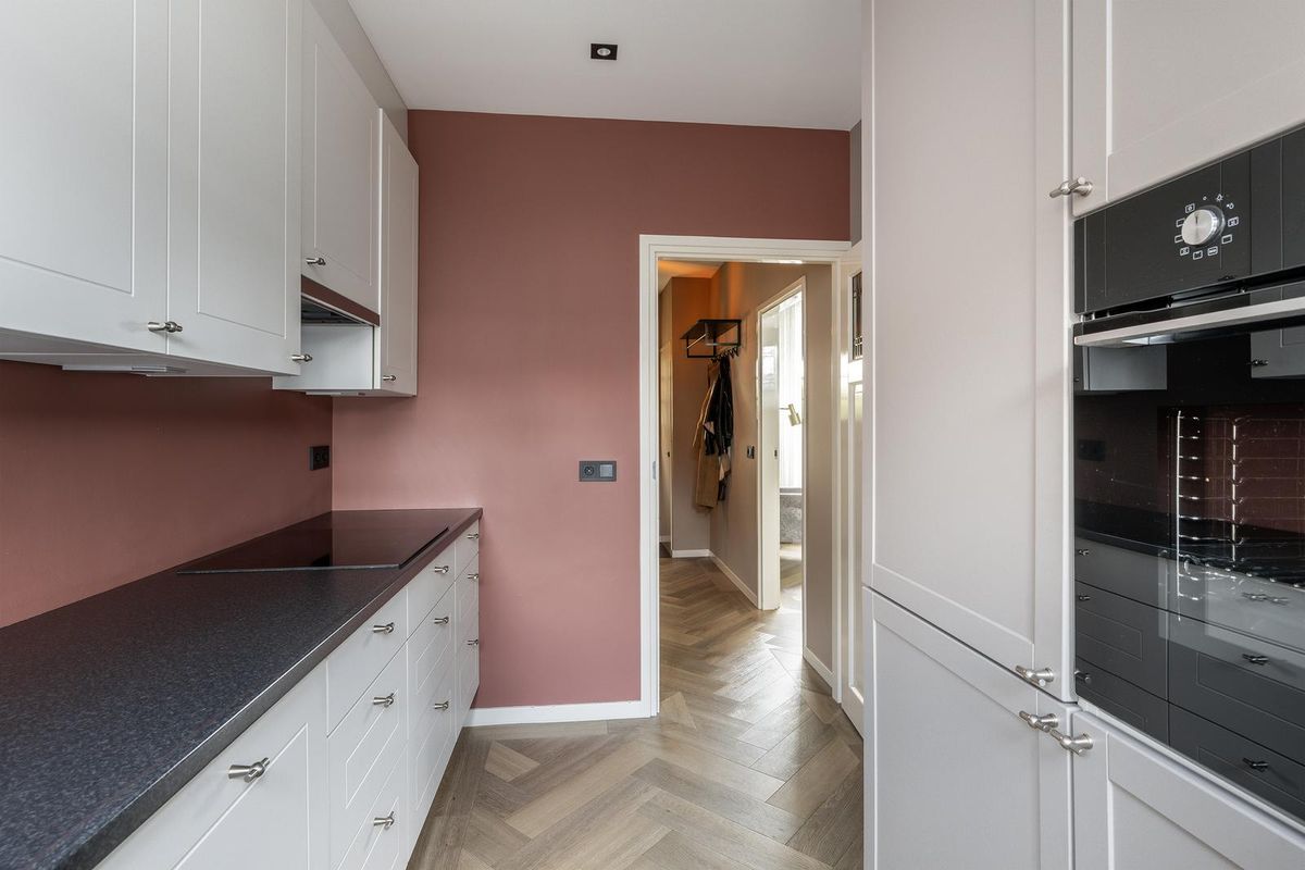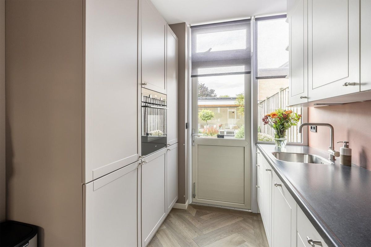 De keuken is in parallelopstelling geplaatst en uitgerust met een 4-groepsinductiekookplaat, afzuigkap, oven, koel-vriescombinatie, vaatwasser, spoelbak, bovenkasten, inbouwspots en een achterdeur.