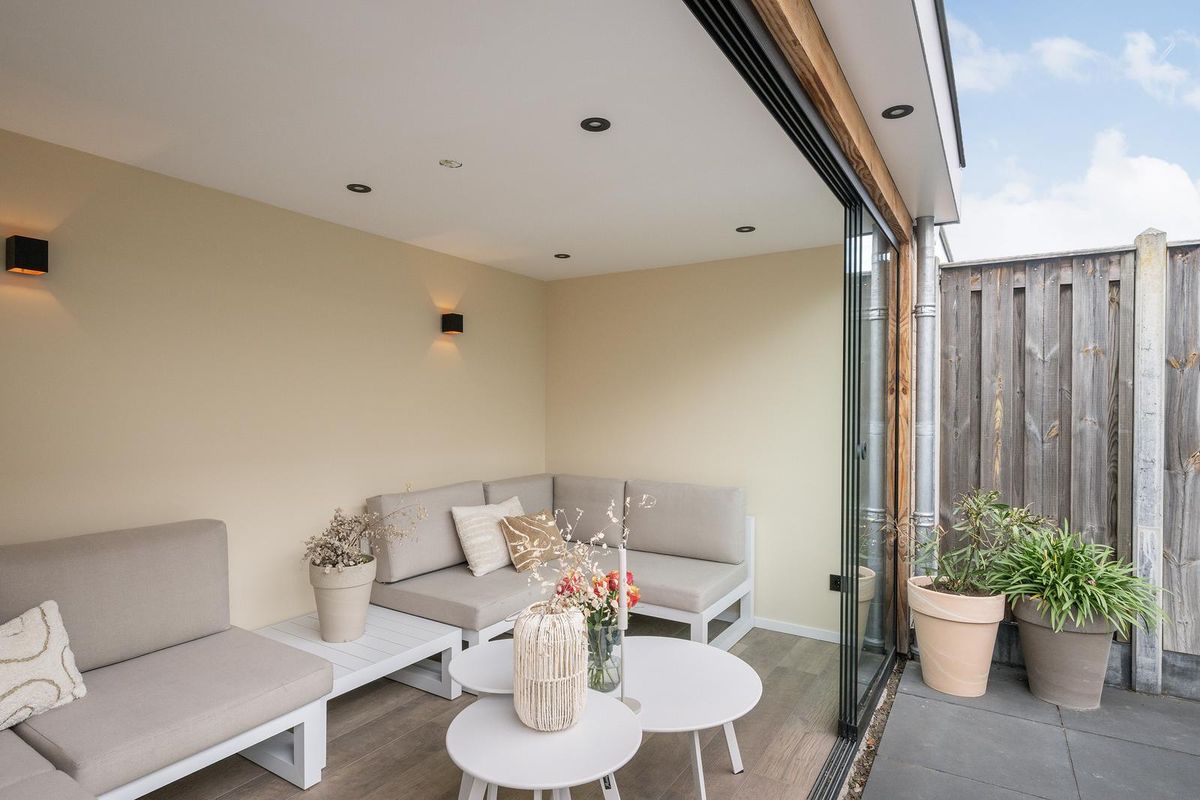 Luxe tuinkamer met glazen schuifwand, inbouwspots en elektra.