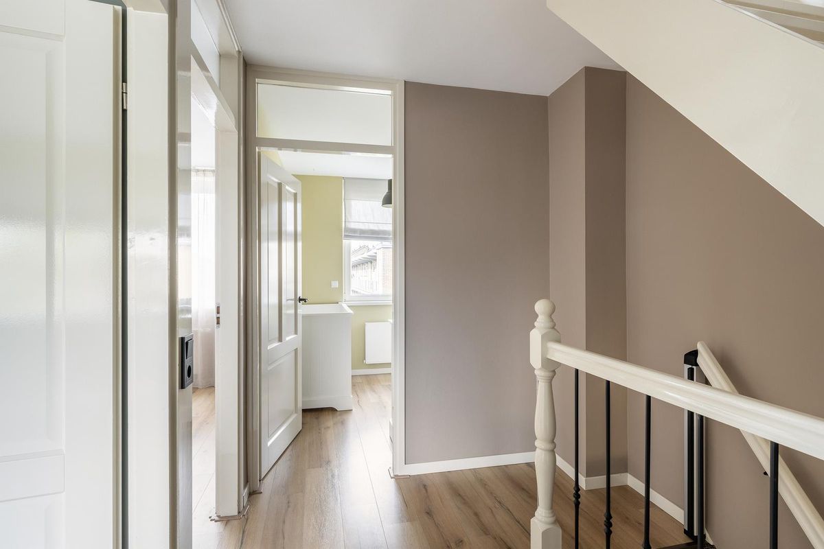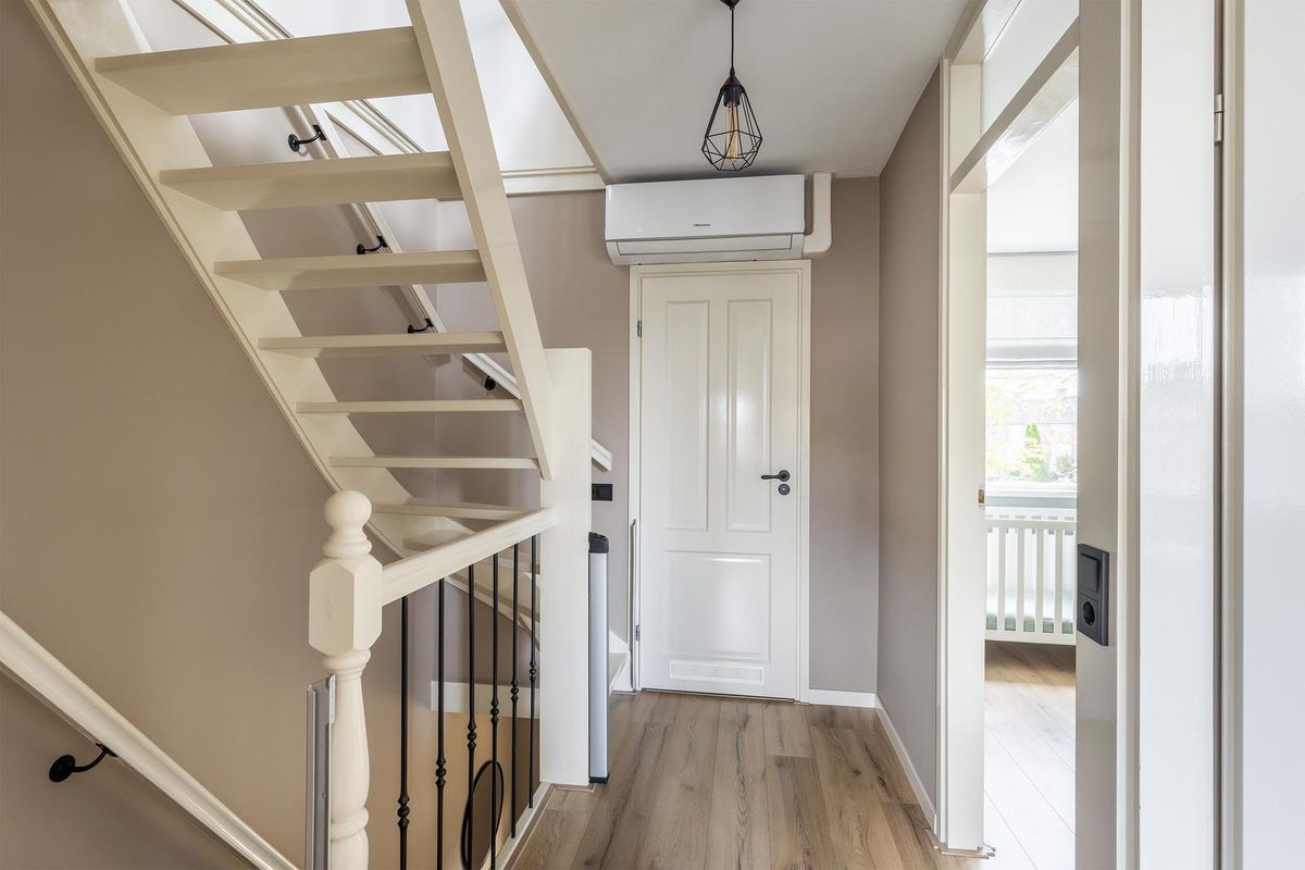 Overloop met airco-unit (voor verwarming en koeling) en toegang tot 3 slaapkamers, de badkamer en de 2e verdieping middels een vaste trap. De laminaatvloer is doorgelegd in alle slaapkamers.