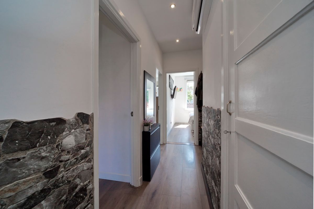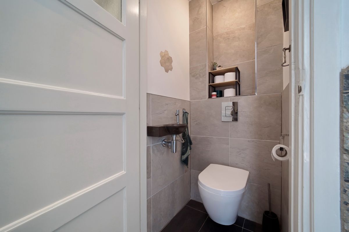 De badkamer is voorzien van een moderne regendouche en wastafelmeubel. Het toilet is separaat en bevindt zich in de hal. Handig is ook de aparte wasruimte met aansluitingen voor wasmachine en droger en extra opbergruimte.