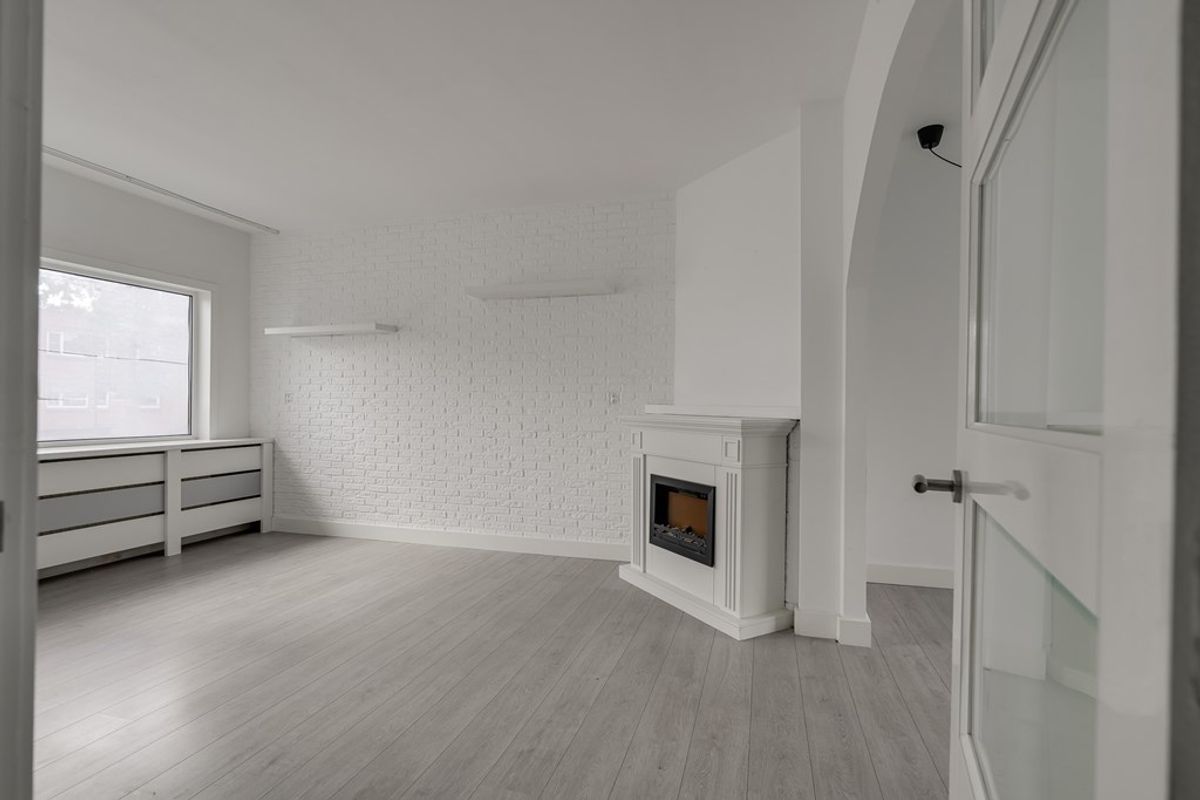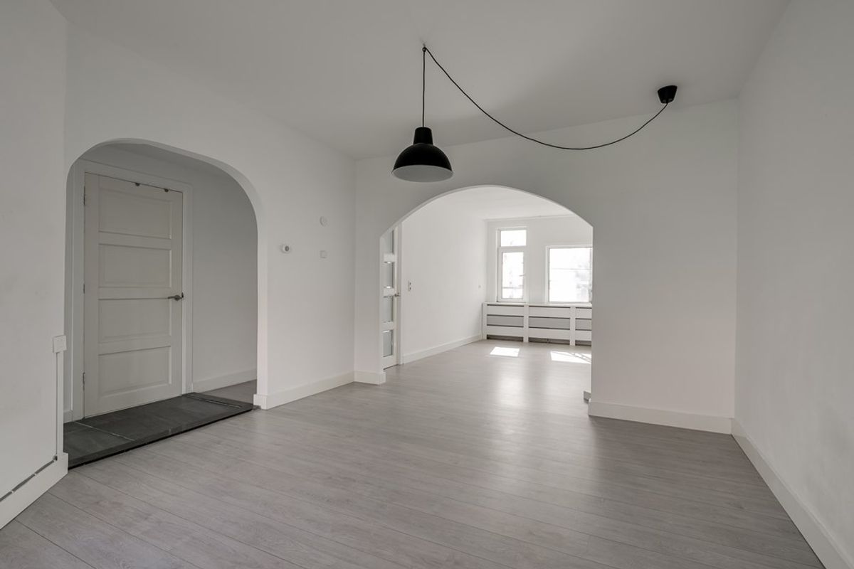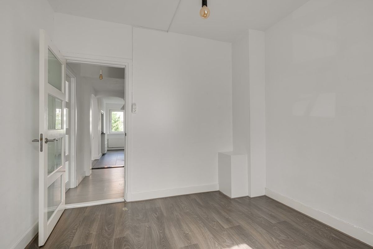 Via de gezamenlijke entree en trap bereik je de woning op de eerste verdieping. De ruime woonkamer biedt voldoende plek voor zowel een comfortabele zithoek als een eettafel. Aan de voorzijde bevindt zich een slaapkamer. Direct naast de woonkamer ligt een extra kamer die eenvoudig kan worden ingericht als tweede slaapkamer of als werkruimte.
