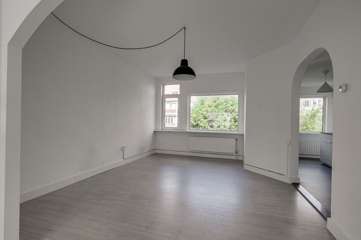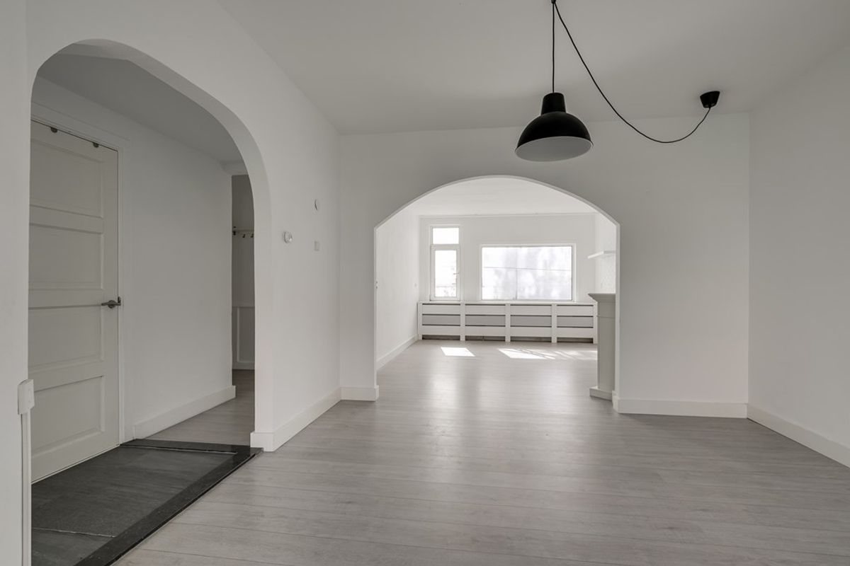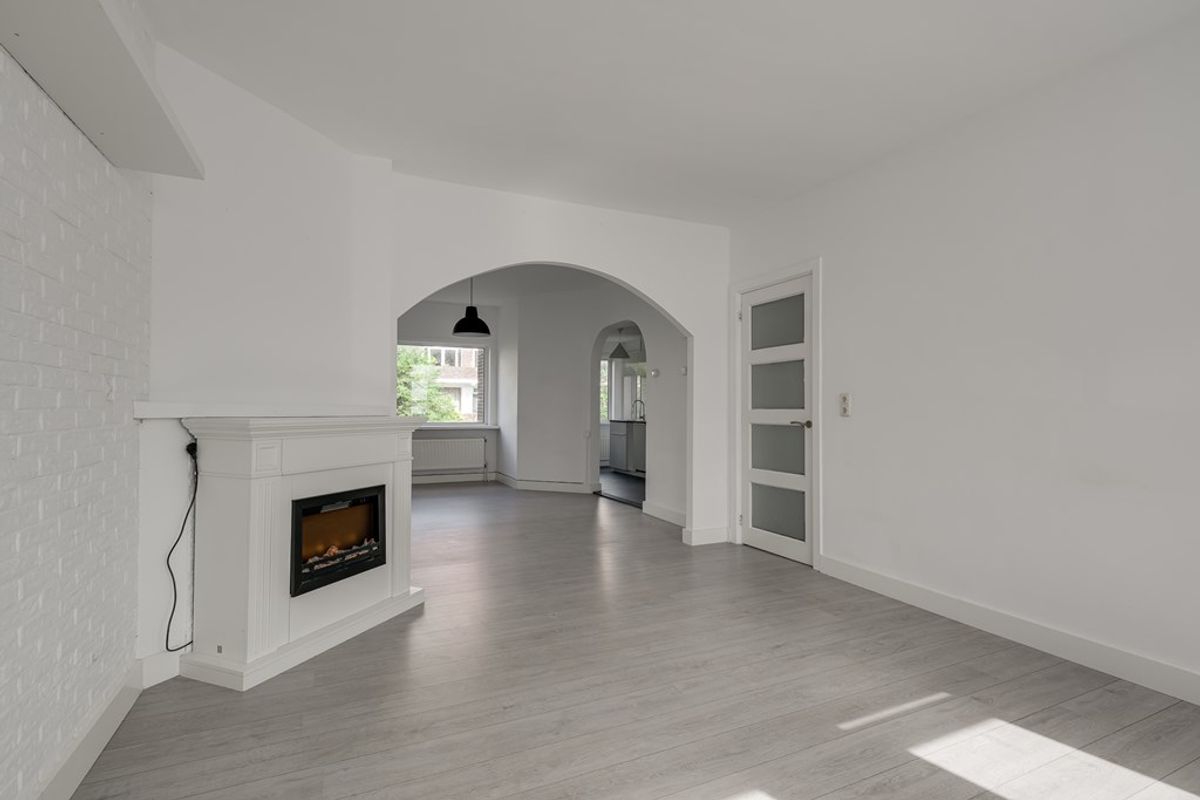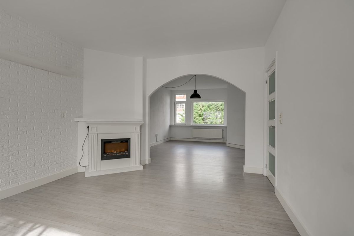 Via de gezamenlijke entree en trap bereik je de woning op de eerste verdieping. De ruime woonkamer biedt voldoende plek voor zowel een comfortabele zithoek als een eettafel. Aan de voorzijde bevindt zich een slaapkamer. Direct naast de woonkamer ligt een extra kamer die eenvoudig kan worden ingericht als tweede slaapkamer of als werkruimte.