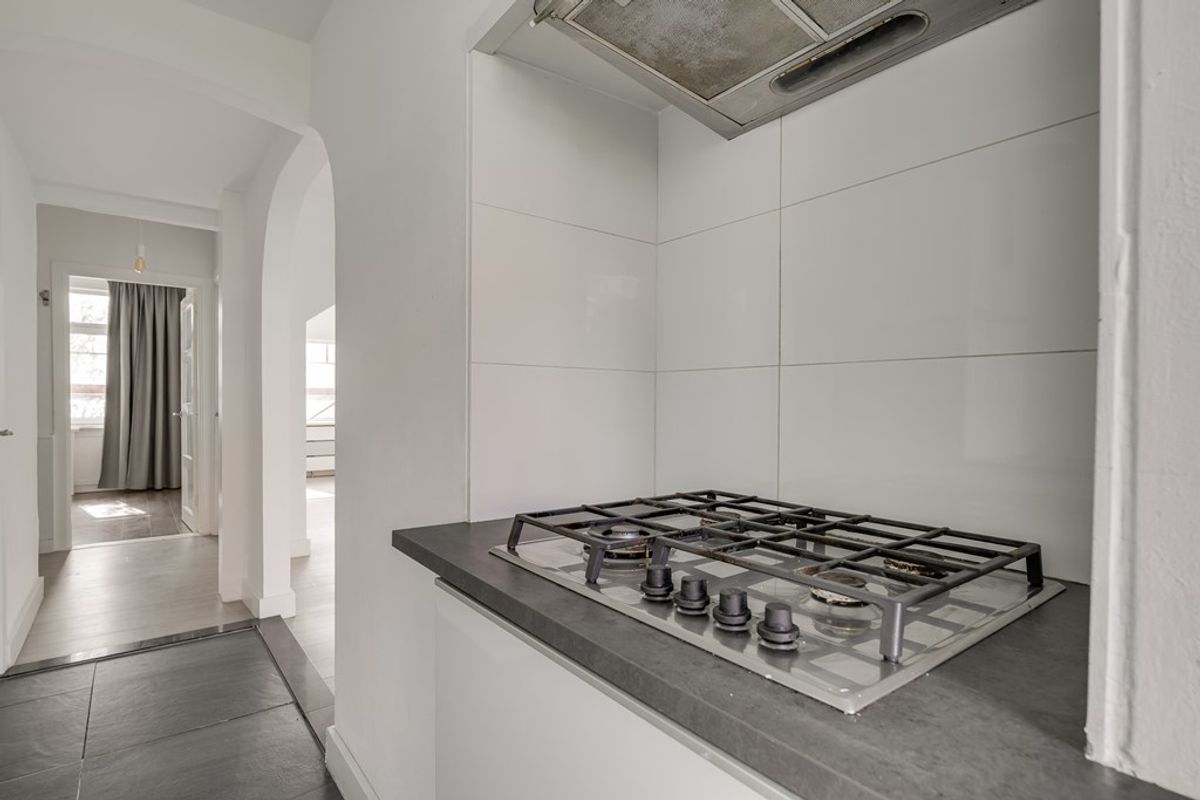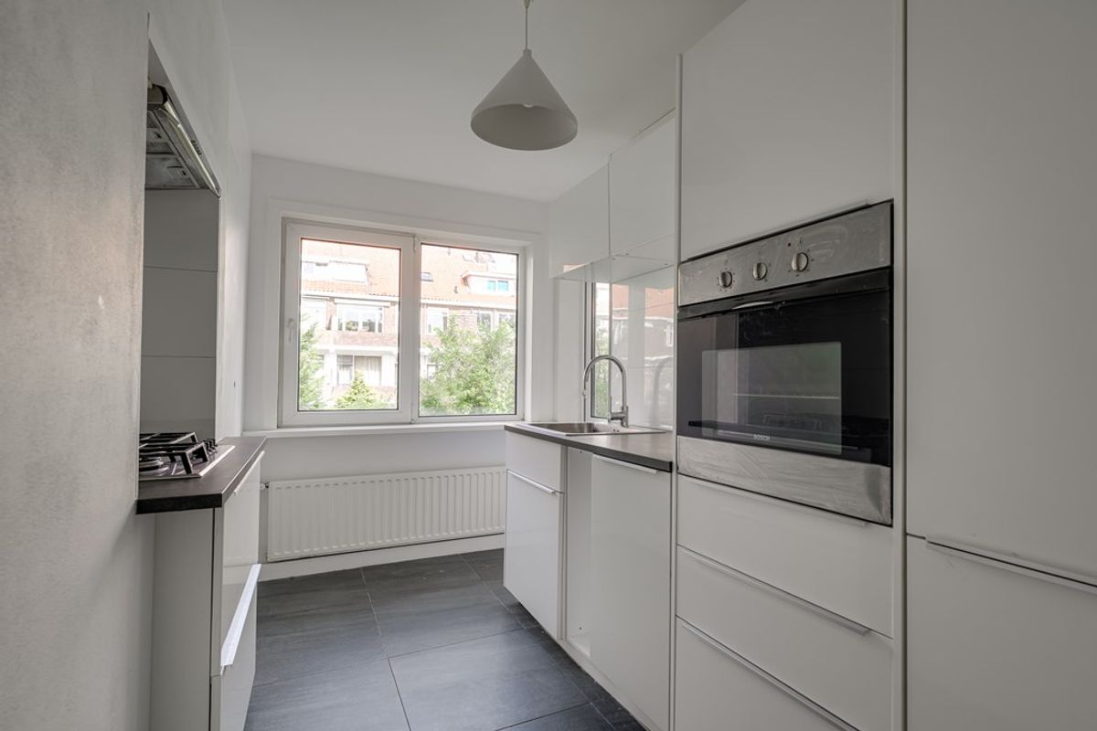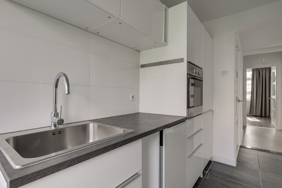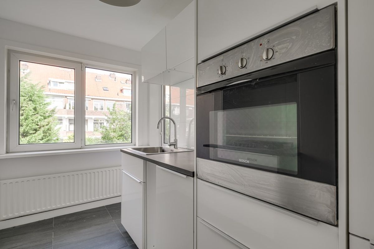 De keuken ligt aan de achterzijde van de woning en is uitgerust met diverse inbouwapparatuur, waaronder een vaatwasser, 4-pits gasfornuis, afzuigkap, oven en koel-/vriescombinatie. Vanuit de keuken is er toegang tot het balkon.