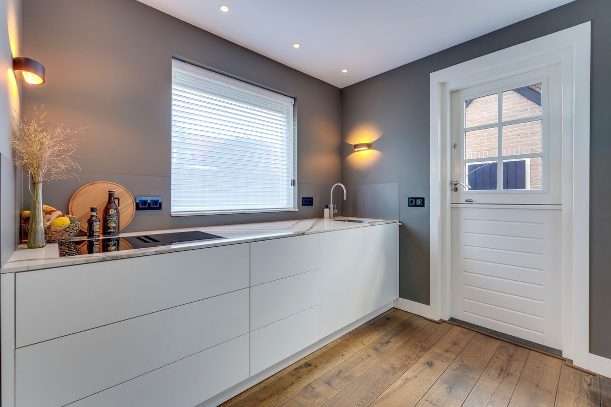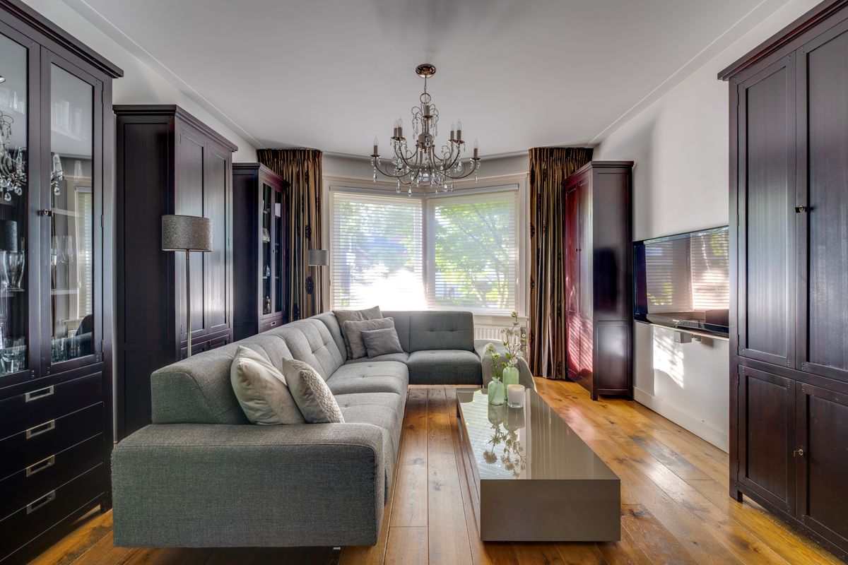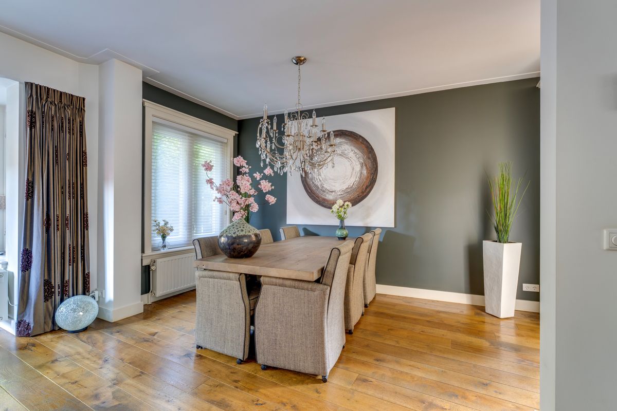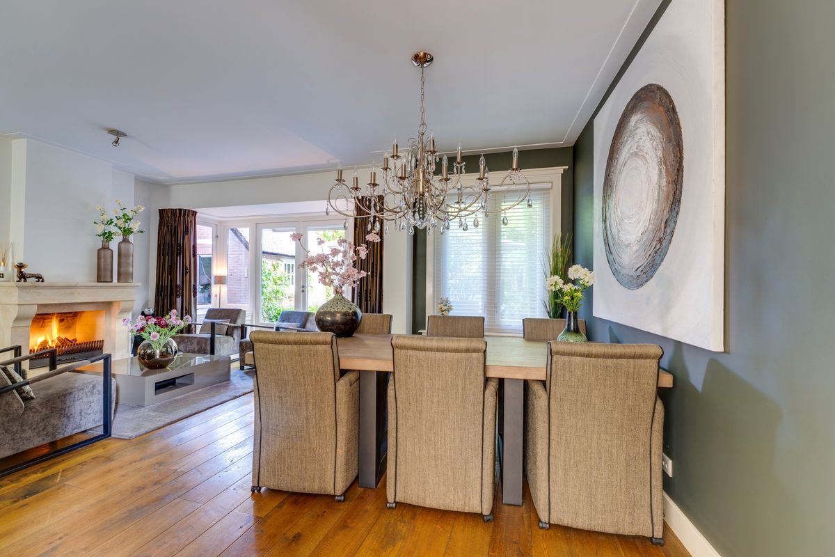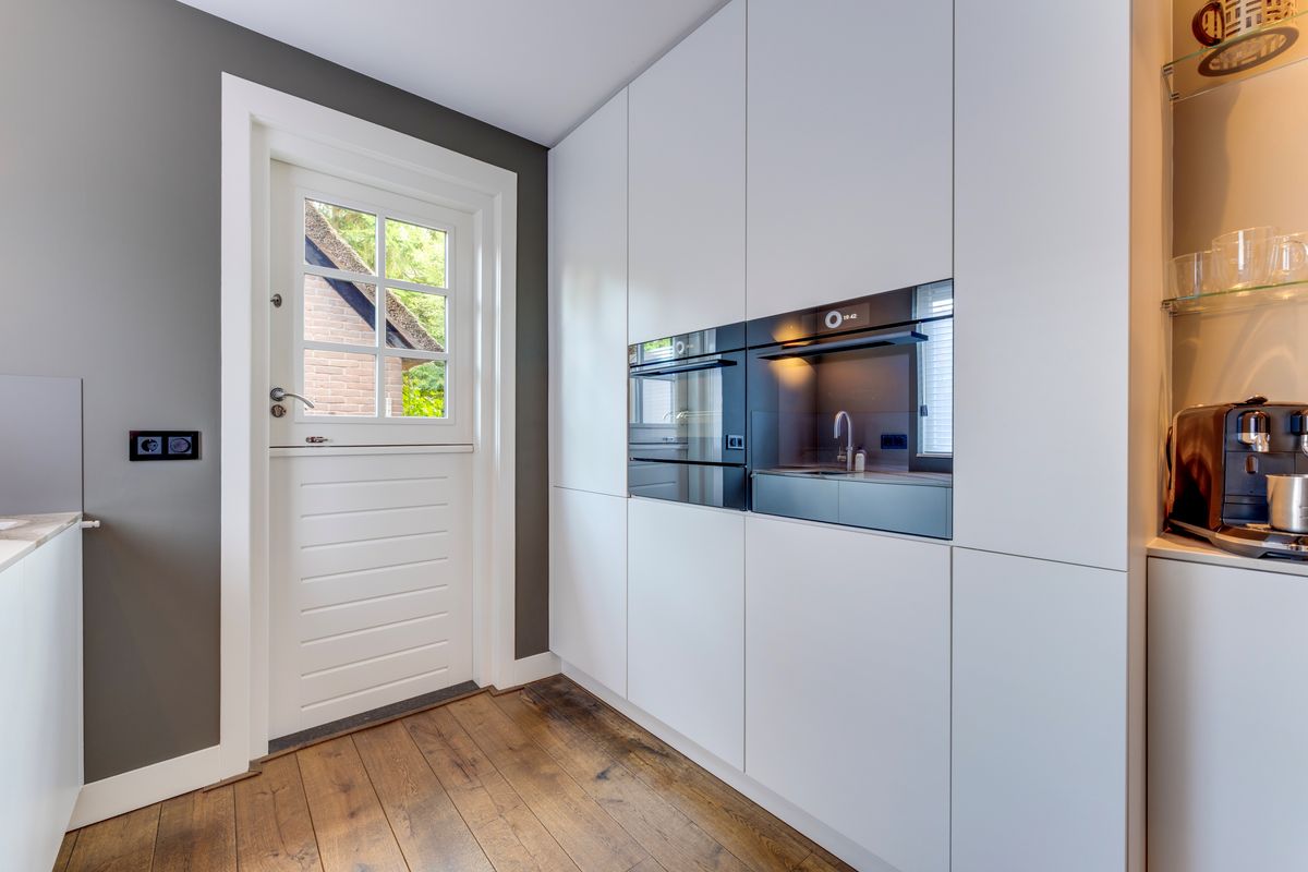 De woonkamer is een heerlijke leefruimte waar licht, rust en comfort samenkomen. De eikenhouten vloer loopt naadloos door en verbindt de zithoek, eethoek en keuken tot één geheel. In de erker aan de voorzijde staat de bank; hier kun je ontspannen, tv kijken of genieten van het uitzicht op de voortuin. Langs de zijwand zorgt een stijlvolle gashaard voor extra warmte en sfeer. Verder naar achteren is er volop ruimte voor een grote eettafel – perfect voor gezellige diners of lange avonden met vrienden. De grote ramen en openslaande deuren aan de achterzijde laten het daglicht rijkelijk binnen en zorgen voor een directe verbinding met de tuin. De keuken is in 2022 volledig vernieuwd en combineert strak design met hoogwaardige kwaliteit. Het geheel is modern, licht en tot in detail doordacht, met greeploze kasten en een stijlvol werkblad dat perfect aansluit op de rest van het interieur. Koken doe je hier op topniveau met apparatuur van het Zwitserse merk V-ZUG – een naam die staat voor innovatie en precisie, vergelijkbaar met Gaggenau en de meest exclusieve lijnen van Miele. Blikvangers zijn de multifunctionele oven en de stoomoven uit de V6000 Excellence Line serie. Daarnaast beschik je over een inductiekookplaat met geïntegreerde afzuiging van V-ZUG, een V-ZUG vaatwasser, een Quooker en een ruime koelkast met BioFresh laden van Liebherr. Via de charmante boerendeur stap je zo het terras op, en samen met het grote raam zorgt dit voor een aangename lichtinval. In de kelder vind je bovendien een aparte vriezer – ideaal voor extra voorraad.