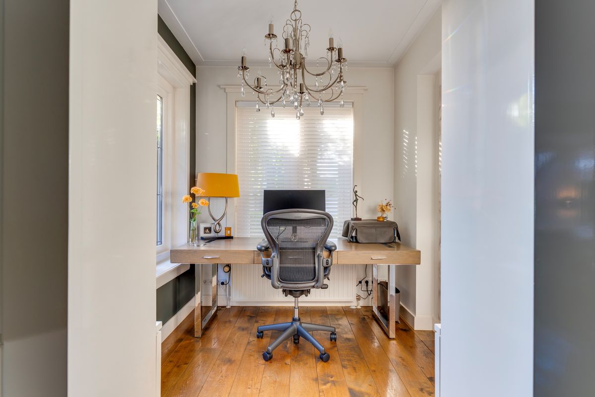 Je stapt binnen in een ruime en sfeervolle hal die direct het karakter van de woning weerspiegelt: licht, verzorgd en met oog voor detail. Het glas-in-lood en de opvallende rode trapbekleding geven de entree net dat beetje extra. In de hal vind je het moderne toilet, de meterkast en de toegangsdeur naar de kelder. Aan de voorzijde ligt een rustige werkkamer, momenteel ingericht als thuiskantoor. Een fijne plek om te werken, studeren of je even terug te trekken.