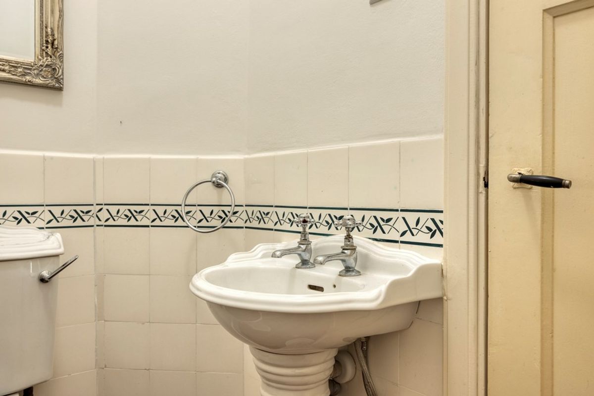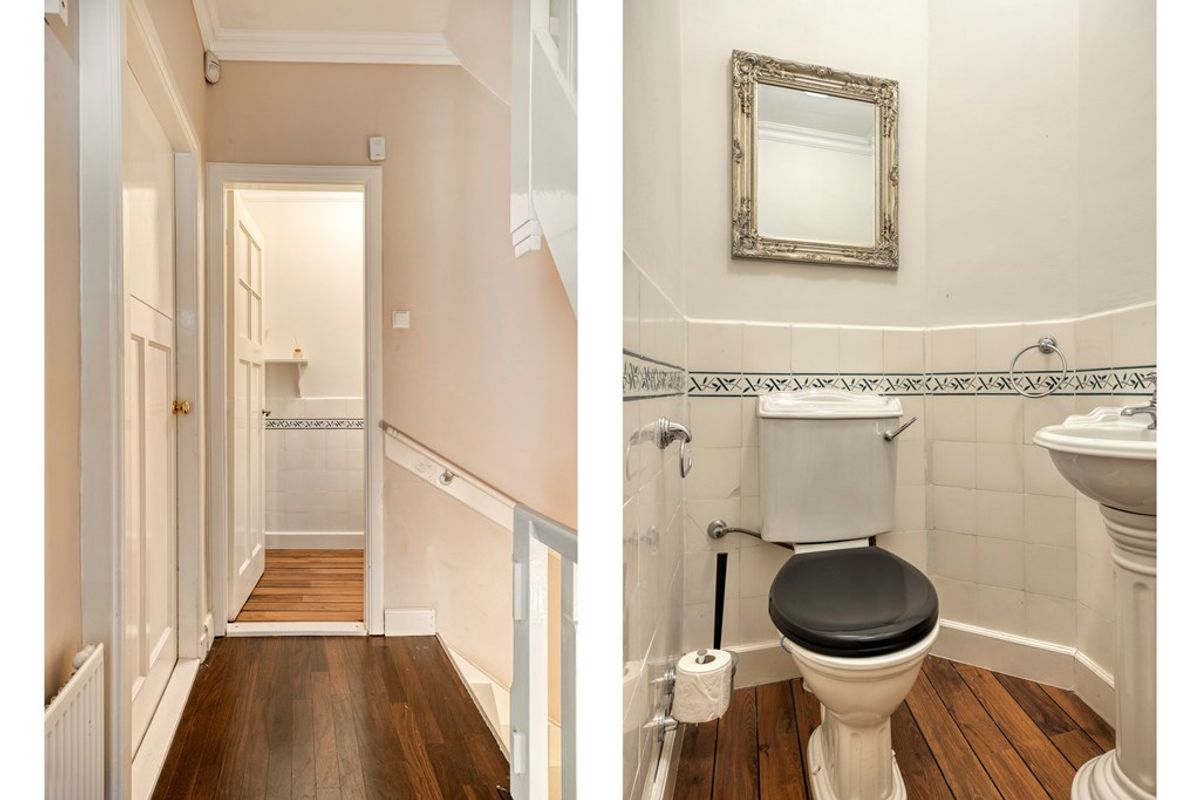First floor: The landing includes a toilet and stairs to the second floor. It also provides access to the living room and kitchen. Spacious, inviting living room en suite with ornamental ceiling and a large bay window with stained glass at the front of the house. This entire floor has stucco walls and laminate flooring.