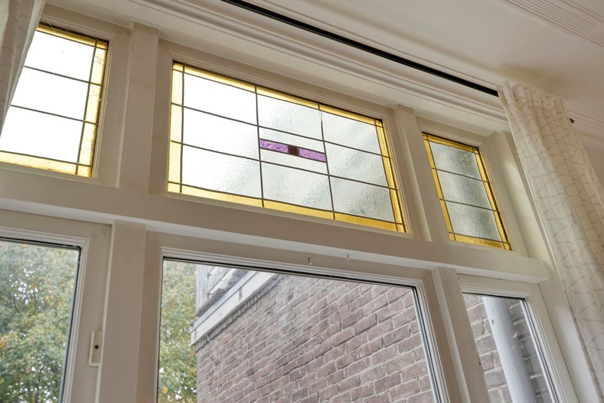 Eerste verdieping: de overloop is voorzien van een toiletruimte en een trapopgang naar de tweede verdieping. Daarnaast geeft de overloop toegang tot de woonkamer en de keuken. Ruime sfeervolle woonkamer-en-suite met ornamentenplafond en een grote erker v.v. glas-in-lood aan de voorzijde van de woning. Deze gehele woonlaag is voorzien van een stucwandafwerking en een laminaatvloer afwerking.