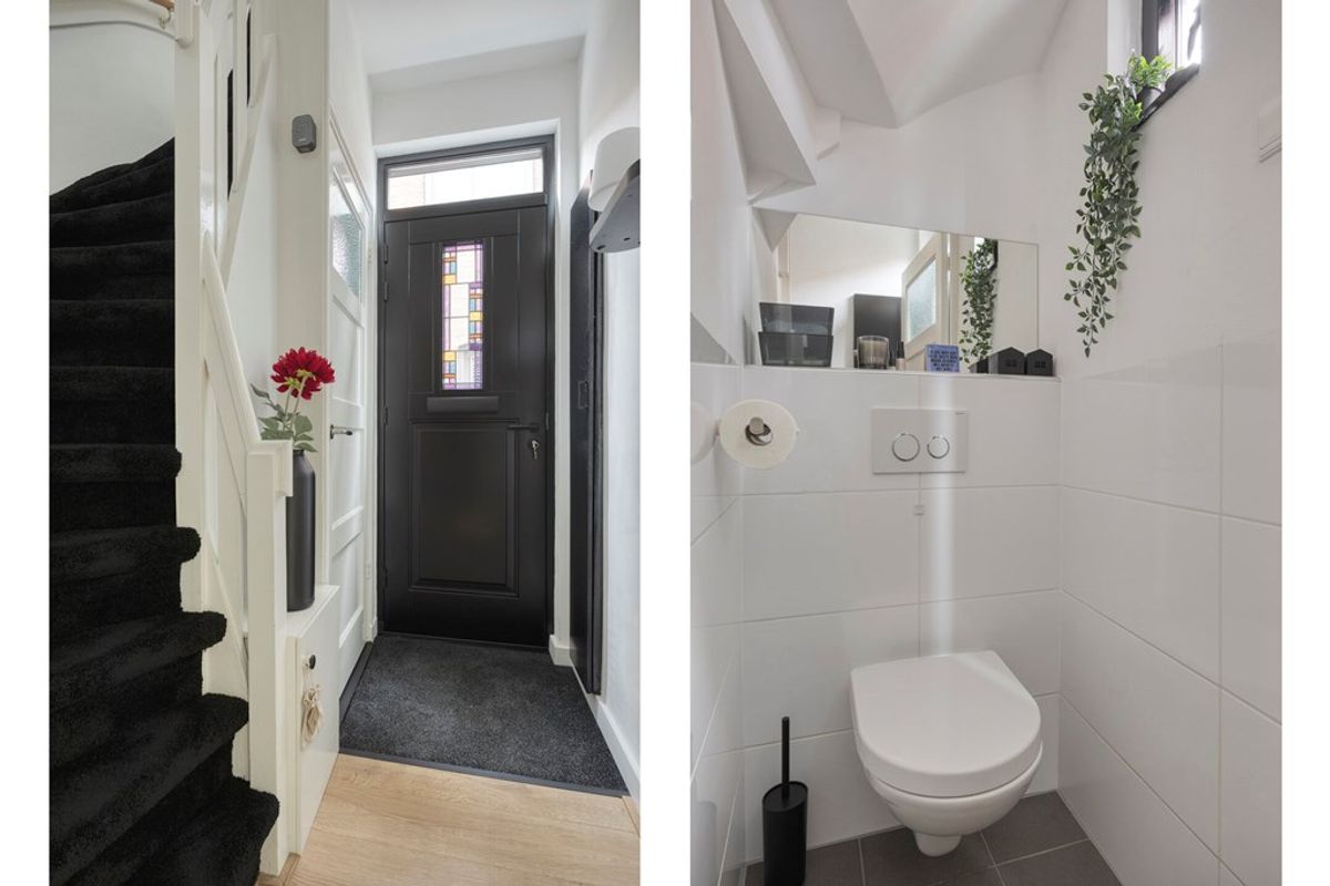 Hal met toiletruimte, trap naar de verdieping en toegang tot de woonkamer.