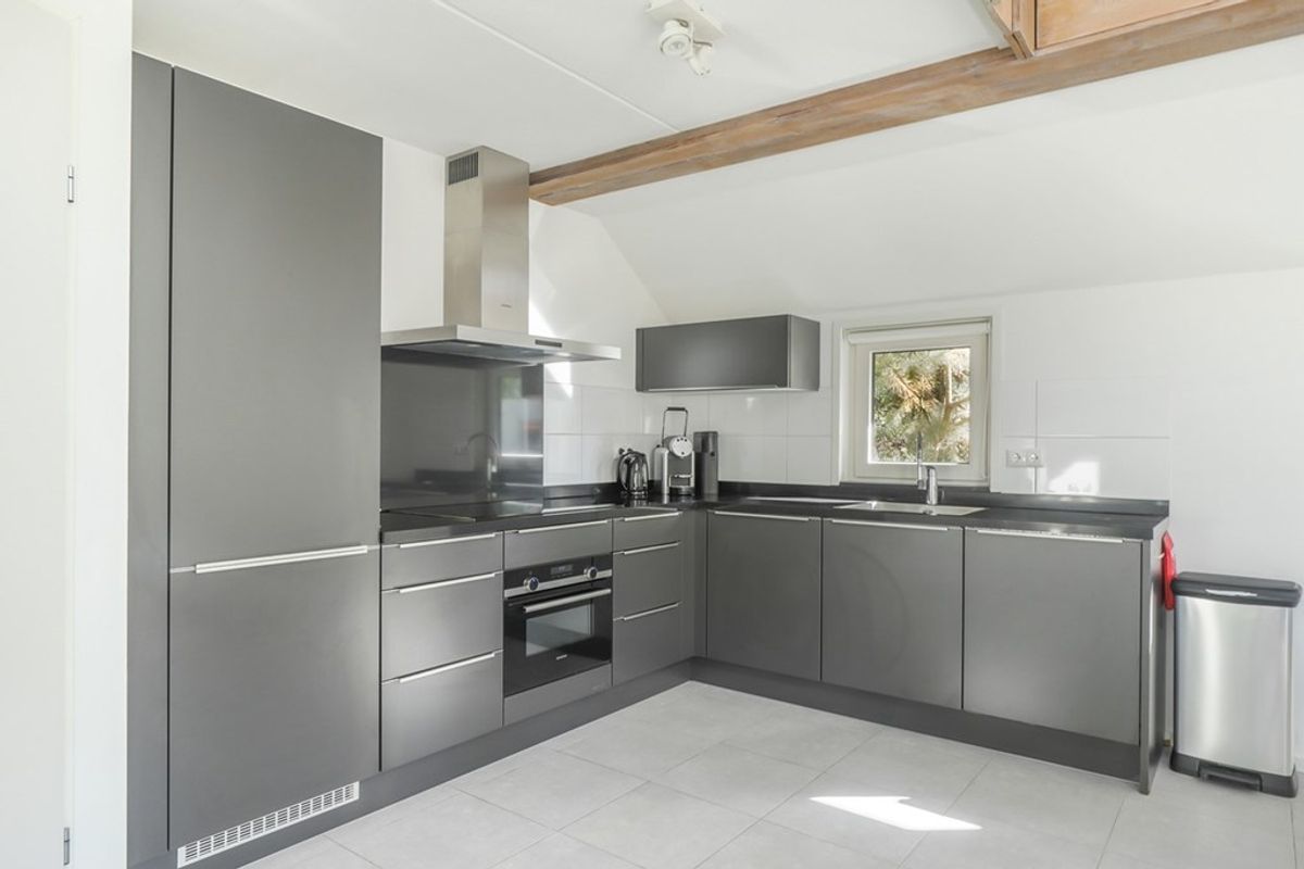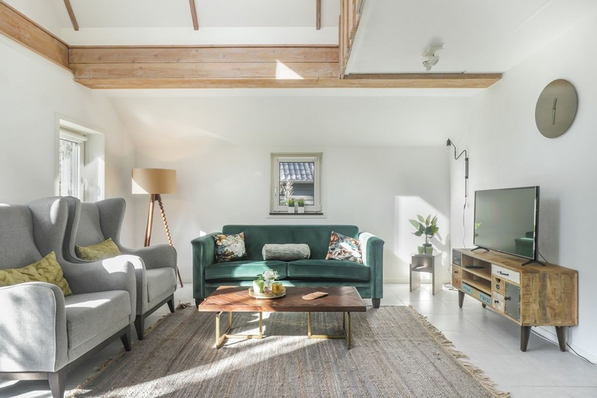 De woonkamer ligt aan de voorzijde, heeft dubbele deuren naar het terras en een zeer sfeervolle vide tot de nok van de woning.