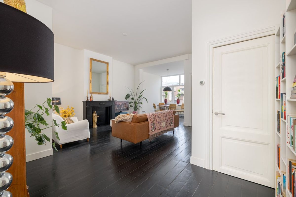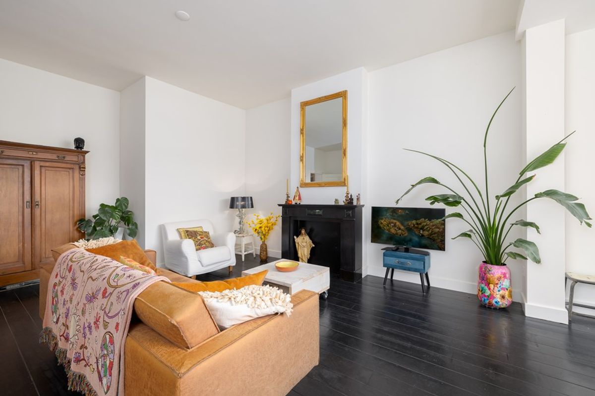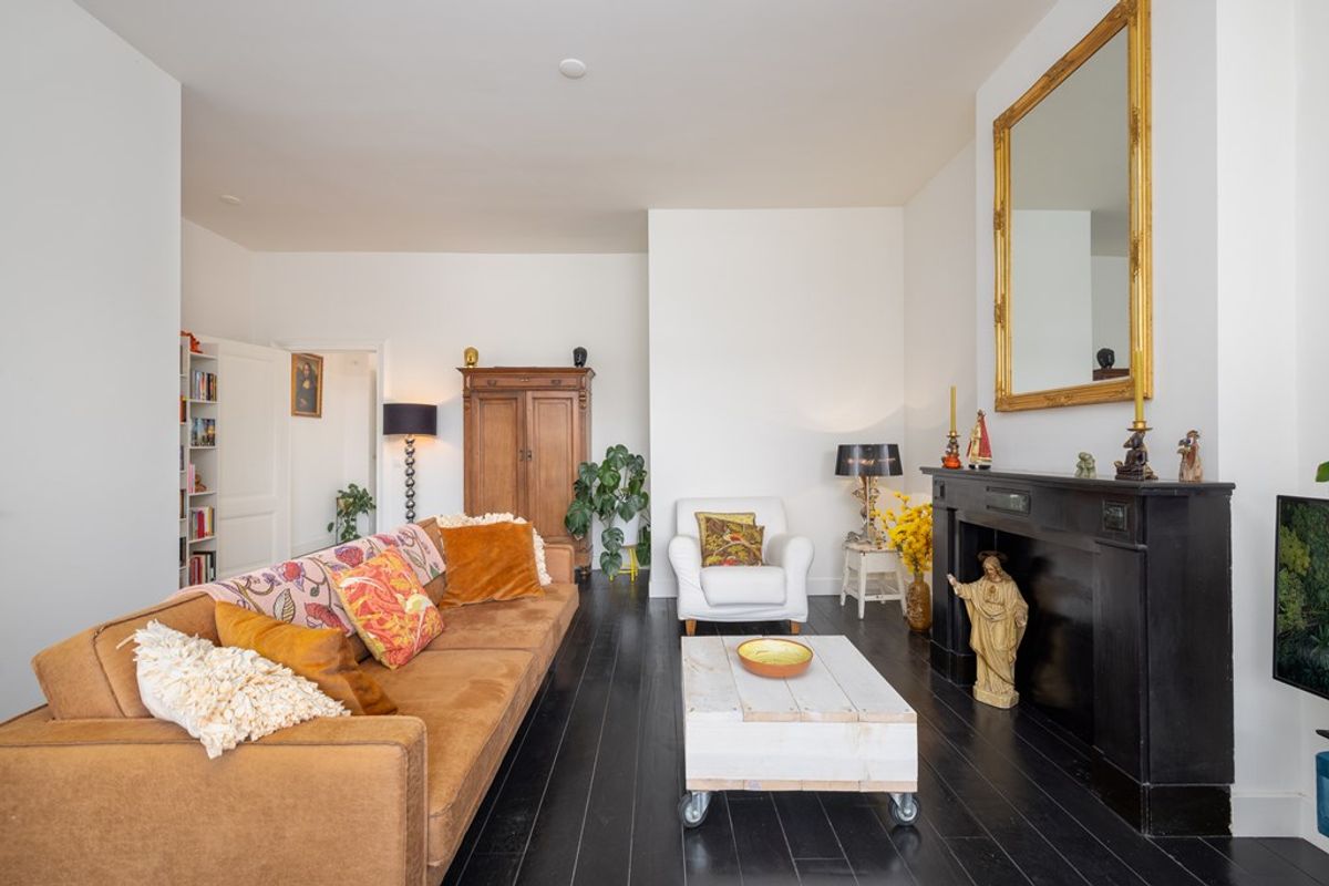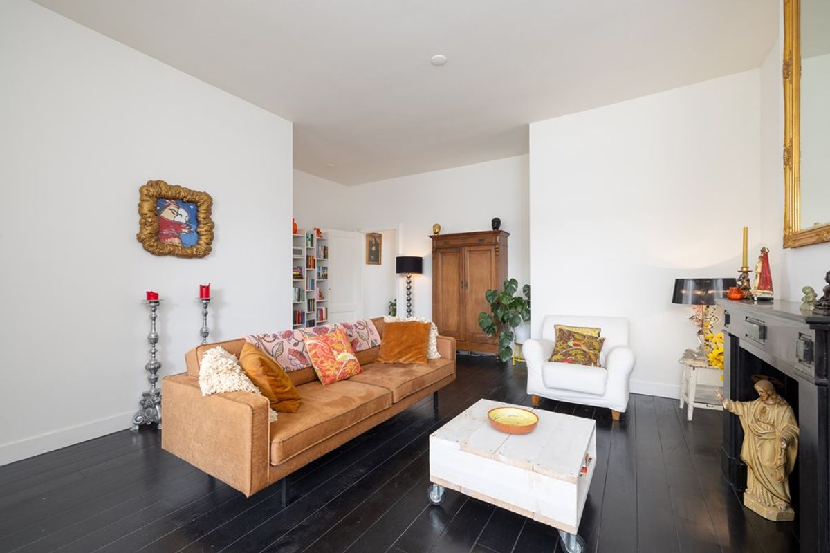 Het leefgedeelte bevindt zich aan de achterzijde van de woning en vormt direct het hart van het appartement. De hoge plafonds en grote raampartijen zorgen voor een indrukwekkende lichtinval en versterken het ruimtelijke gevoel. De stijlvolle donkere vloer in combinatie met de klassieke schouw geeft de woonkamer karakter en warmte. Een ruimte die uitnodigt tot ontspannen én ontvangen.