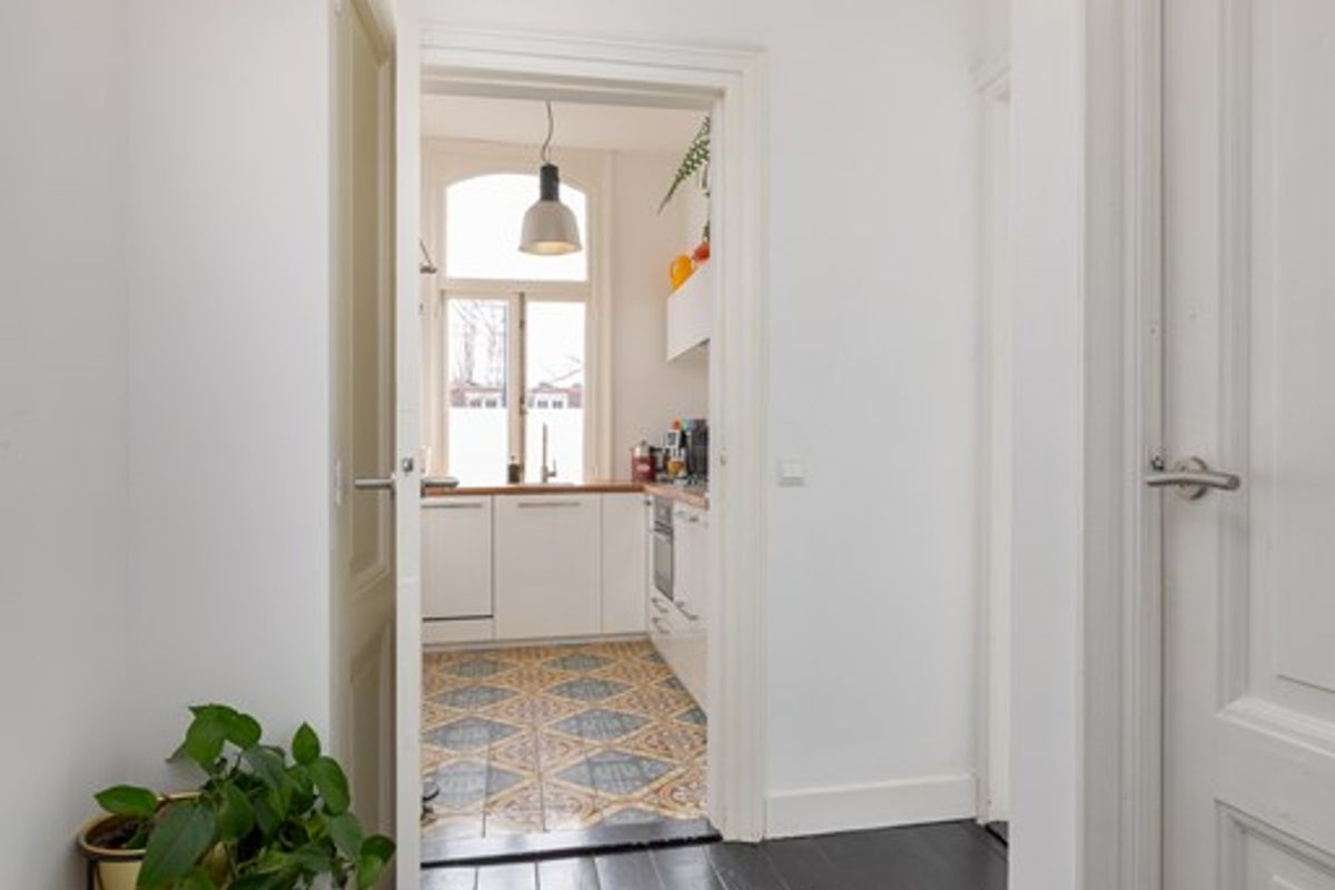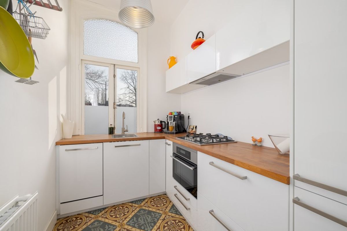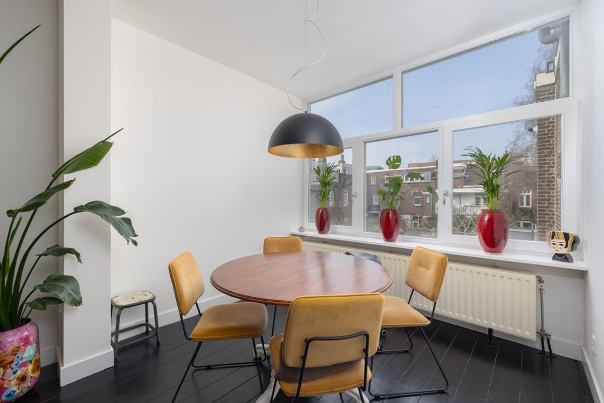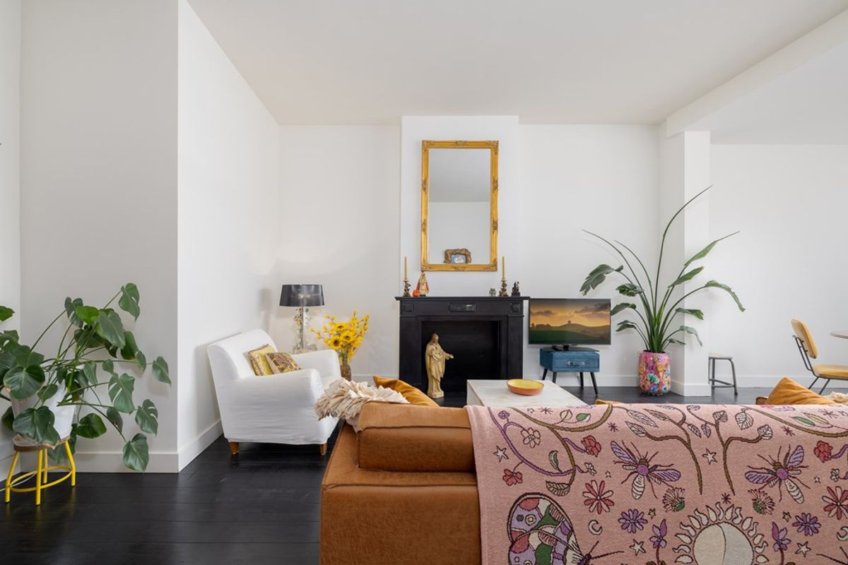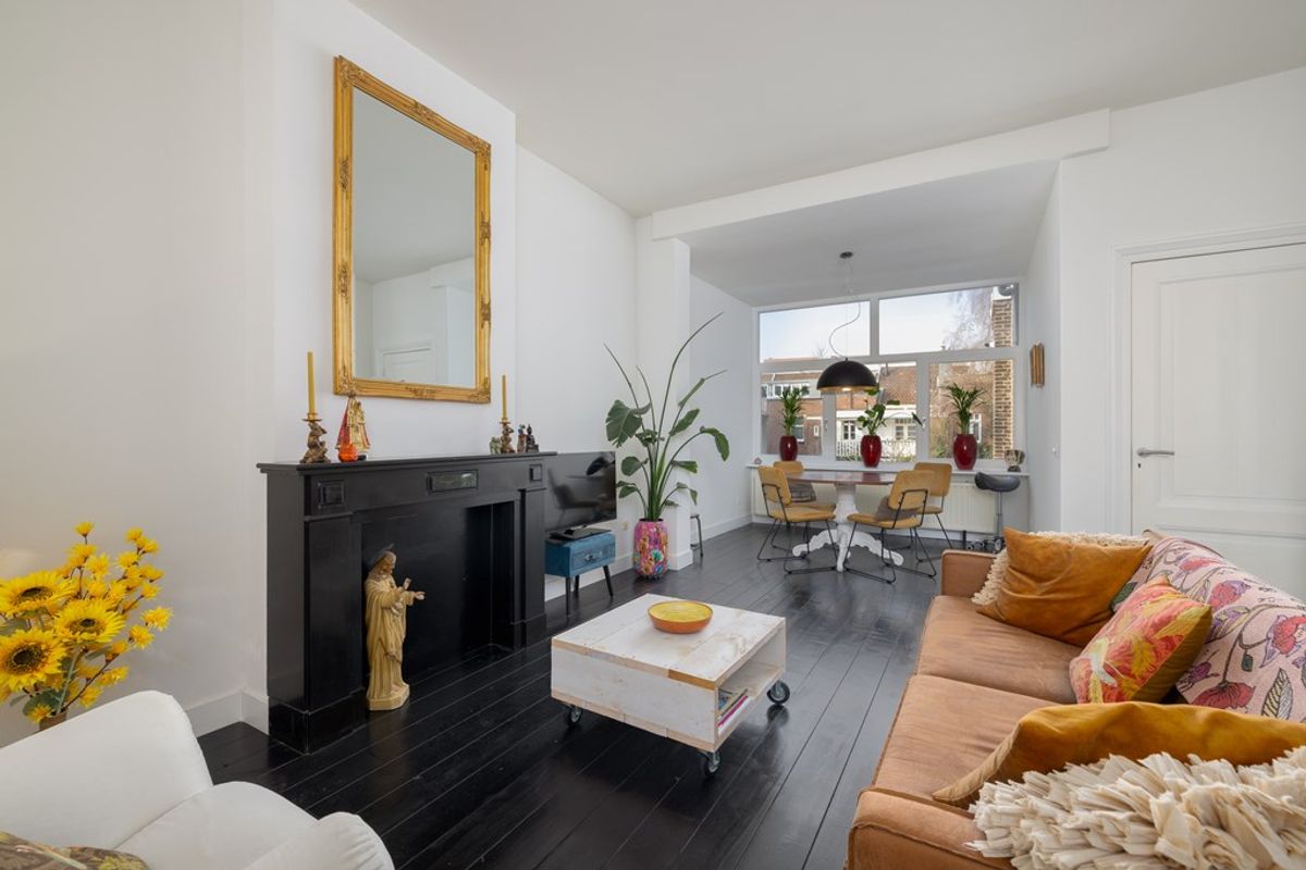Het leefgedeelte bevindt zich aan de achterzijde van de woning en vormt direct het hart van het appartement. De hoge plafonds en grote raampartijen zorgen voor een indrukwekkende lichtinval en versterken het ruimtelijke gevoel. De stijlvolle donkere vloer in combinatie met de klassieke schouw geeft de woonkamer karakter en warmte. Een ruimte die uitnodigt tot ontspannen én ontvangen.