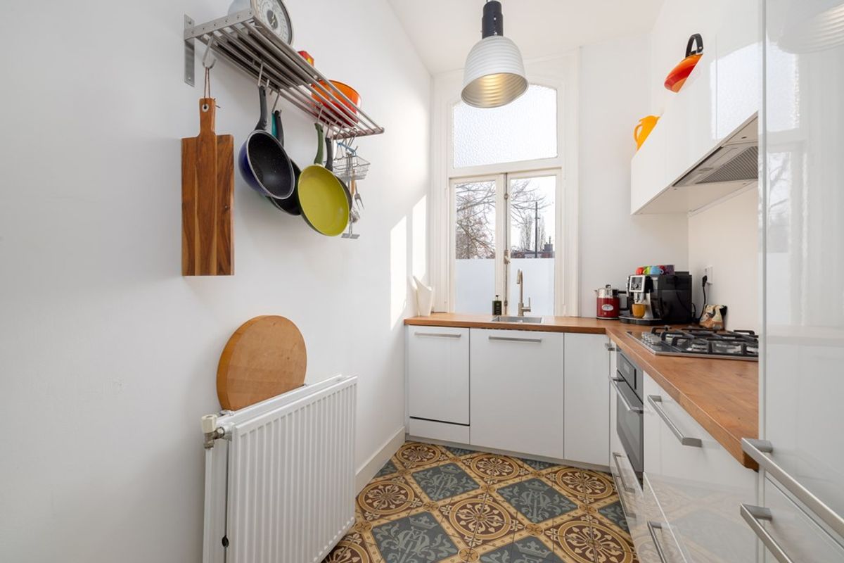 Aansluitend bevindt zich de keuken, praktisch ingericht en voorzien van diverse inbouwapparatuur. De opstelling is efficiënt en biedt voldoende werk- en bergruimte.
