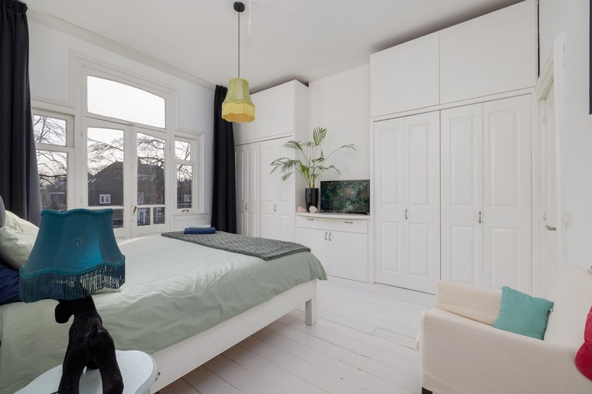 De slaapkamer is rustig gesitueerd en biedt directe toegang tot het balkon. Vanaf hier geniet u van een fraai uitzicht over de Koningsweg een levendig straatbeeld met karakteristieke bebouwing. Een plek waar binnen en buiten subtiel samenkomen en waar u het stadsleven op afstand ervaart.