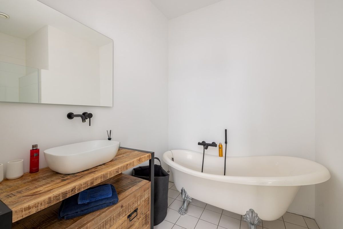 De badkamer combineert strak wit met warme houttinten, wat zorgt voor een moderne maar toch uitnodigende uitstraling. Het vrijstaande ligbad op sierlijke pootjes vormt een echte eyecatcher en geeft de ruimte een vleugje klassieke elegantie. De zwarte kranen en accessoires zorgen daarbij voor een stijlvol en eigentijds contrast.