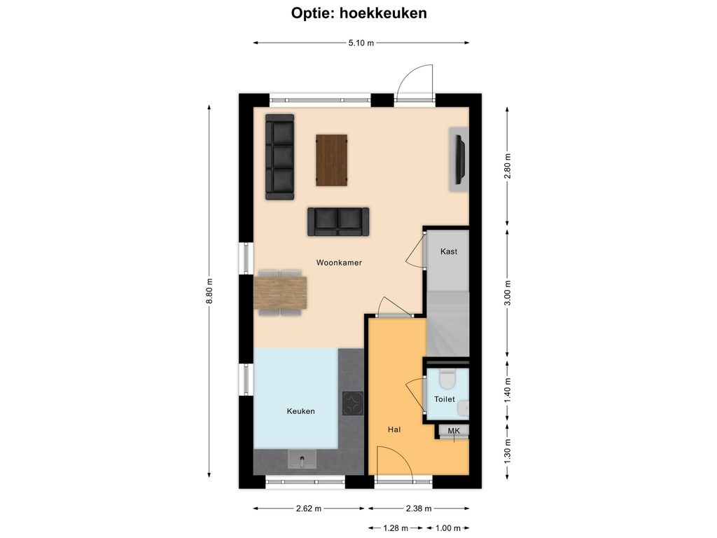 Hal/entree met meterkast en trapopgang naar eerste verdieping, toiletruimte, lichte woonkamer met trapkast en achteringang, open keuken met veel lichtinval.