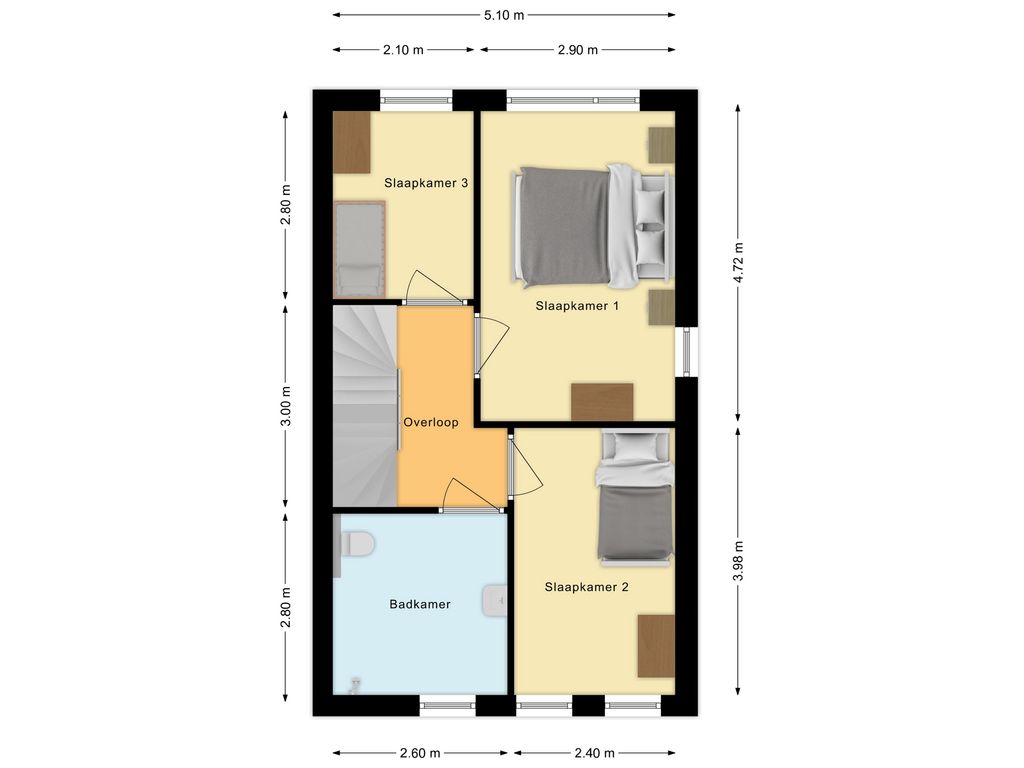 Overloop, trapopgang naar tweede verdieping, 3 ruime slaapkamers, badkamer.