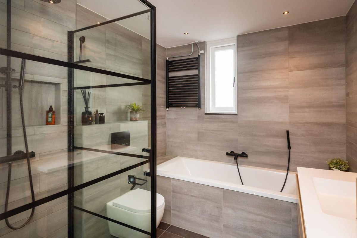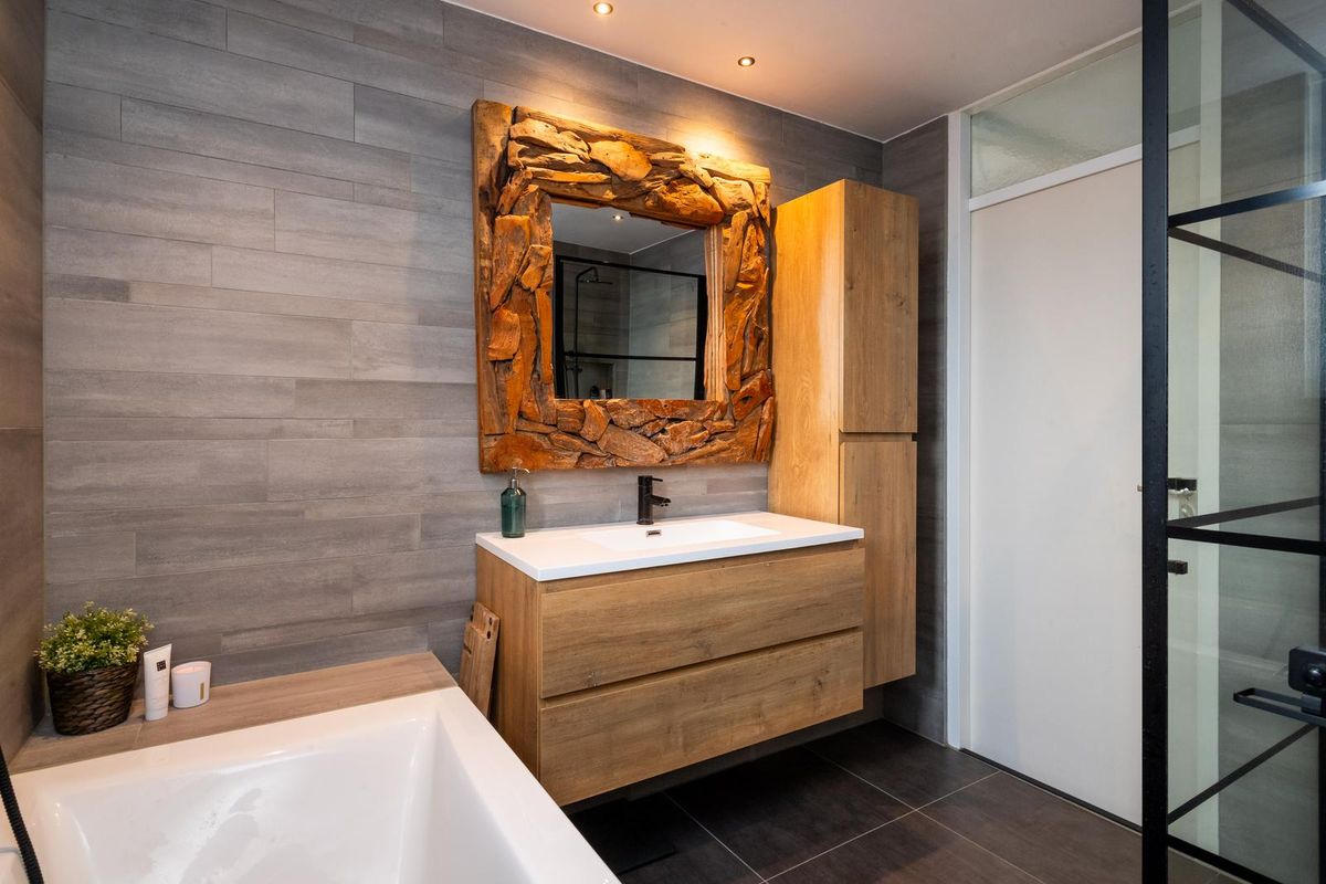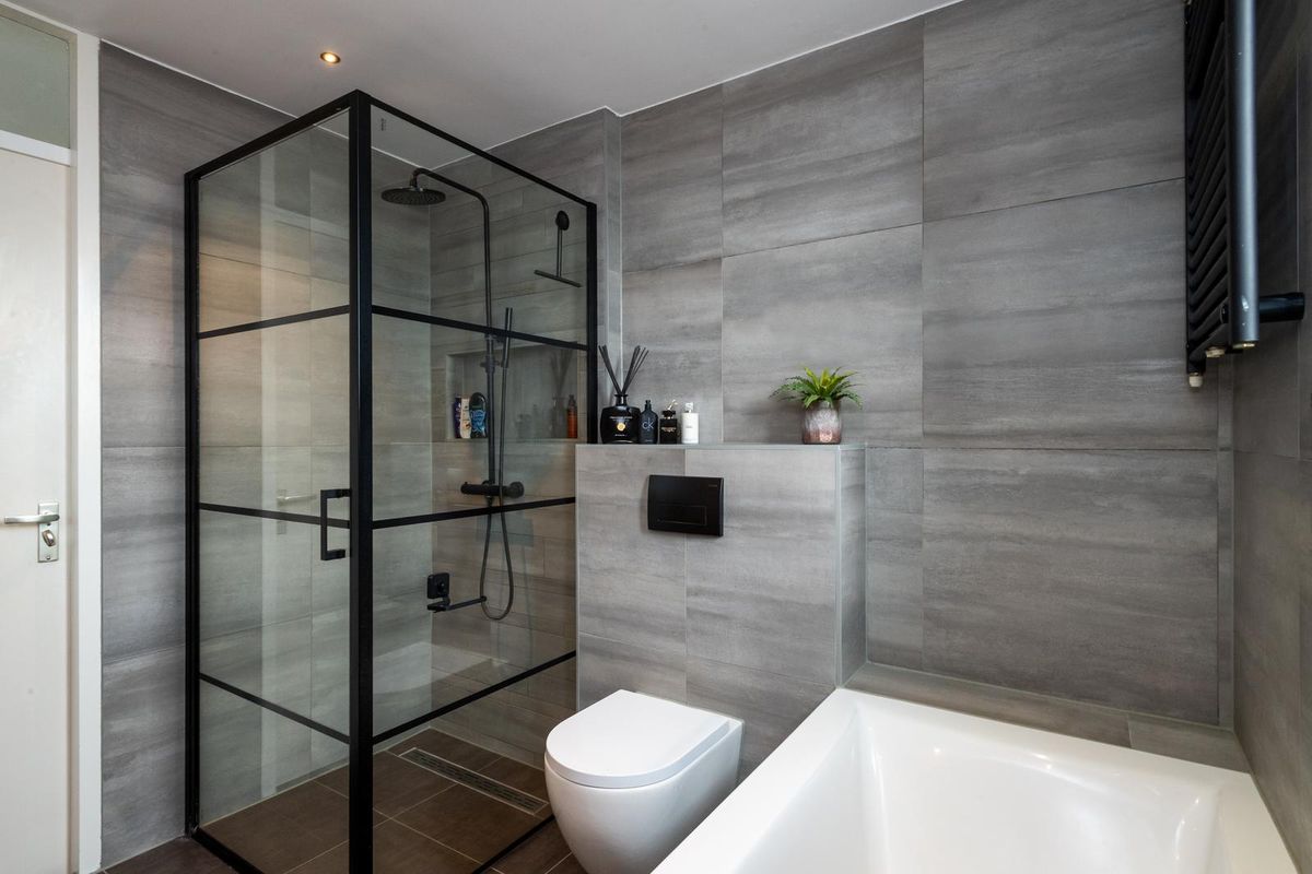 Zeer fraaie badkamer (2020) met zwarte accenten en voorzien van een ligbad met een zwarte thermostaatkraan en -handdouche, douche met met dito kraan, een regendouche en handdouche, brede wastafel met wastafelmeubel met kolomkast, een mooie spiegel met een robuuste sfeervolle lijst, handdoekenradiator, 2e toilet en inbouwspots.